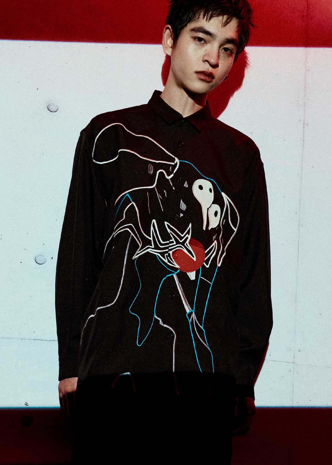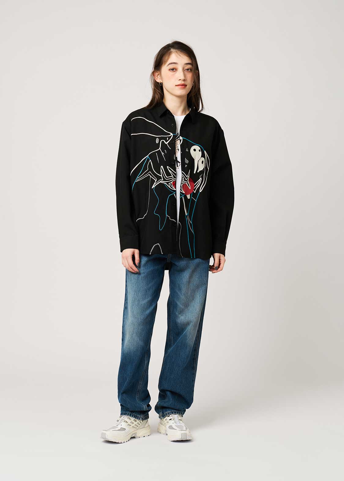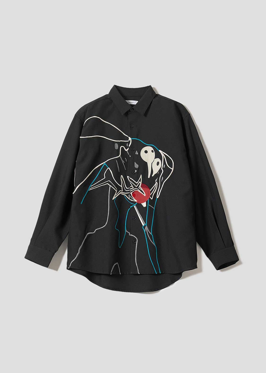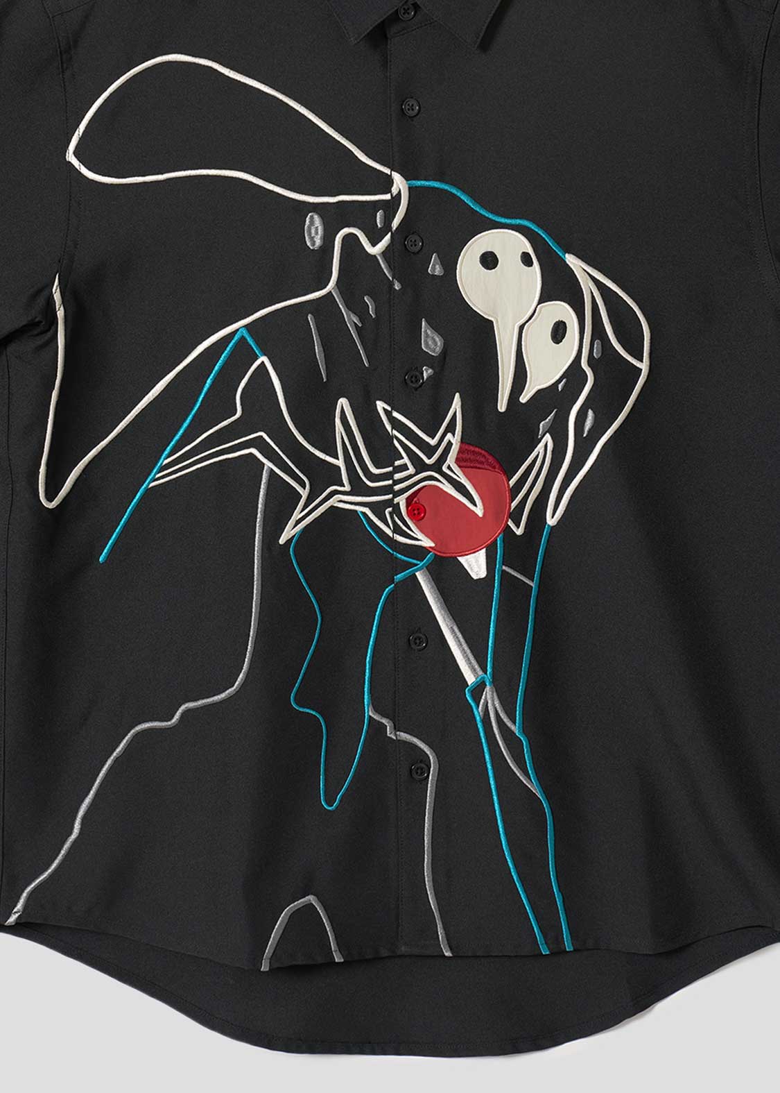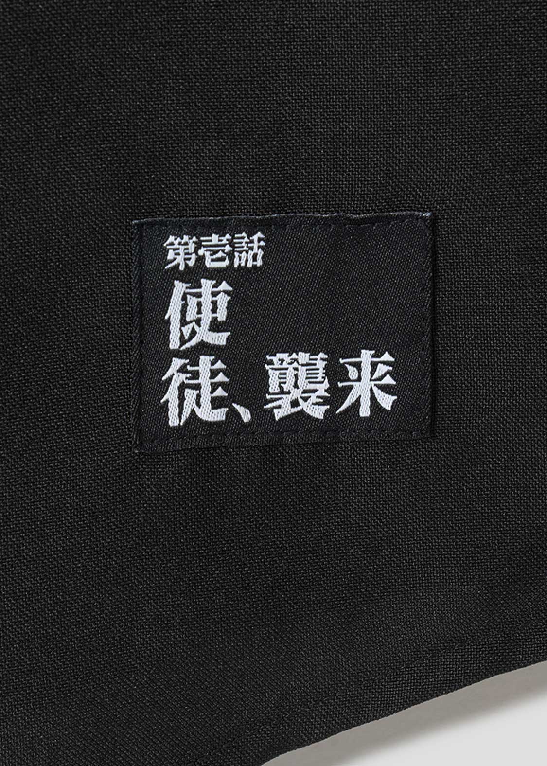 第壱話「使徒、襲来」より。線画にした第3使徒サキエルを大胆に刺繍とアップリケで表現したインパクトのあるデザイン。バックの裾にはタイトルの織りネームがあしらわれています。EMERGENCYのマークを模したボタンがポイントです。
