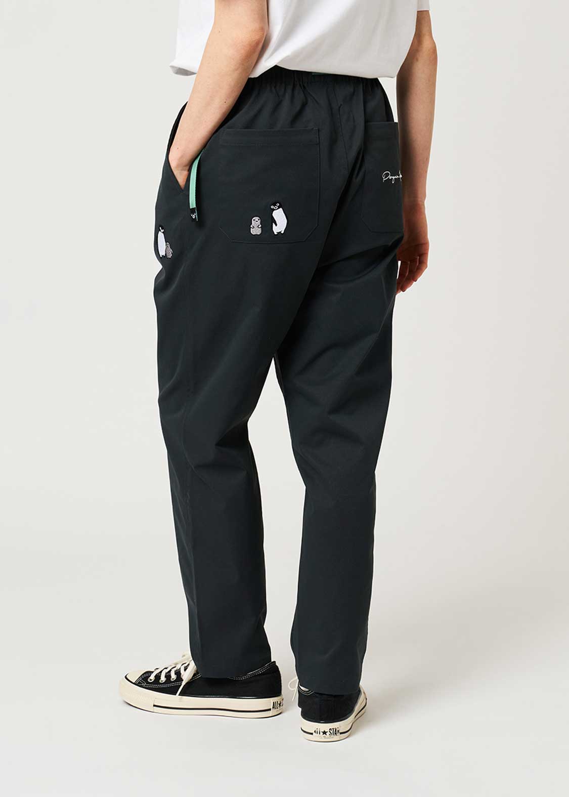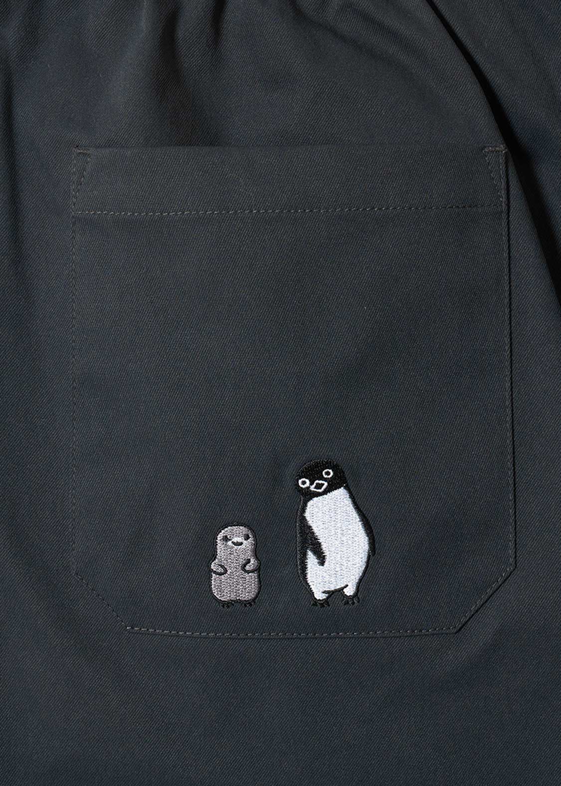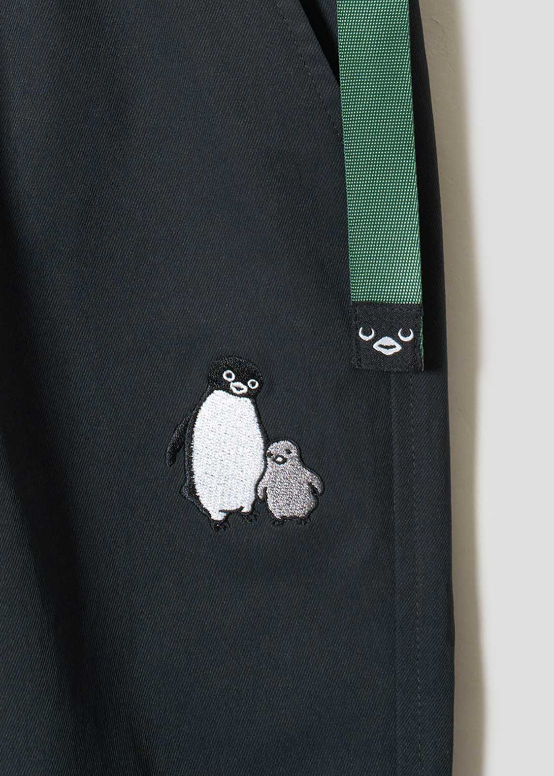 フロントはペンギンとヒナペンギンが寄り添う姿、バックはペンギンの後を付いてくるヒナペンギンの微笑ましい様子を刺繍しました。ベルトの先にあしらわれたペンギンの顔の織りネームがポイントです。