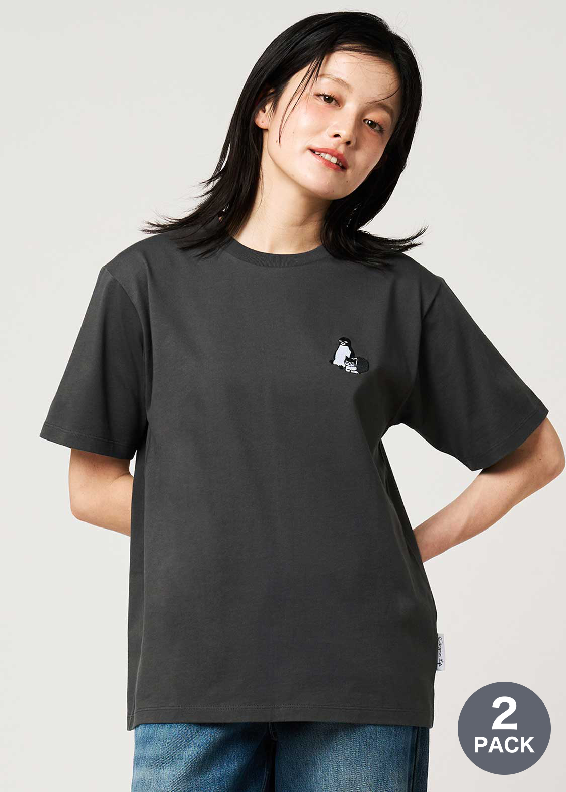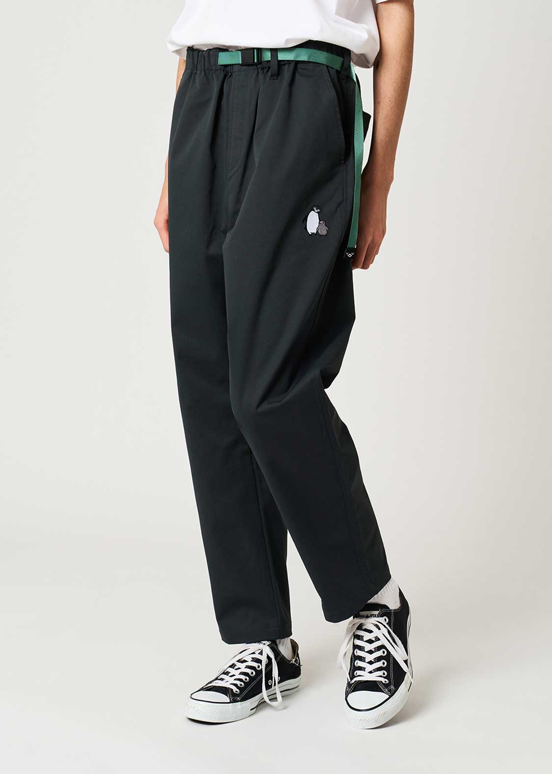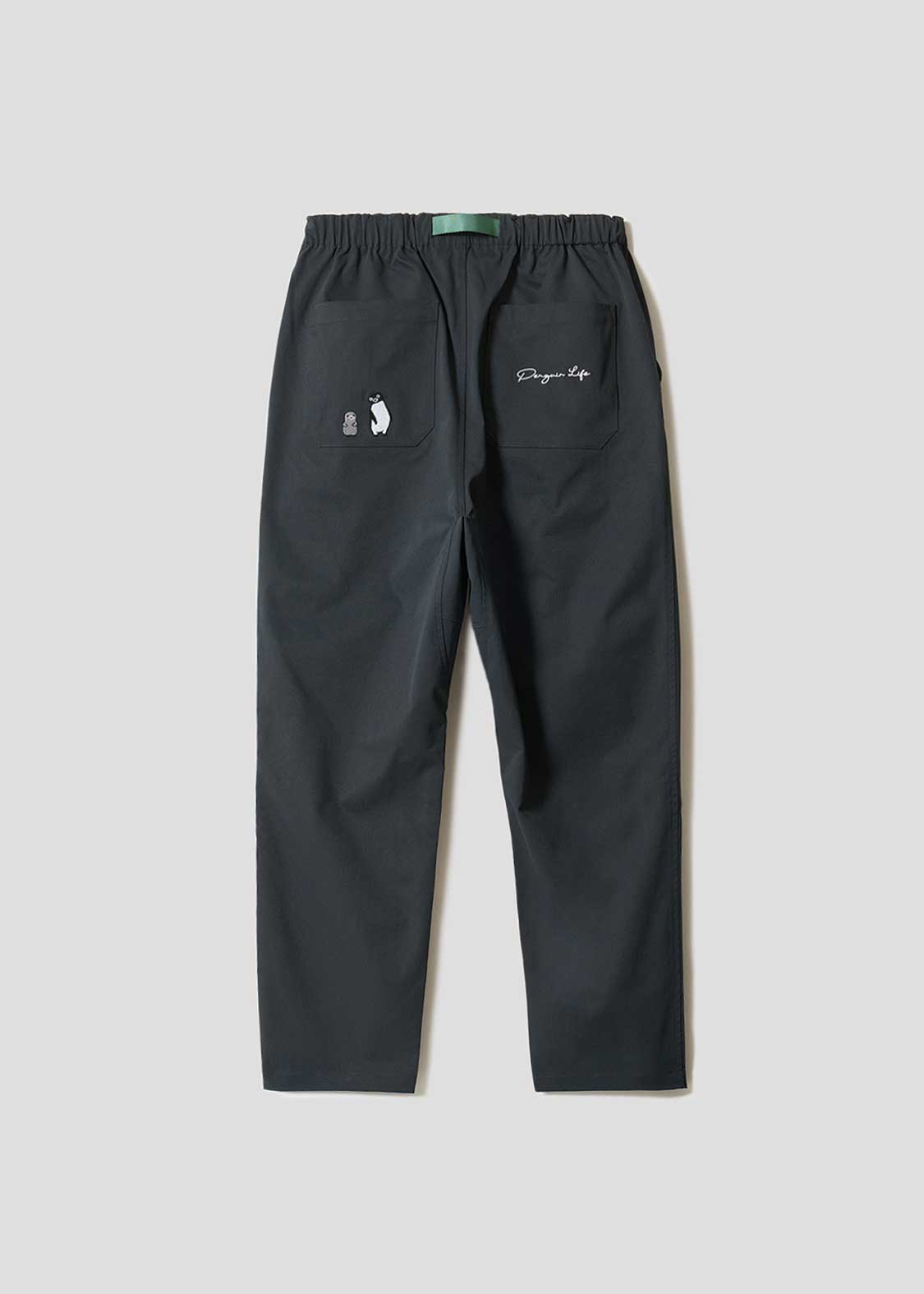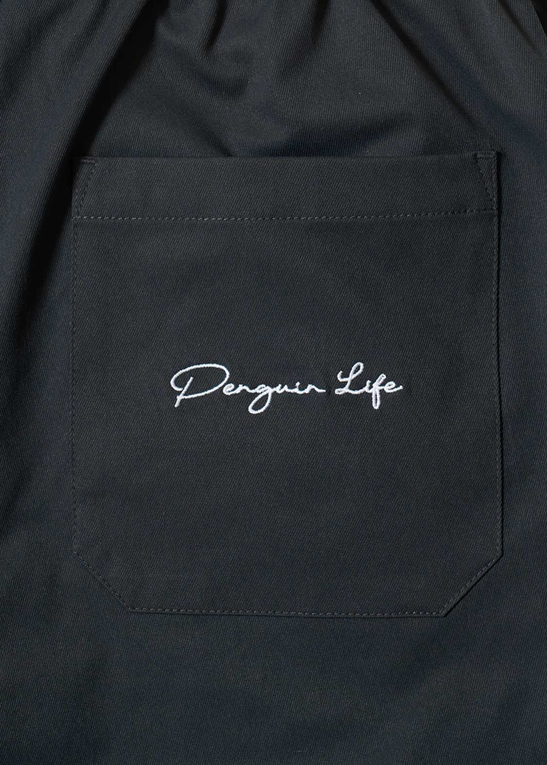 フロントはペンギンとヒナペンギンが寄り添う姿、バックはペンギンの後を付いてくるヒナペンギンの微笑ましい様子を刺繍しました。ベルトの先にあしらわれたペンギンの顔の織りネームがポイントです。