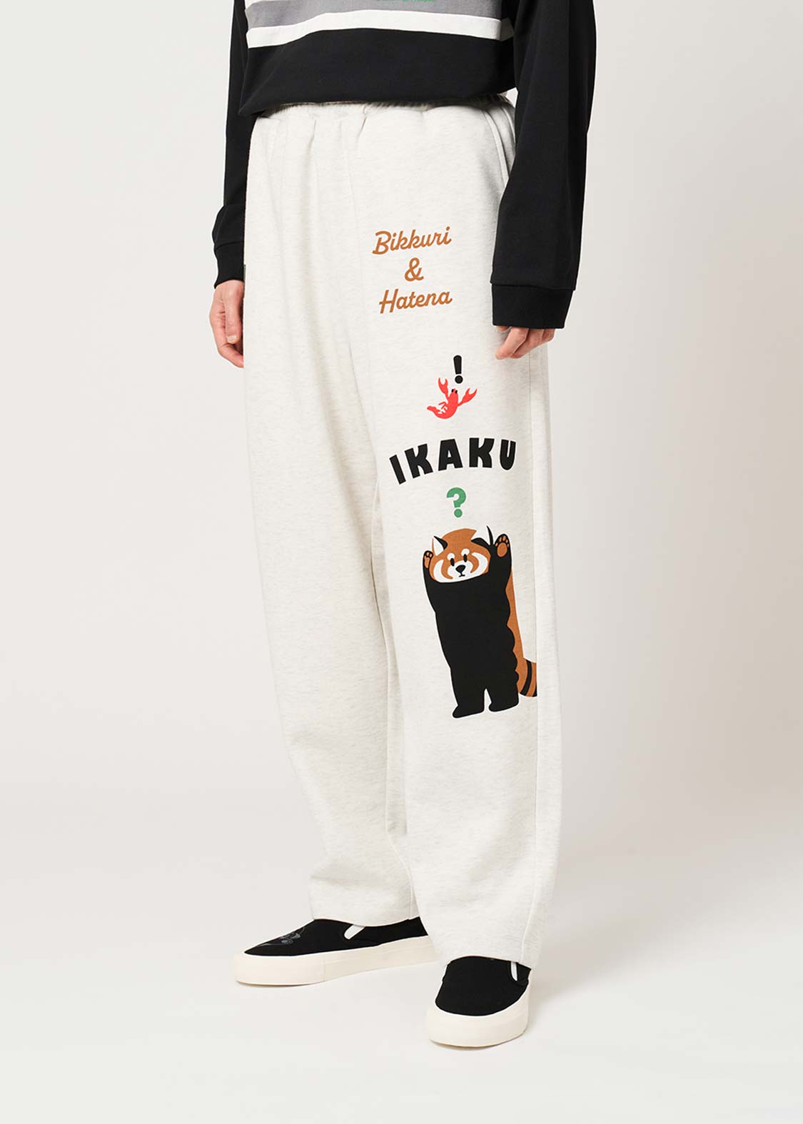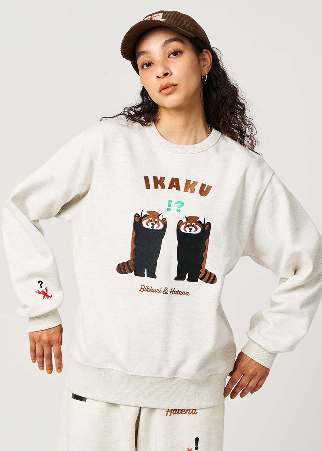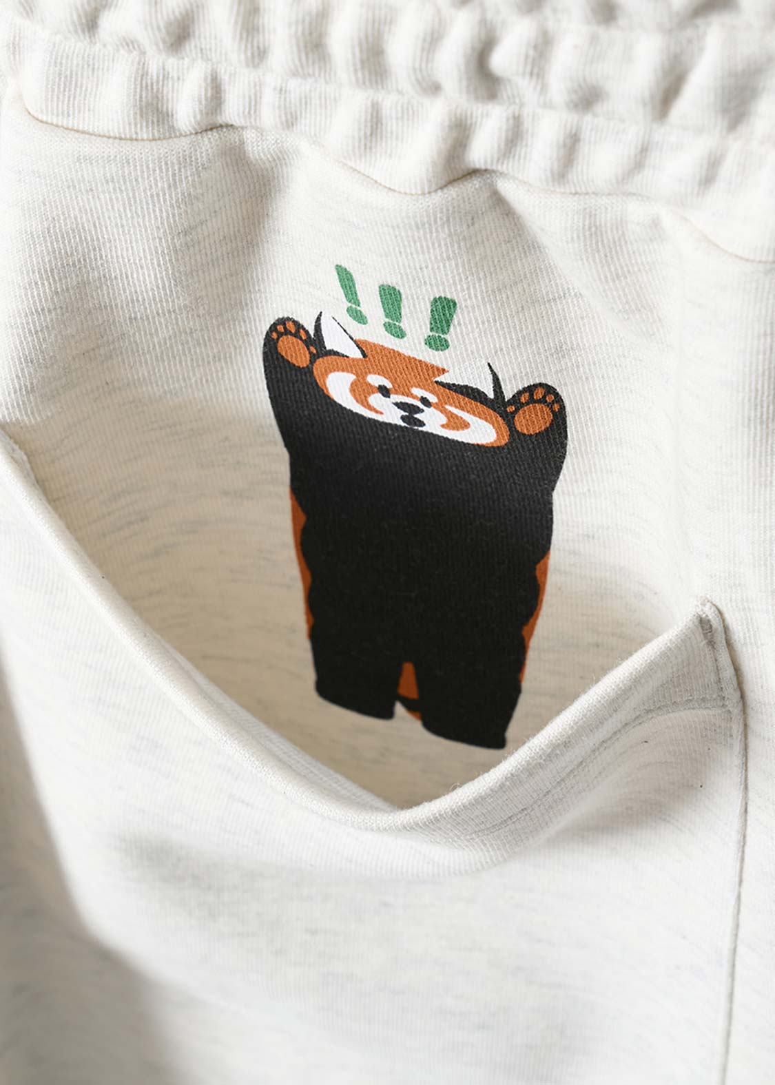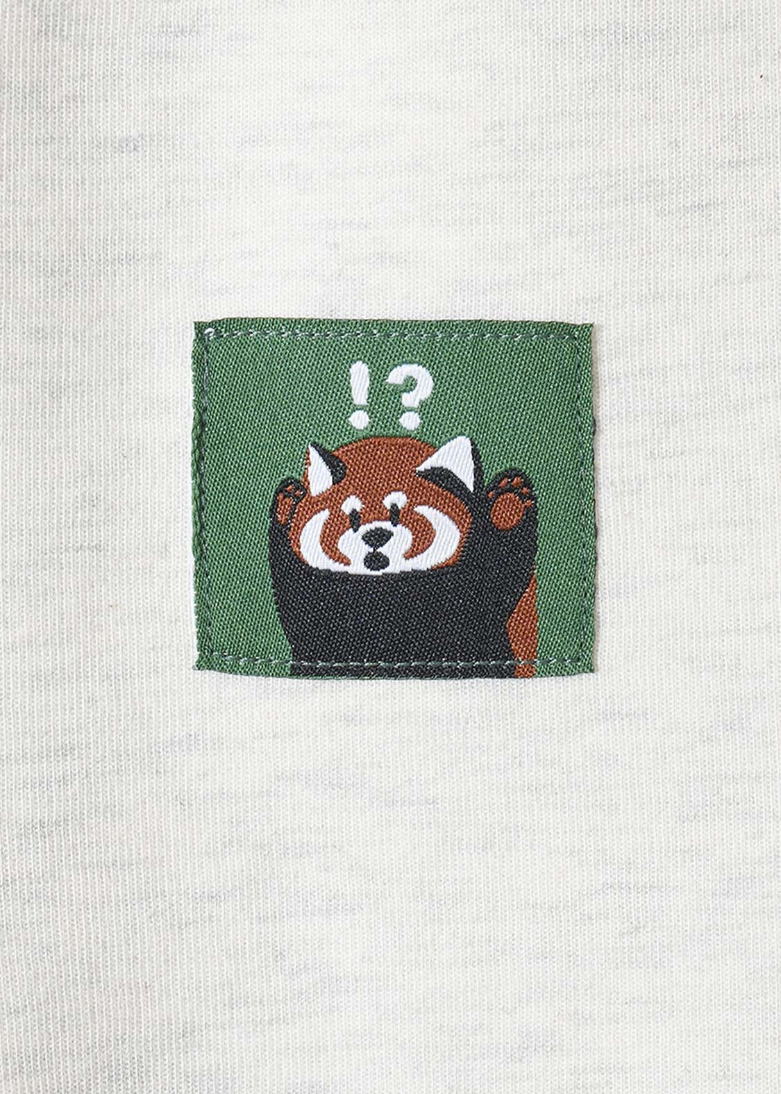 レッサーパンダの「?」と「!」の表情を、遊び心たっぷりにデザイン。ちょっとしたリアクションを切り取った、!?マークがアクセントのグラフィックです。