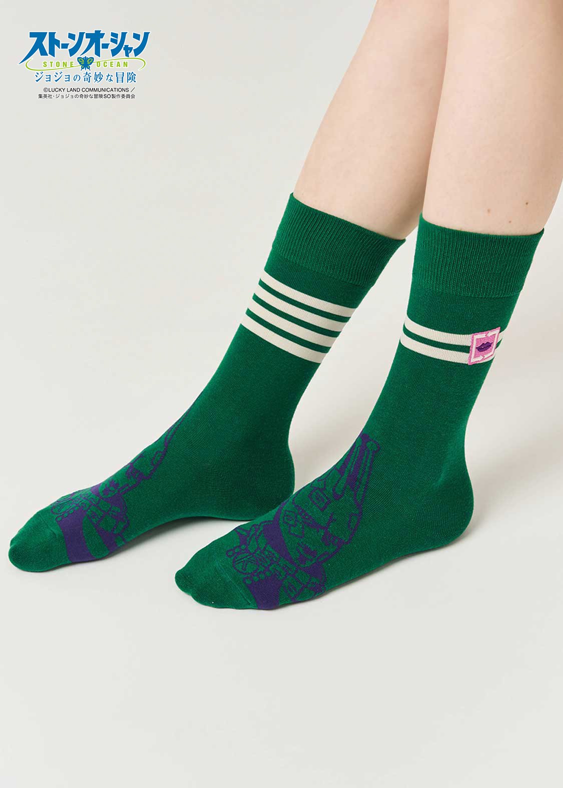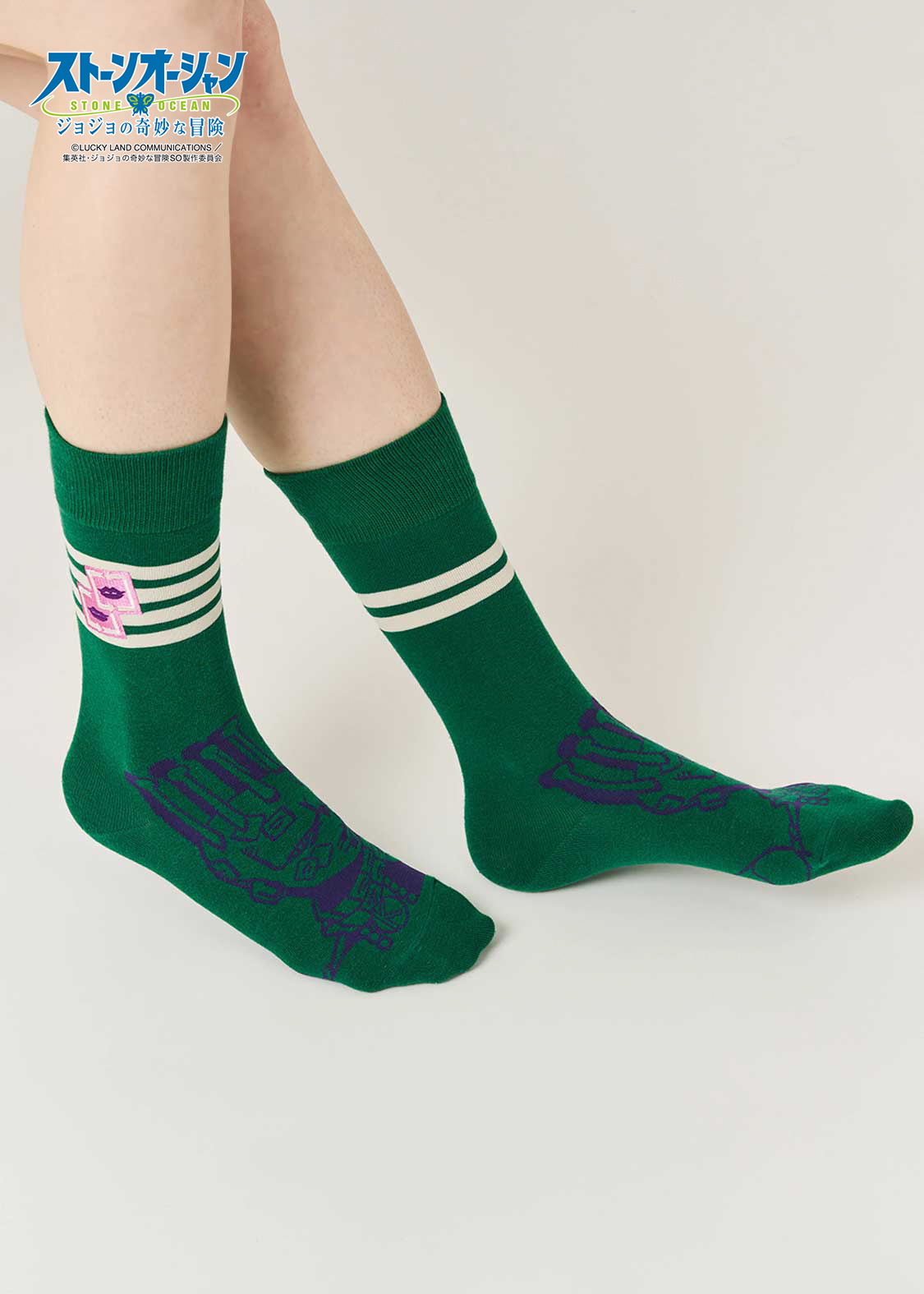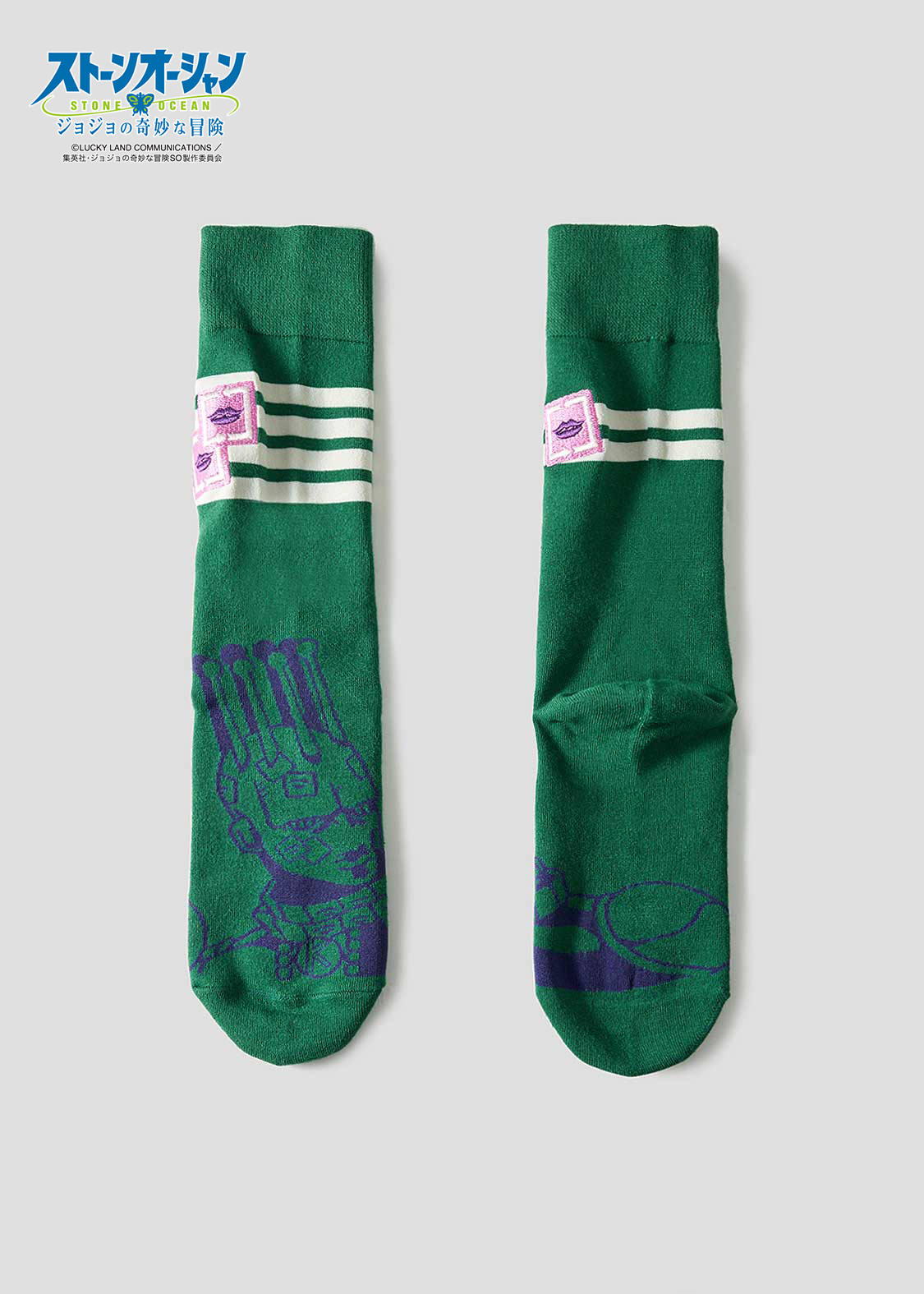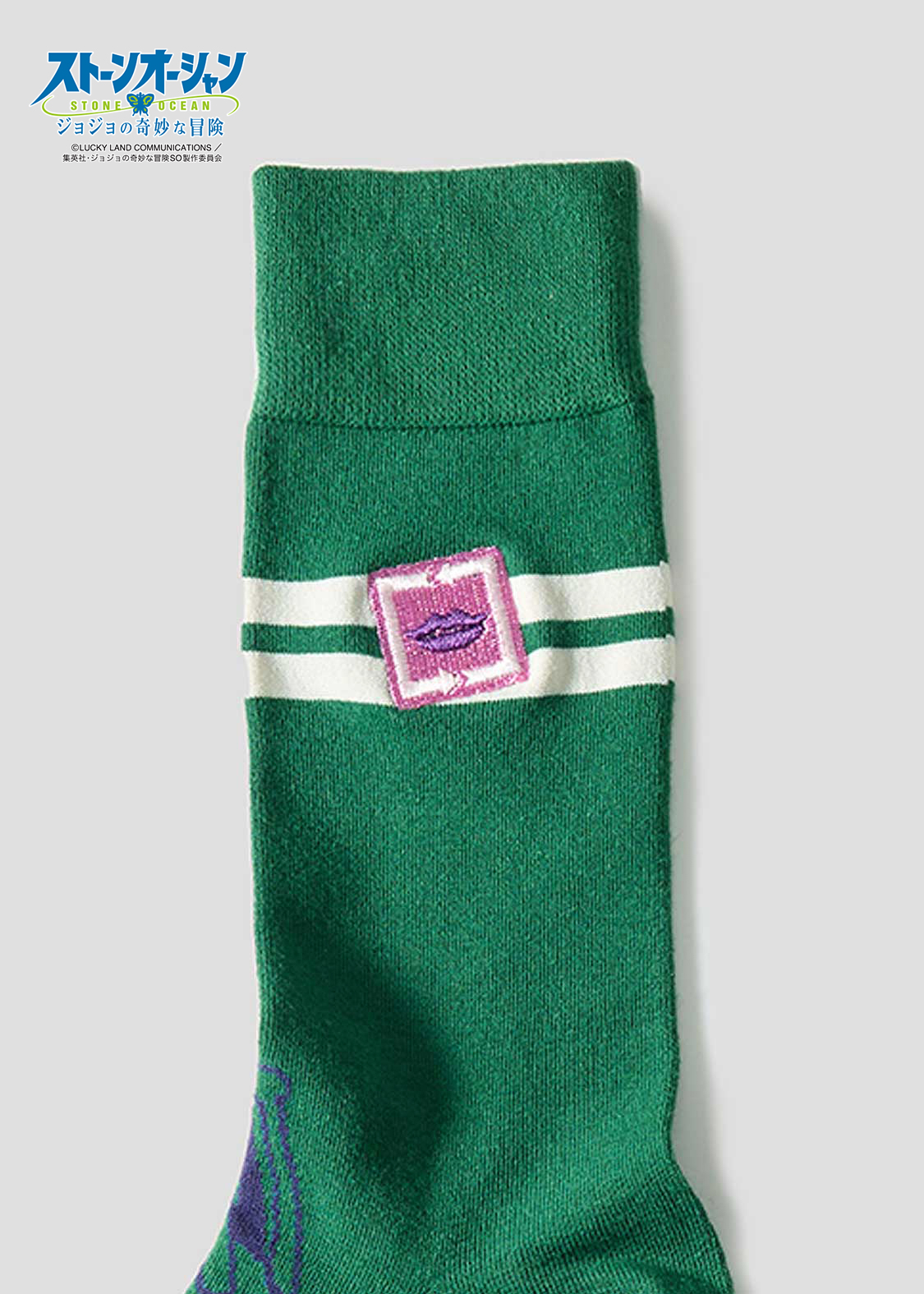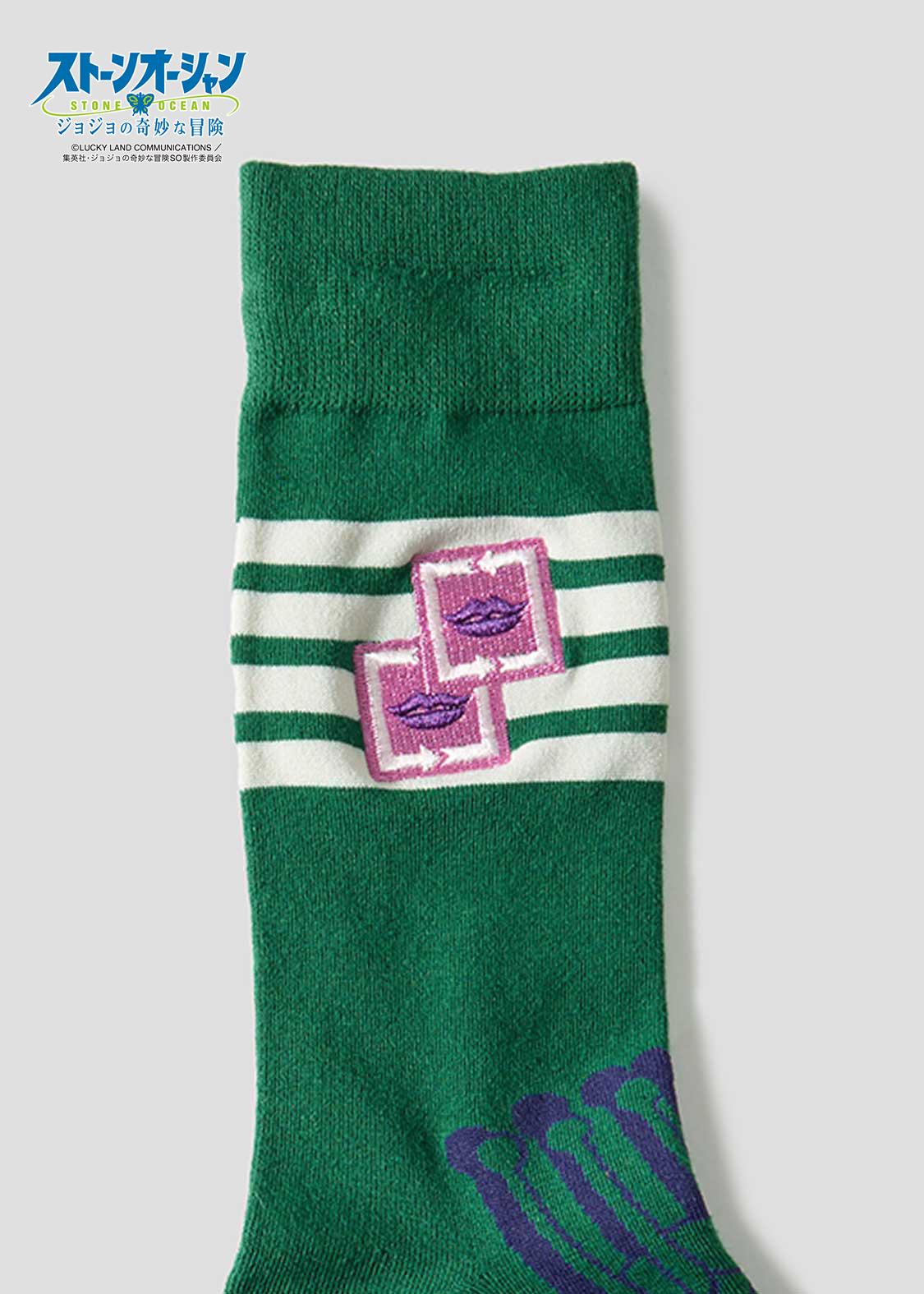 アニメ『ジョジョの奇妙な冒険 ストーンオーシャン』より。エルメェス・コステロのスタンド「キッス」をジャカードで表現したデザイン。スタンドの能力をイメージしたシールを刺繍であしらいました。