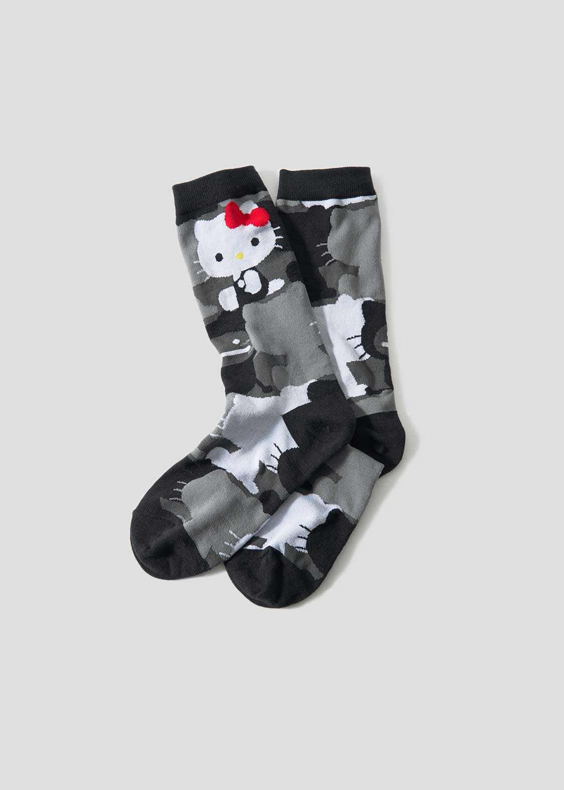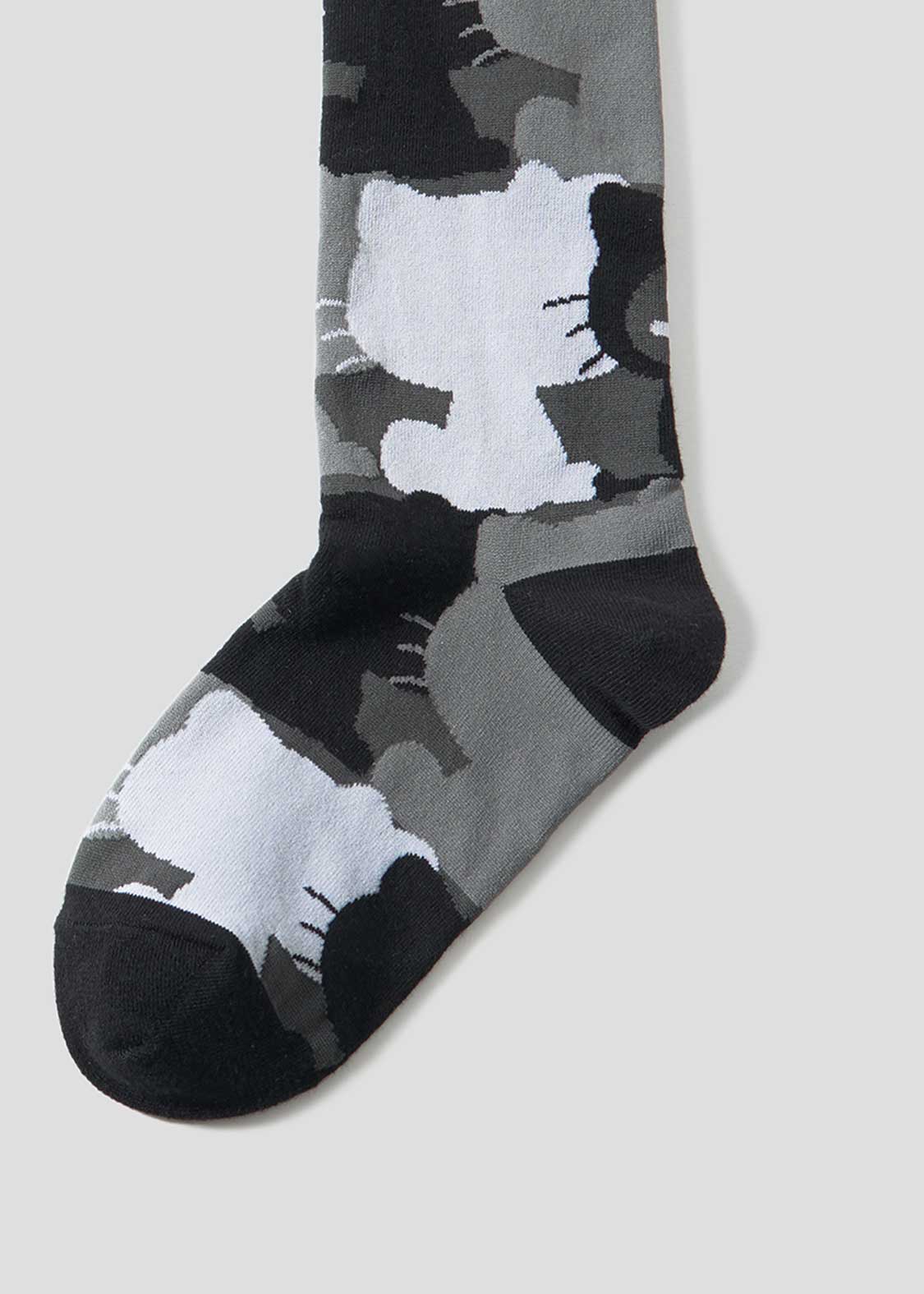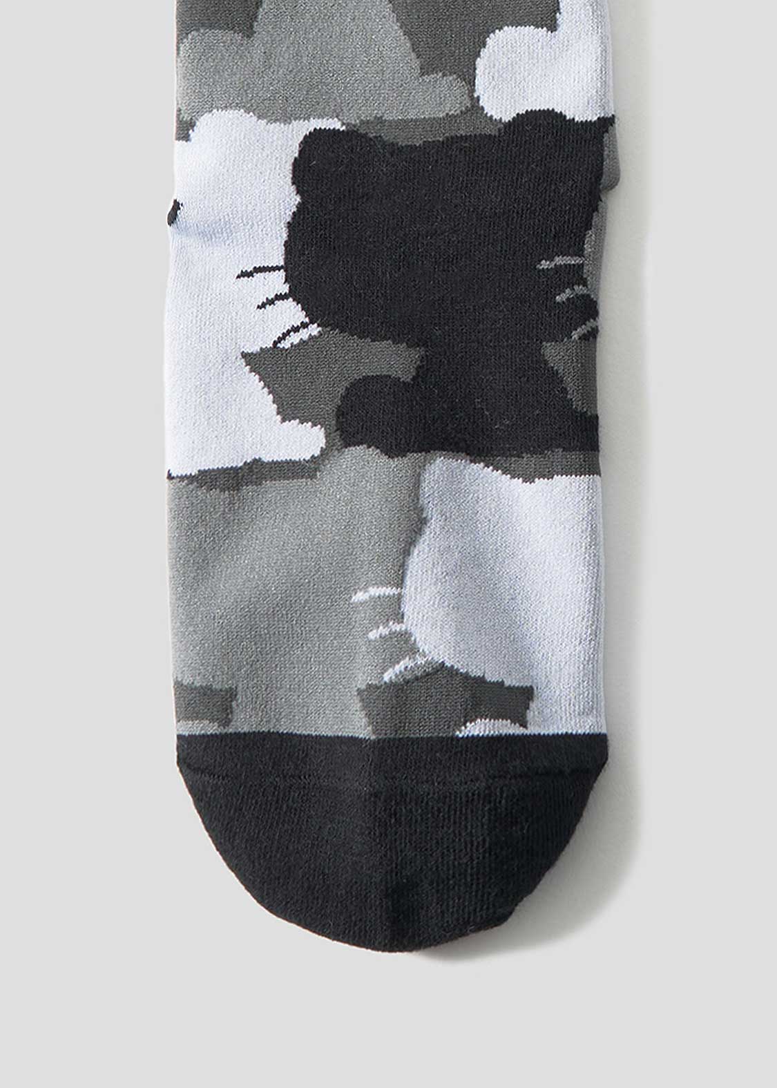 ハローキティのシルエットパターンをジャカード編みで表現したデザイン。リボンとお鼻に色が付いたハローキティがポイントです。ハローキティのきぐるみを着たビューティフルシャドーが紛れているので探してみてね!
