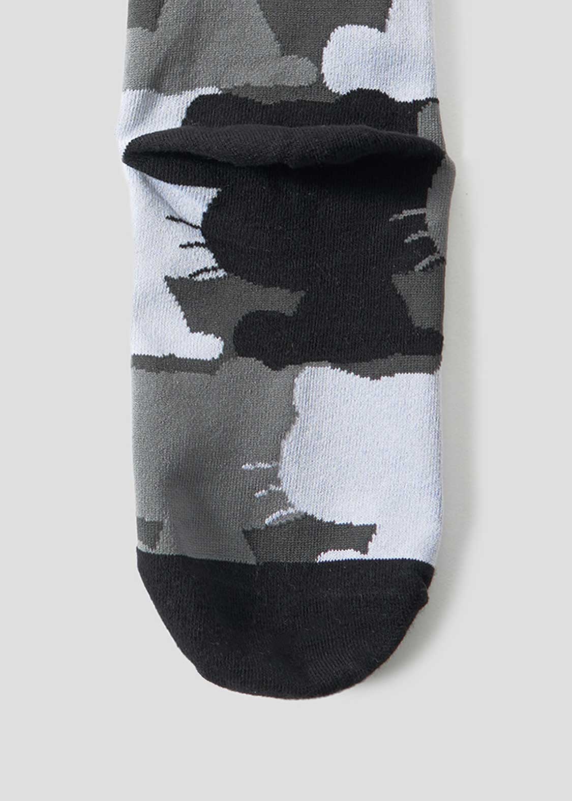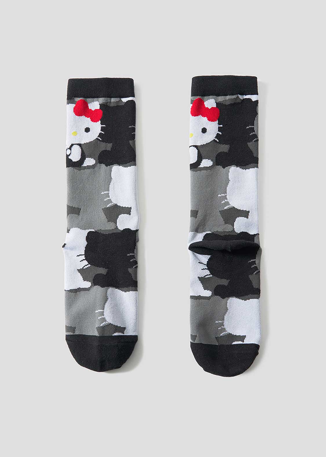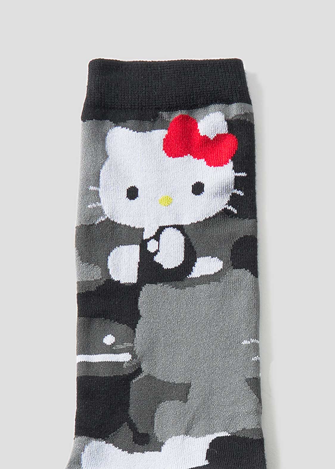 ハローキティのシルエットパターンをジャカード編みで表現したデザイン。リボンとお鼻に色が付いたハローキティがポイントです。ハローキティのきぐるみを着たビューティフルシャドーが紛れているので探してみてね!