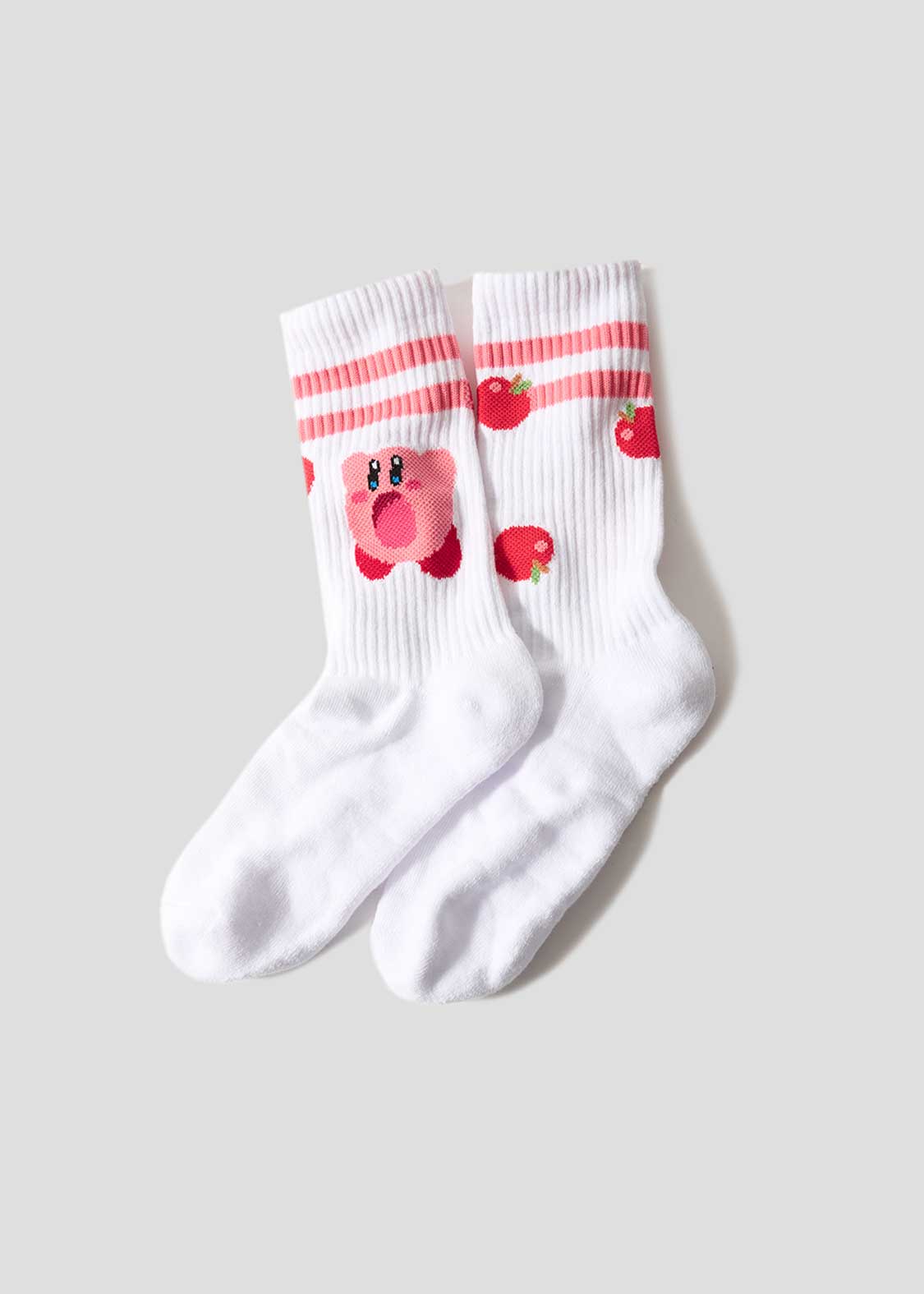 りんごを吸い込んでぷくぷくになったカービィをジャカード編みで表現したデザインです。