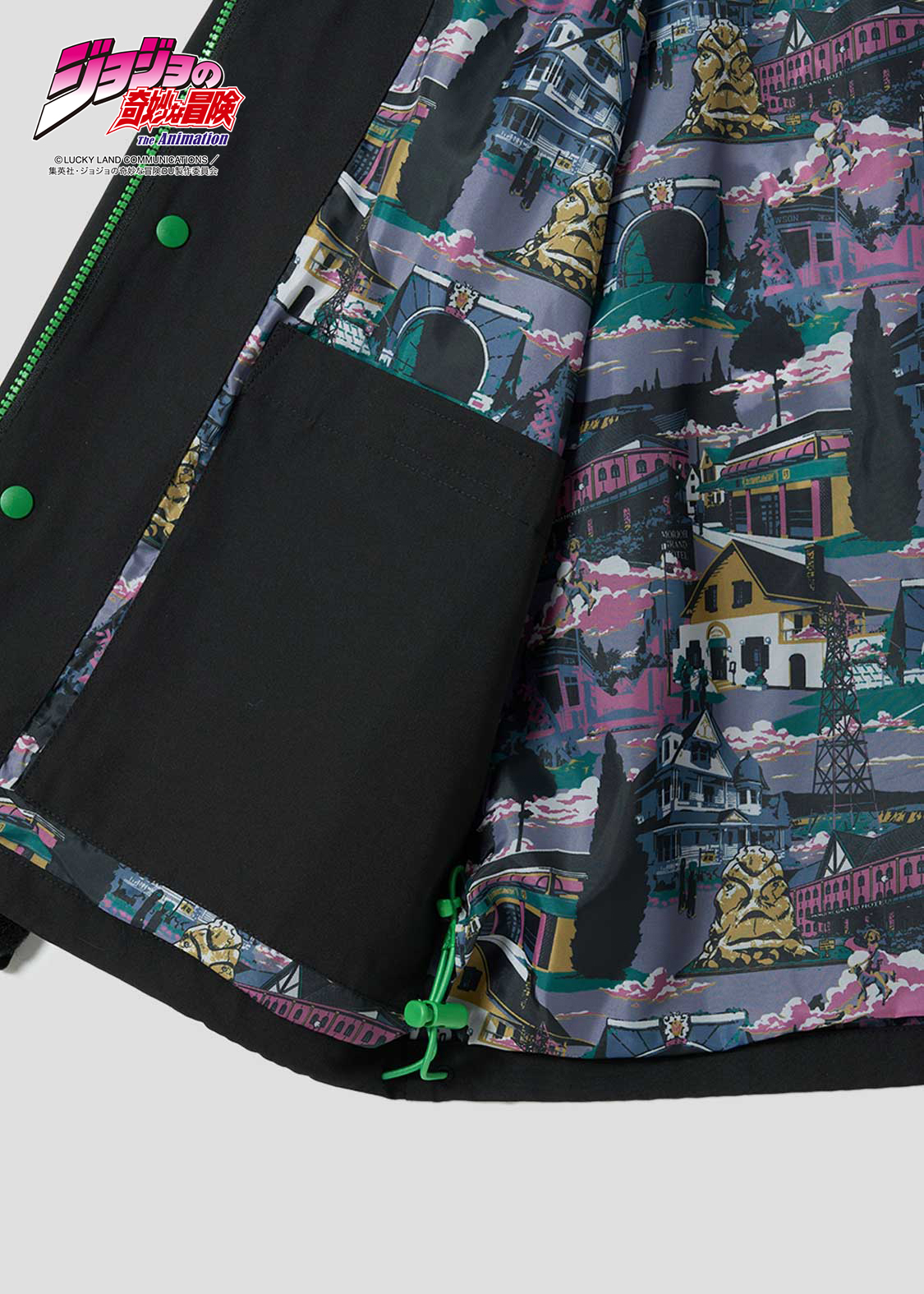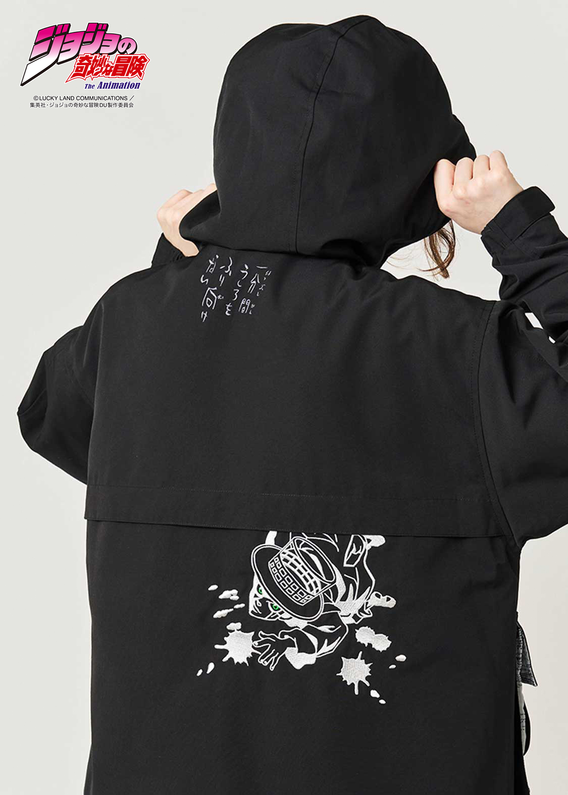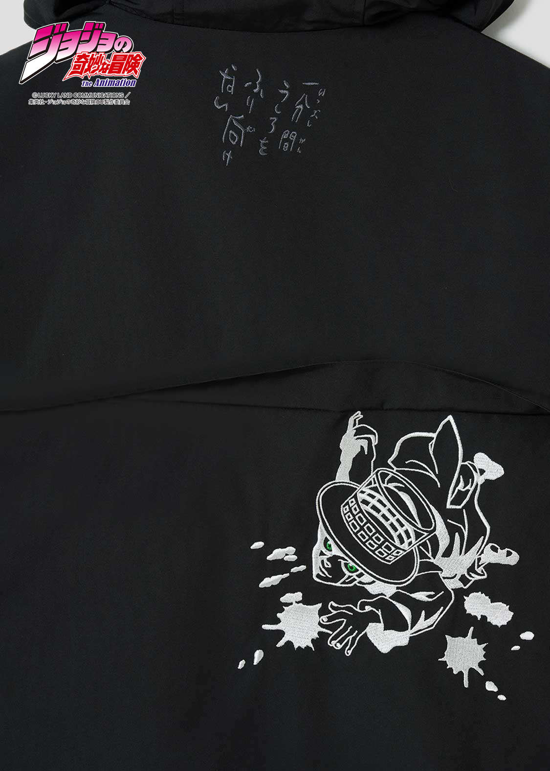 アニメ『ジョジョの奇妙な冒険 ダイヤモンドは砕けない』より。岸辺露伴のスタンド「ヘブンズ・ドアー」をバックに刺繍しました。攻撃されている様子を表現したデザインです。フードやポケットのフラップをめくってみてください。ポケットに刺繍されたGペンや、杜王町のロゴマークの織りネームもポイント。内側は杜王町のパターン柄になっています。
