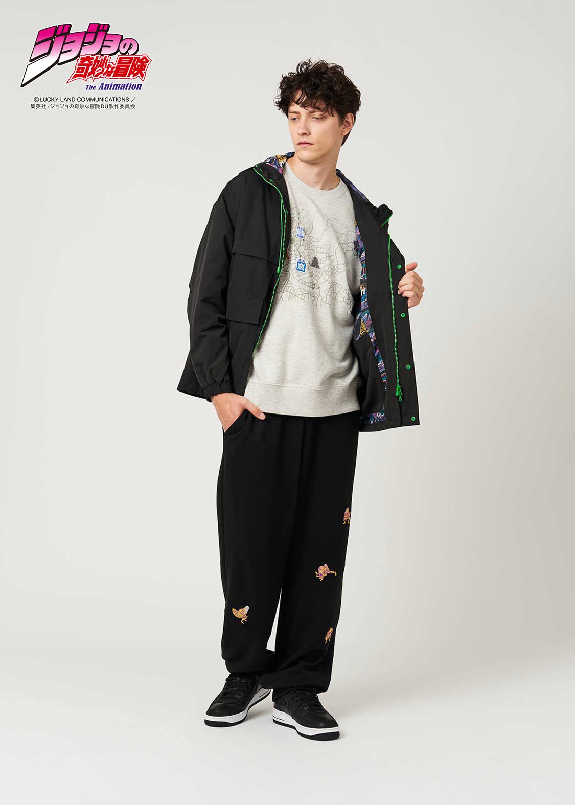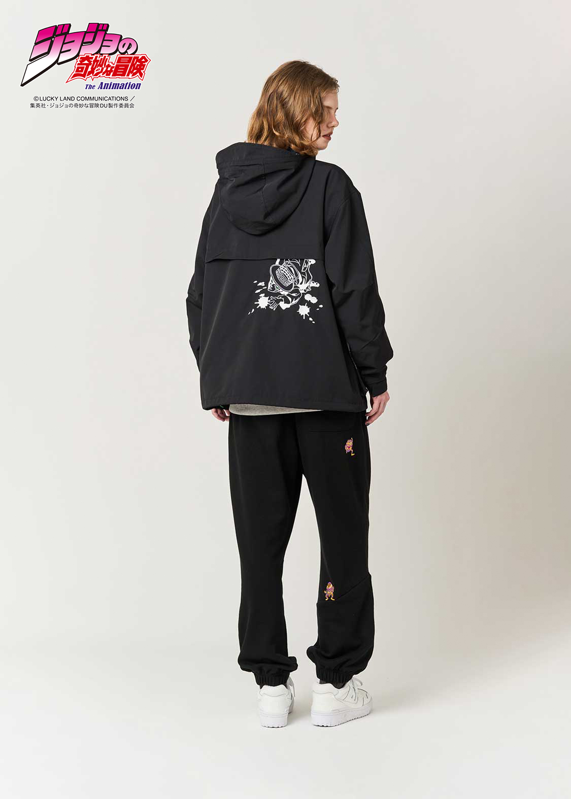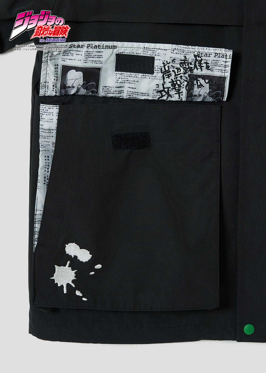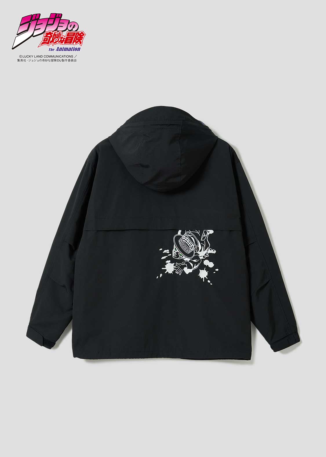 アニメ『ジョジョの奇妙な冒険 ダイヤモンドは砕けない』より。岸辺露伴のスタンド「ヘブンズ・ドアー」をバックに刺繍しました。攻撃されている様子を表現したデザインです。フードやポケットのフラップをめくってみてください。ポケットに刺繍されたGペンや、杜王町のロゴマークの織りネームもポイント。内側は杜王町のパターン柄になっています。