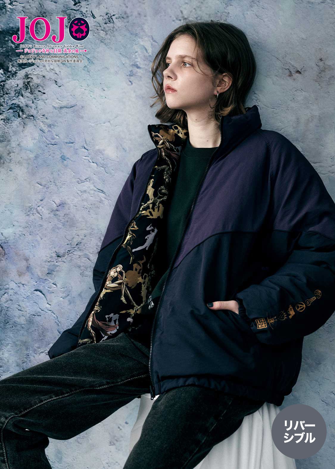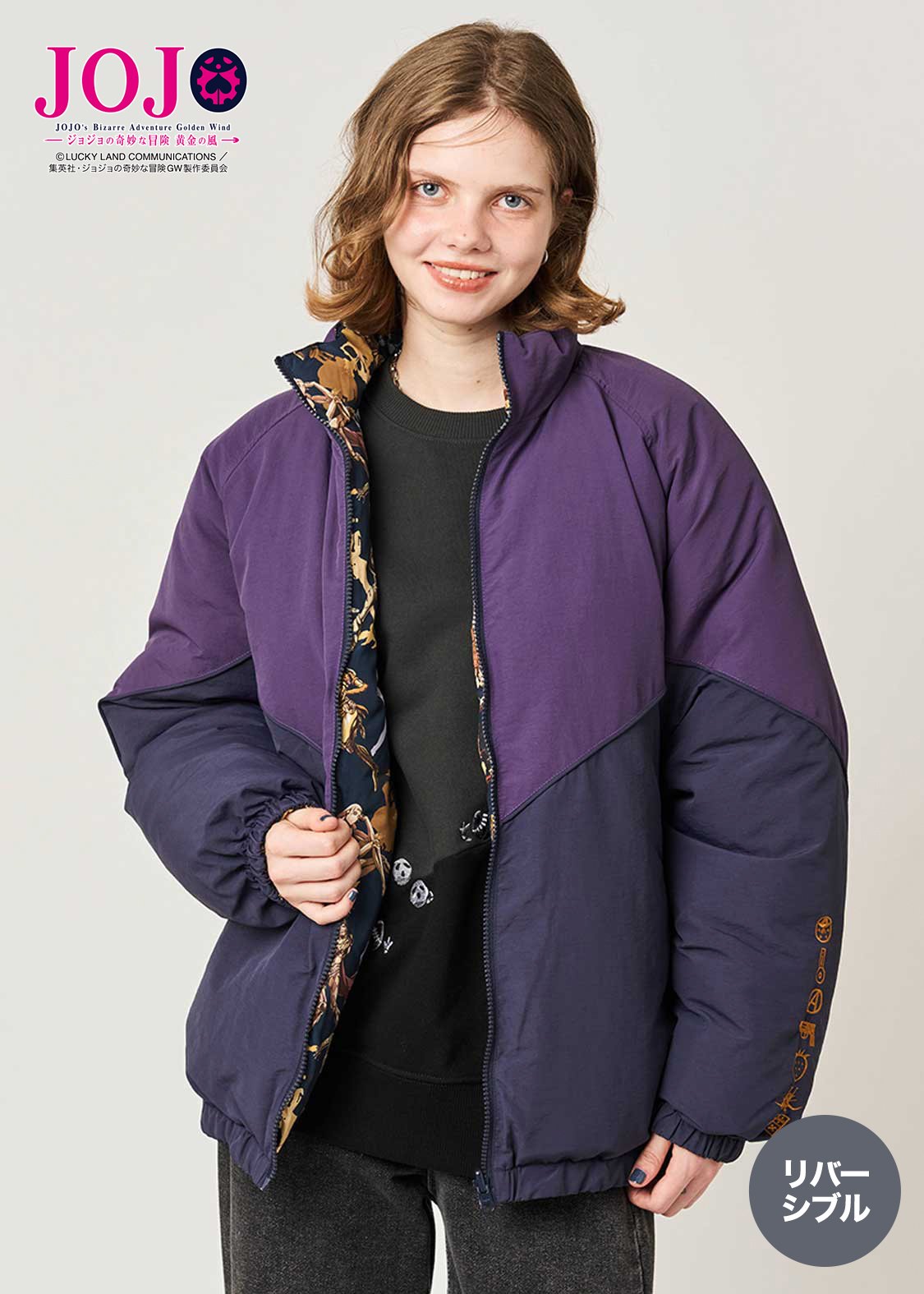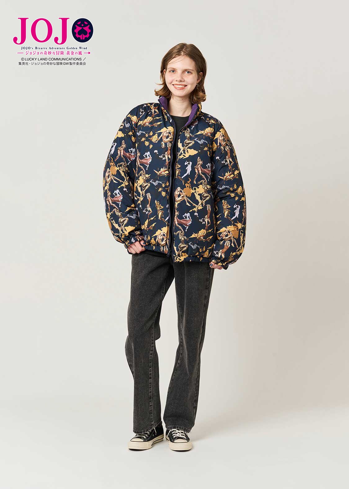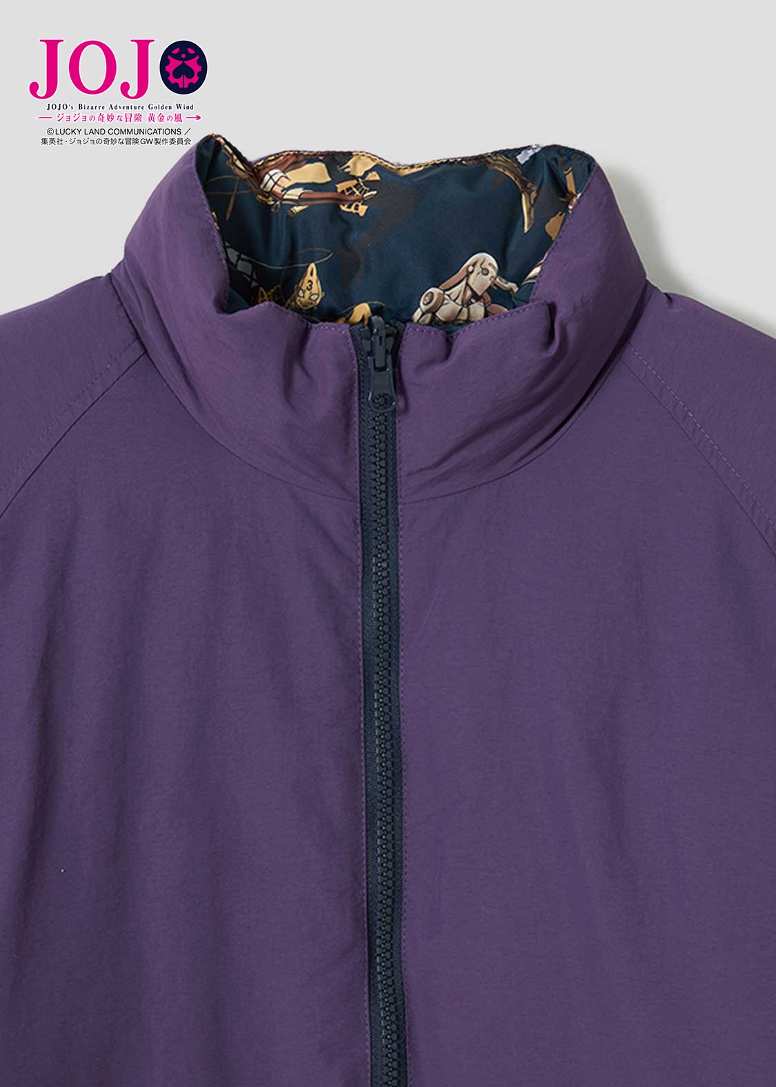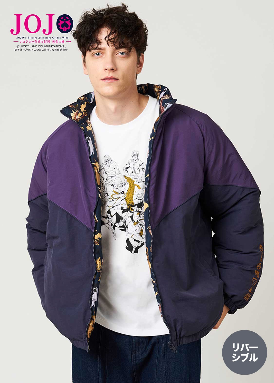 アニメ『ジョジョの奇妙な冒険 黄金の風』より。ギャング組織「パッショーネ」の「ブチャラティチーム」と護衛対象のトリッシュをモチーフにしました。左袖にそれぞれのモチーフを刺繍であしらったシンプルなデザインと、彼らとそのスタンドを散りばめたゴージャスなパターン柄のリバーシブル仕様です。