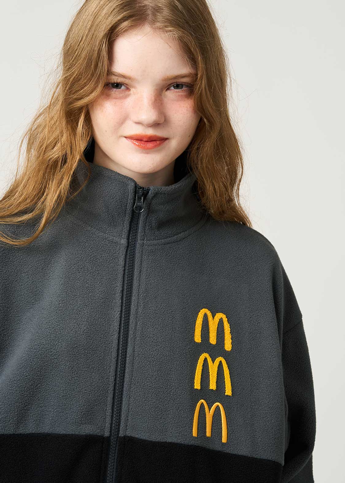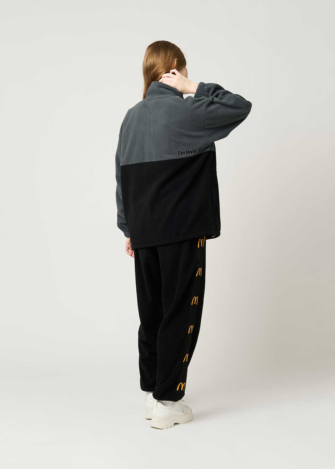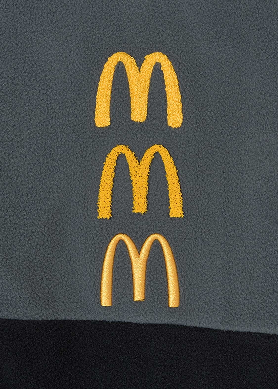 それぞれ手法の違う刺繍で表現したゴールデンアーチが目を引くデザイン。バックには全世界のマクドナルドで共通のキャンペーンフレーズ「i’m lovin’ it」が刺繍されています。