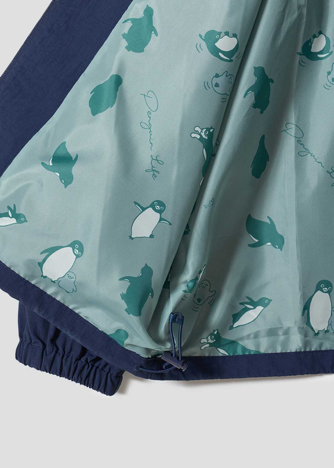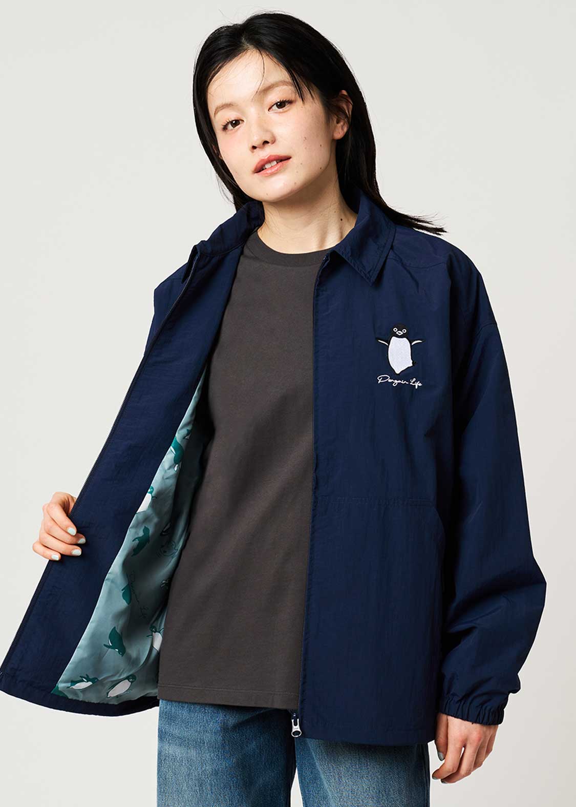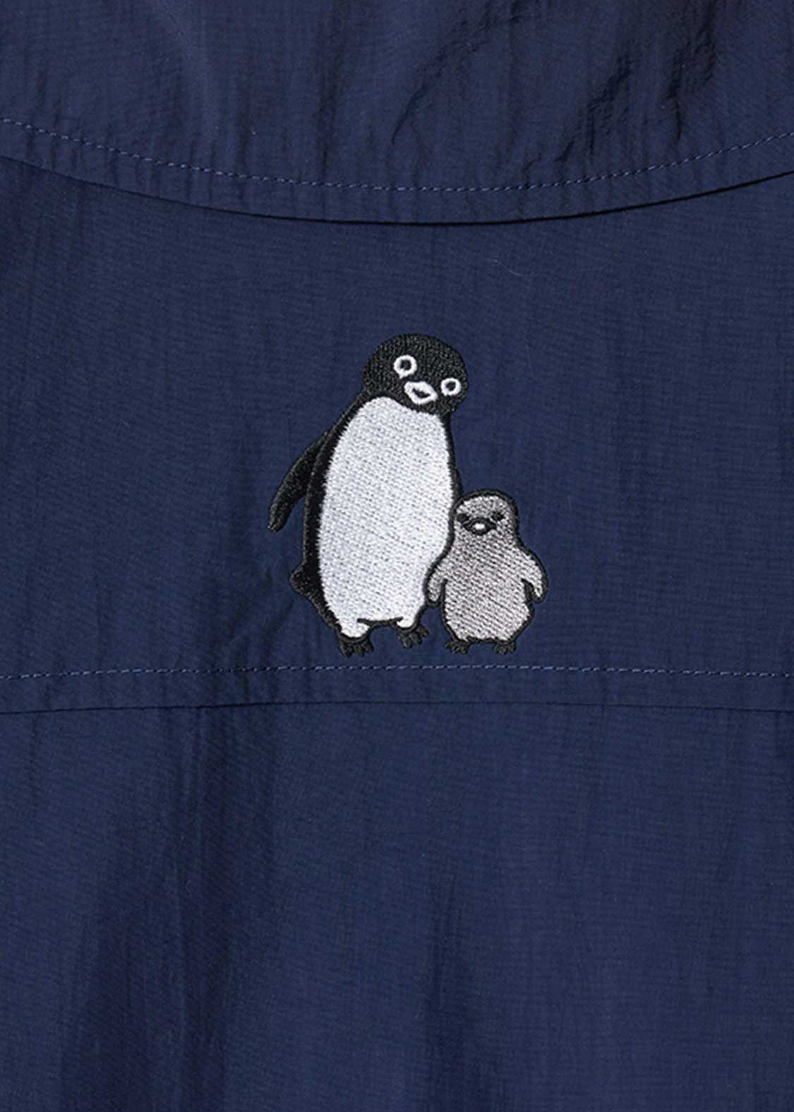 翼を広げ片足を上げてご機嫌なペンギンを胸元に刺繍したデザイン。バックに刺繍されたペンギンとヒナペンギンもポイント。裏地のペンギン、ヒナペンギン、猫の総柄にも注目です。
