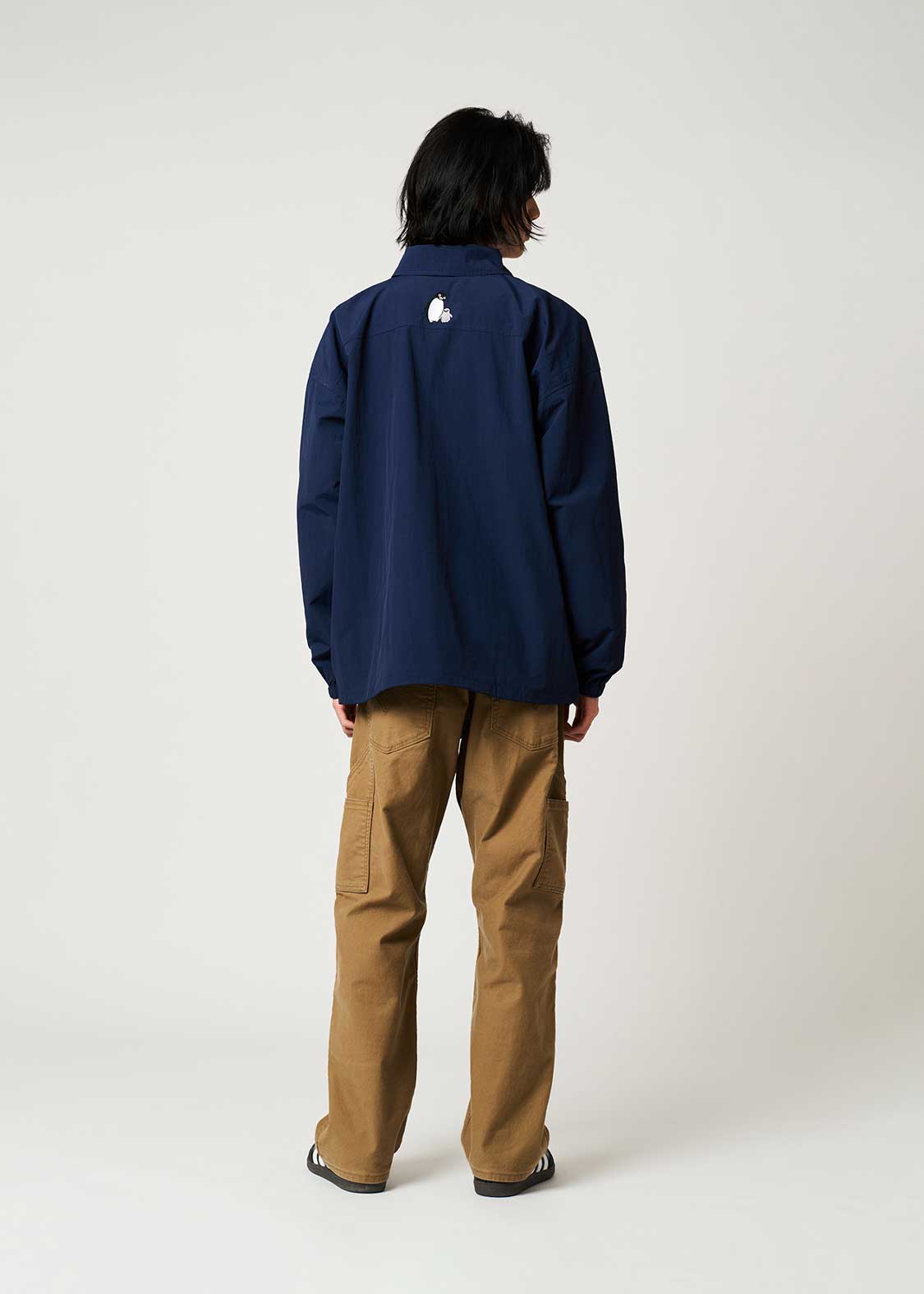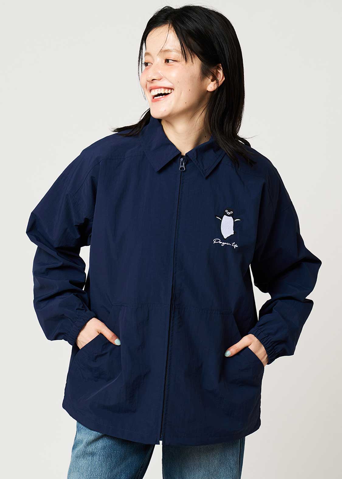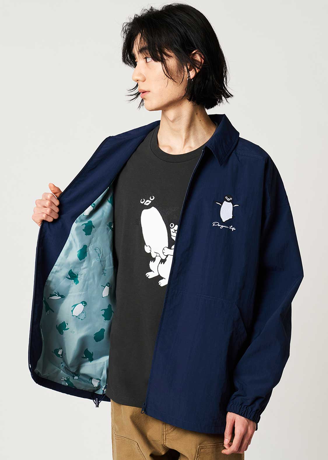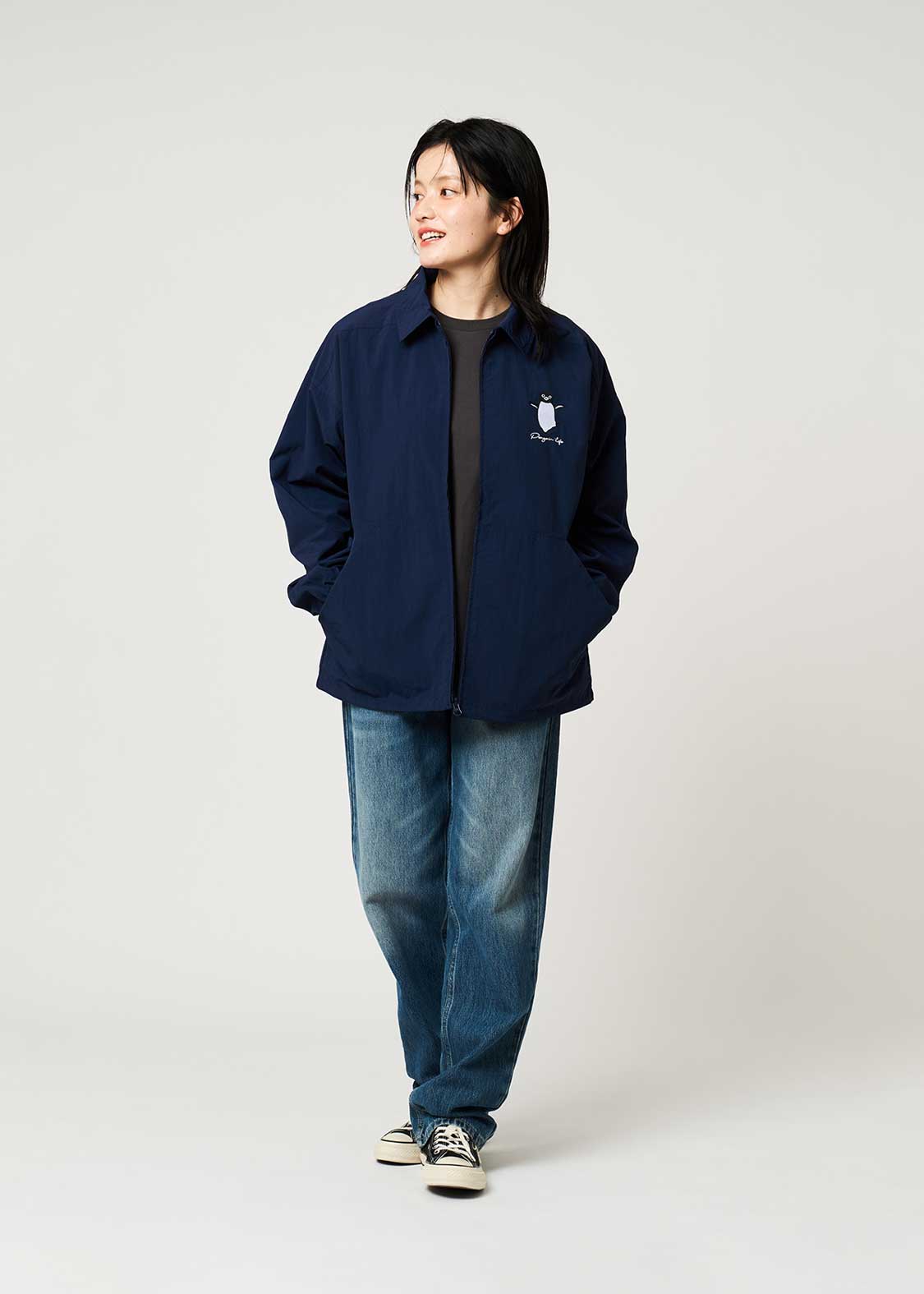 翼を広げ片足を上げてご機嫌なペンギンを胸元に刺繍したデザイン。バックに刺繍されたペンギンとヒナペンギンもポイント。裏地のペンギン、ヒナペンギン、猫の総柄にも注目です。