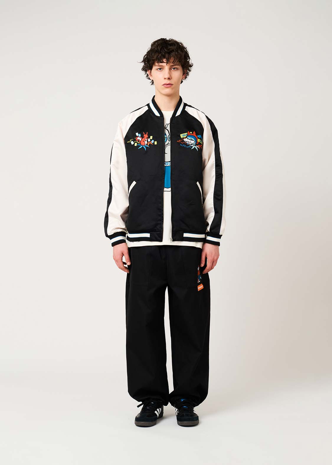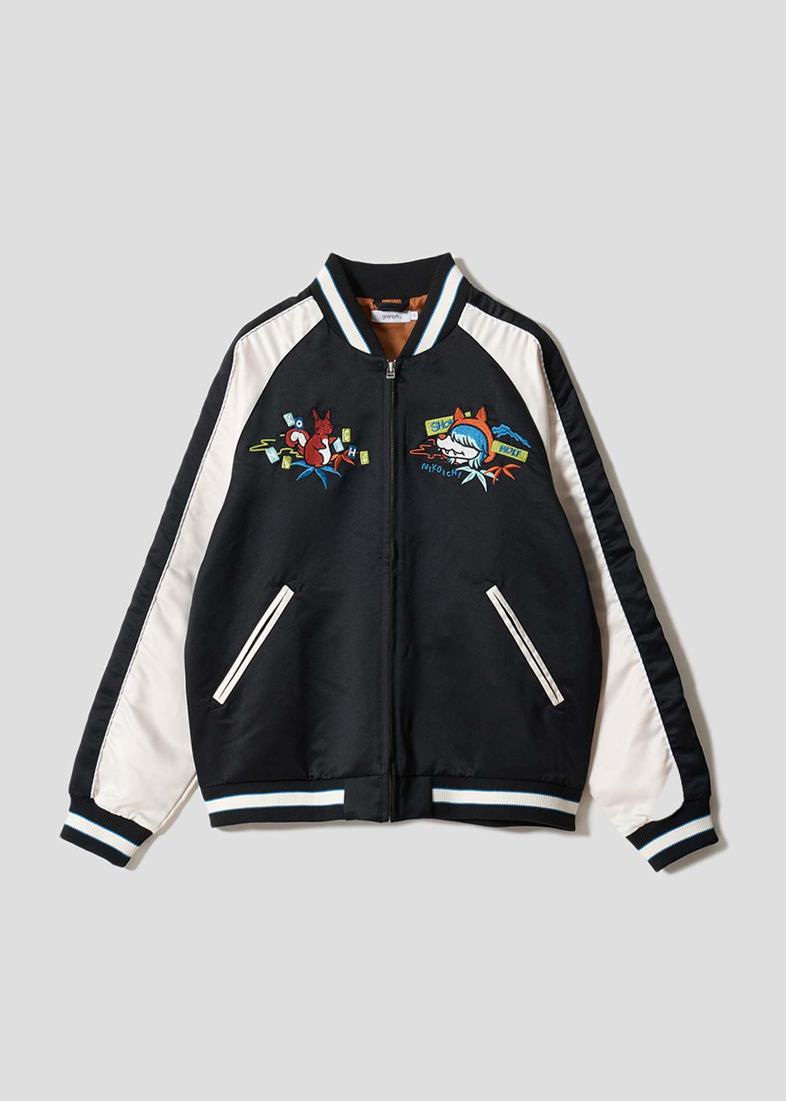 ・落ち着いた光沢のサテン生地で仕立てた、ゆったりとしたシルエットのスカジャンです。