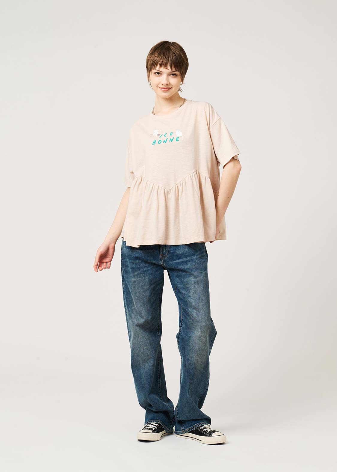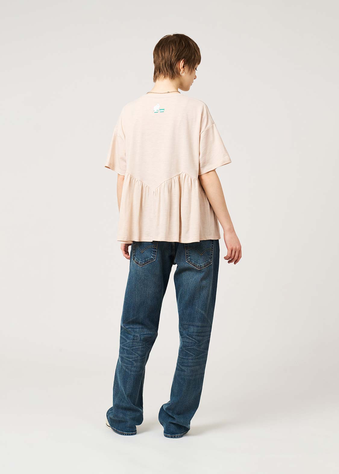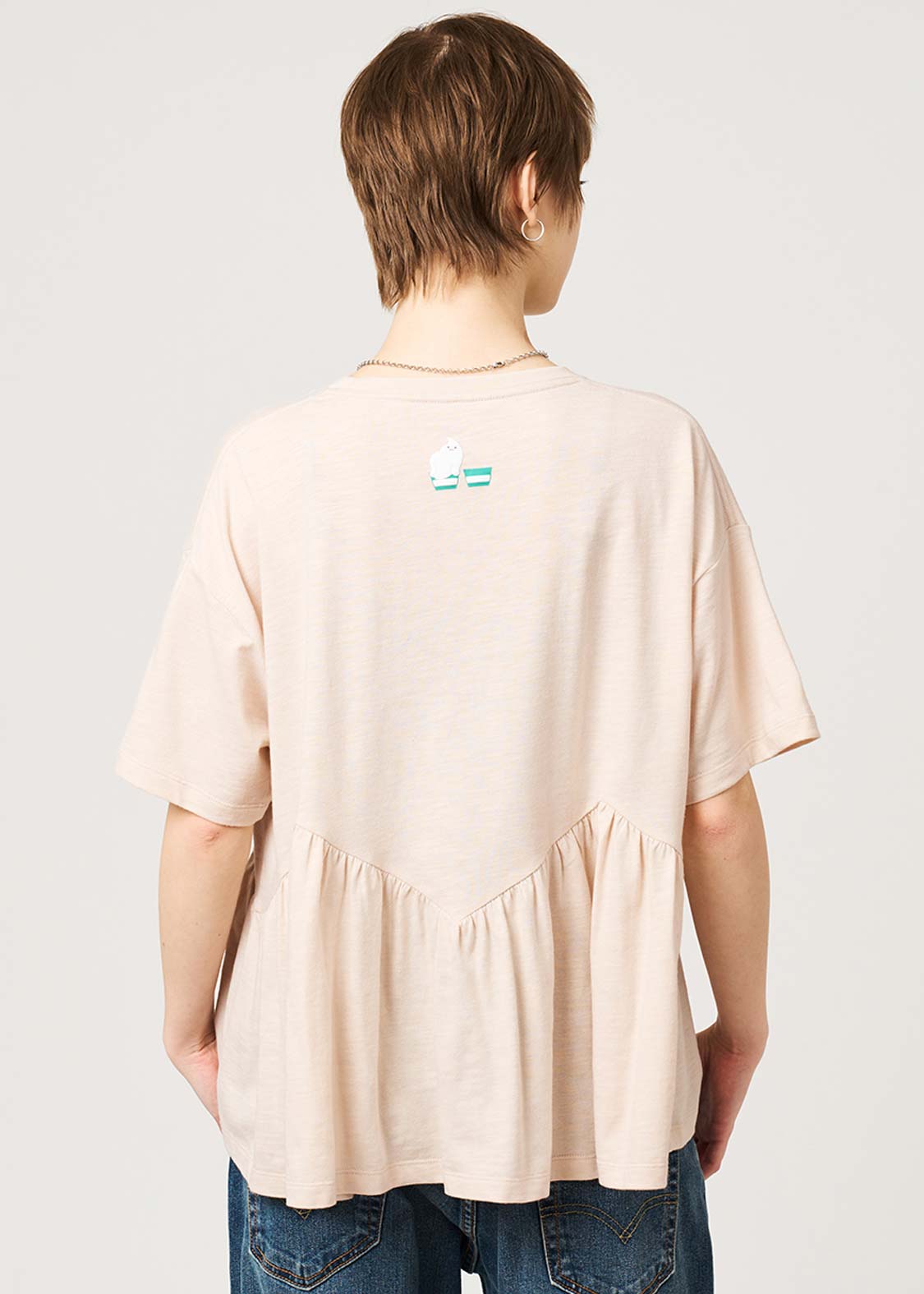 ・ゆったりとしたサイズ感で、ギャザーから裾にかけてふんわりと広がるシルエットに仕上げています。