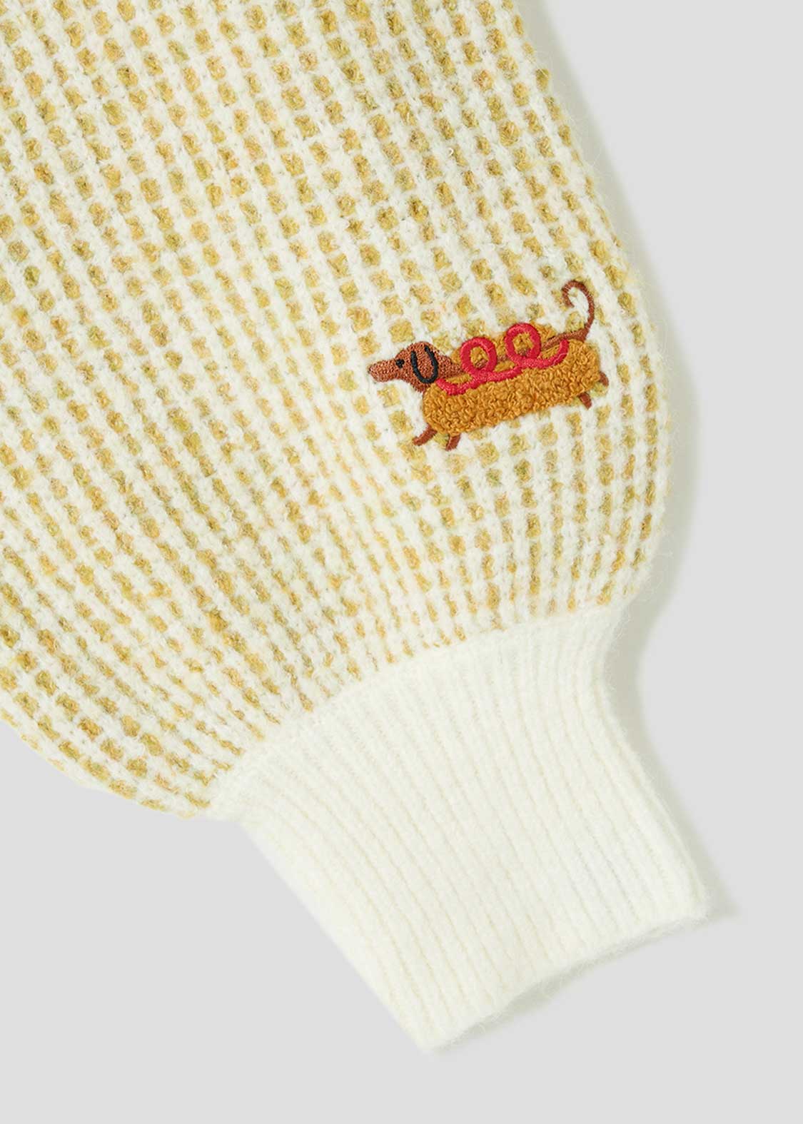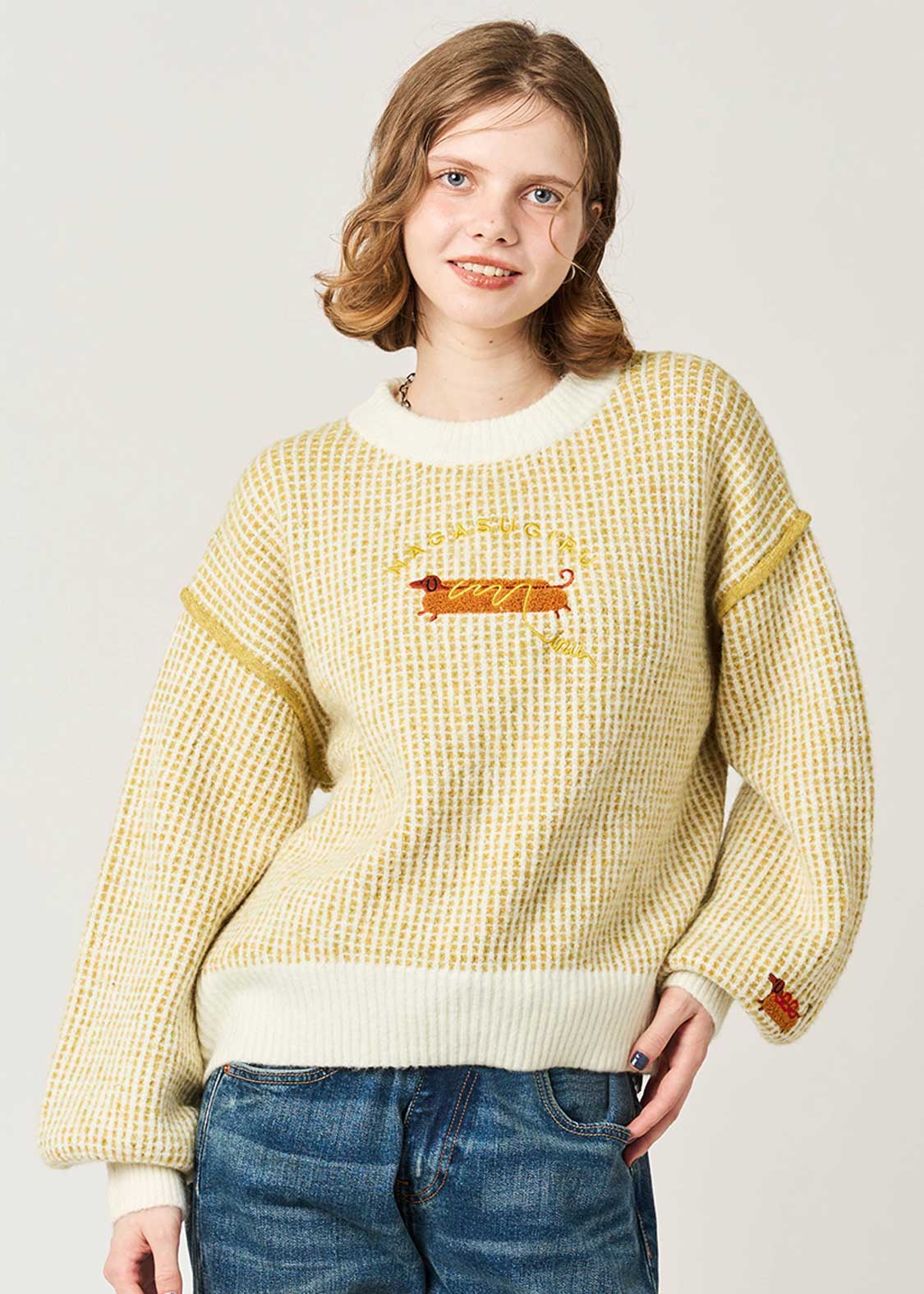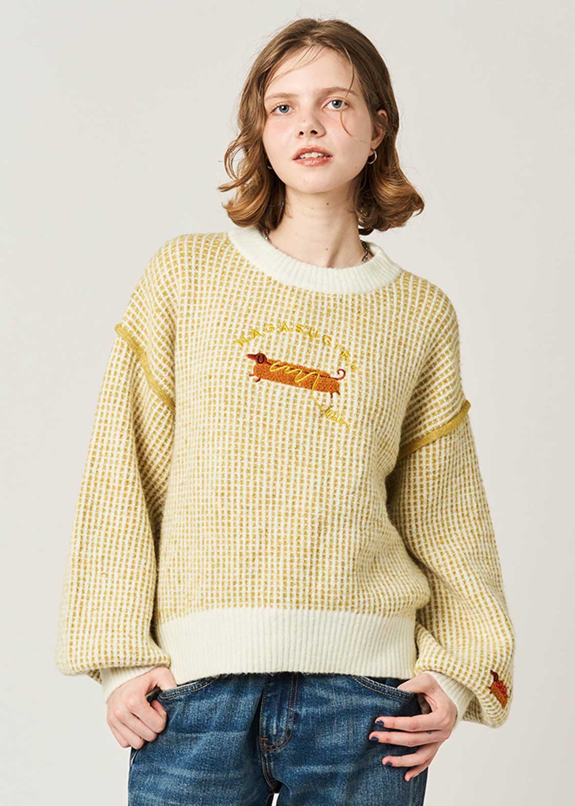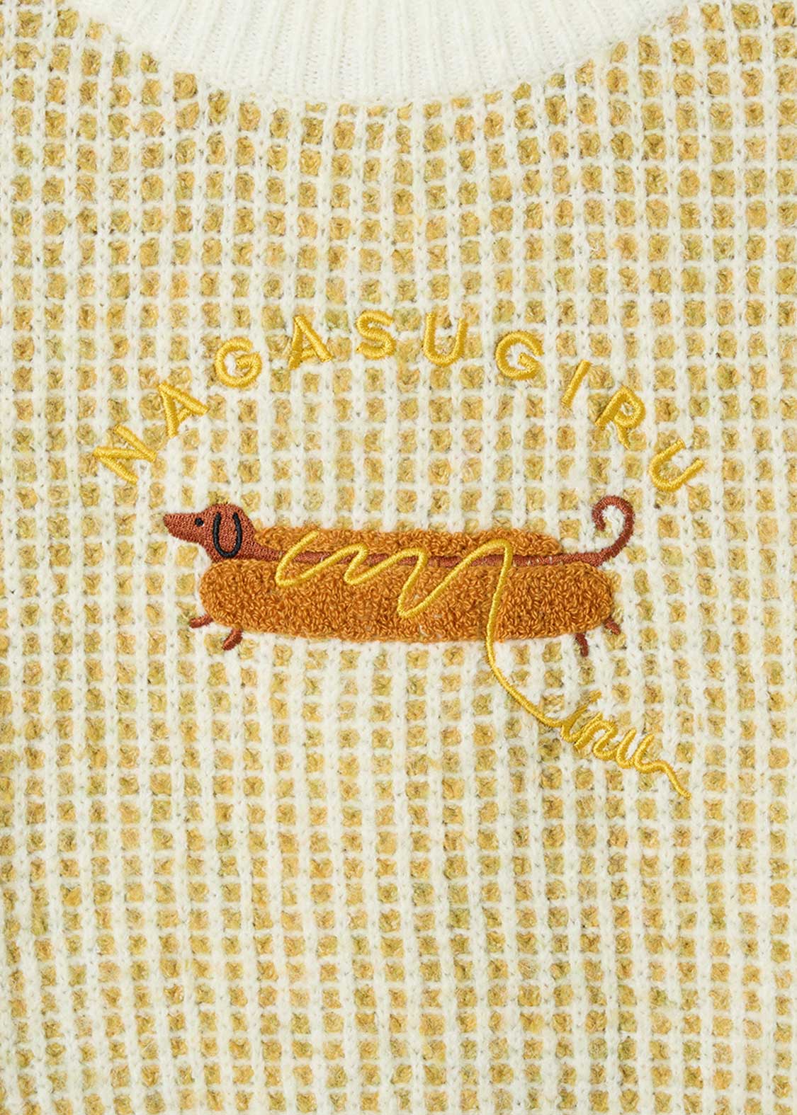 ナガスギルイヌとホットドッグ、なんとも可愛らしい。からし色のカラーがまた良いですね。さりげないワンポイントデザインが気に入り買ってしまいました。丈感が気になりましたが、Sサイズで ちょうど良かったです。