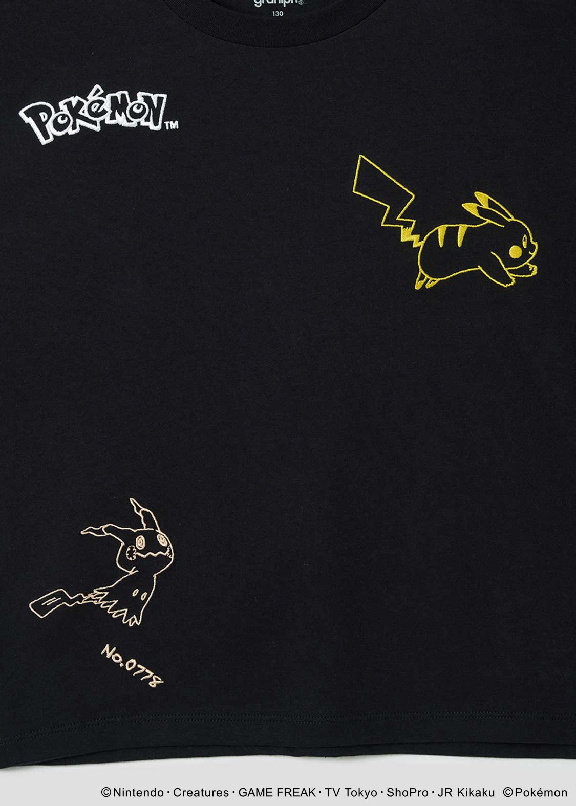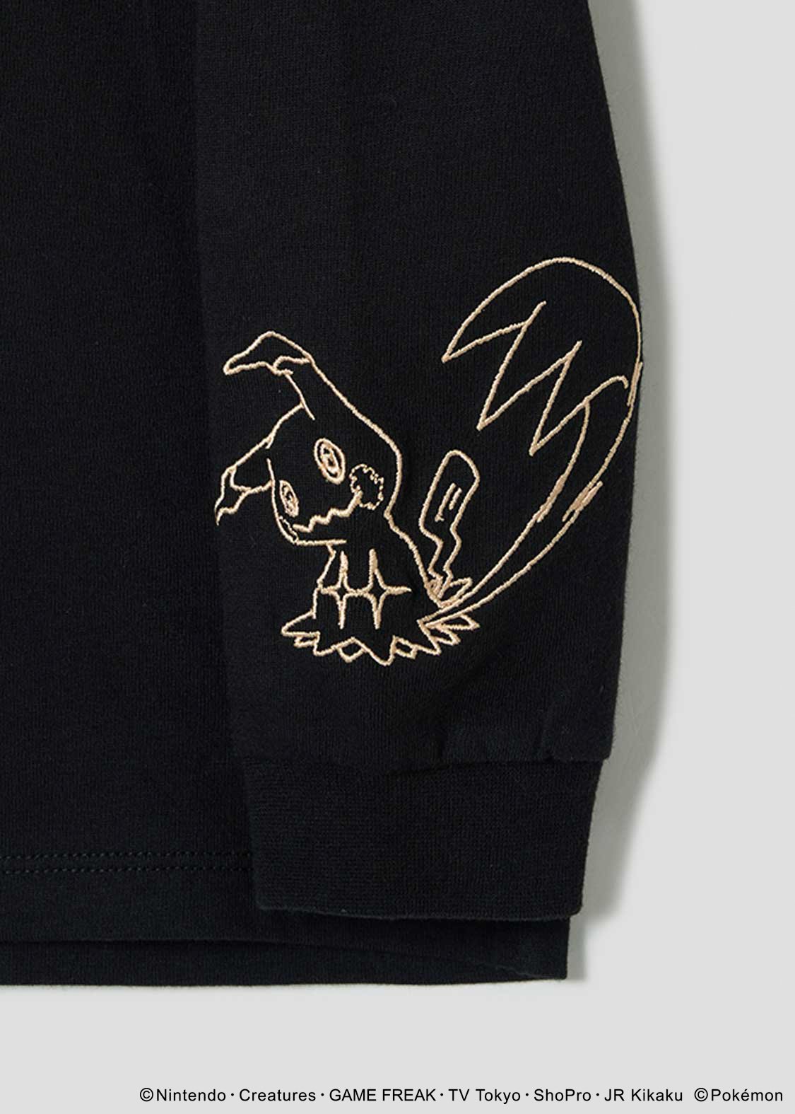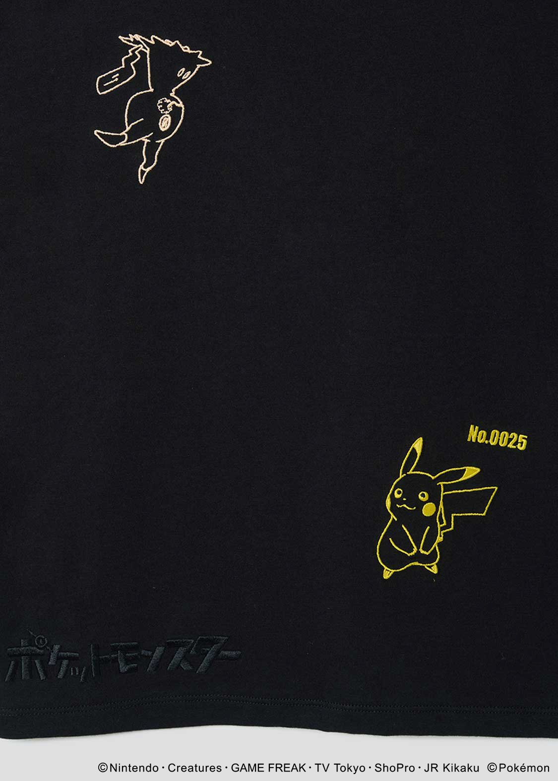 ピカチュウとミミッキュの姿を線画の刺繍で表現したデザイン。お気に入りの姿をぜひ探してみてください!