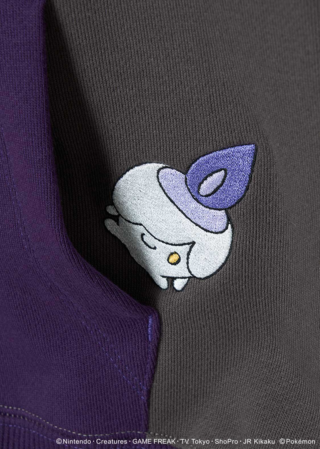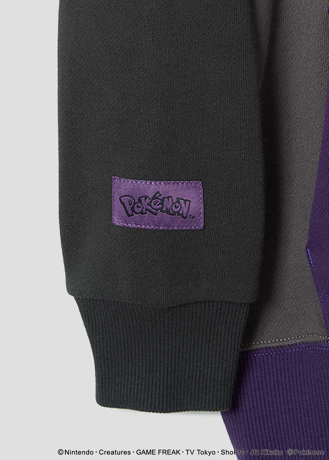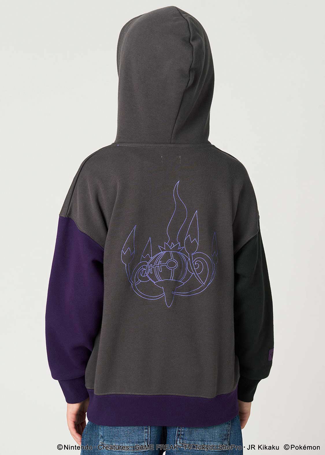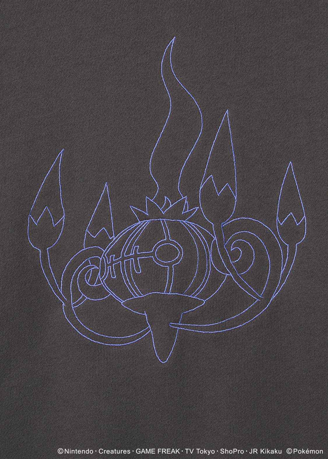 ポケットから顔を覗かせるヒトモシ、肩口のランプラー、バックには線画で表現したシャンデラを刺繍しました。右の袖口についた織りネームもポイントです。