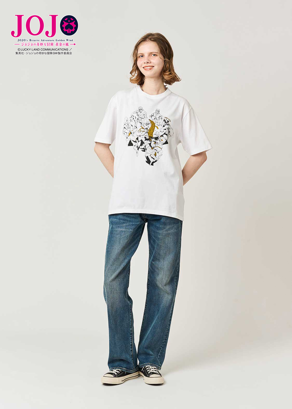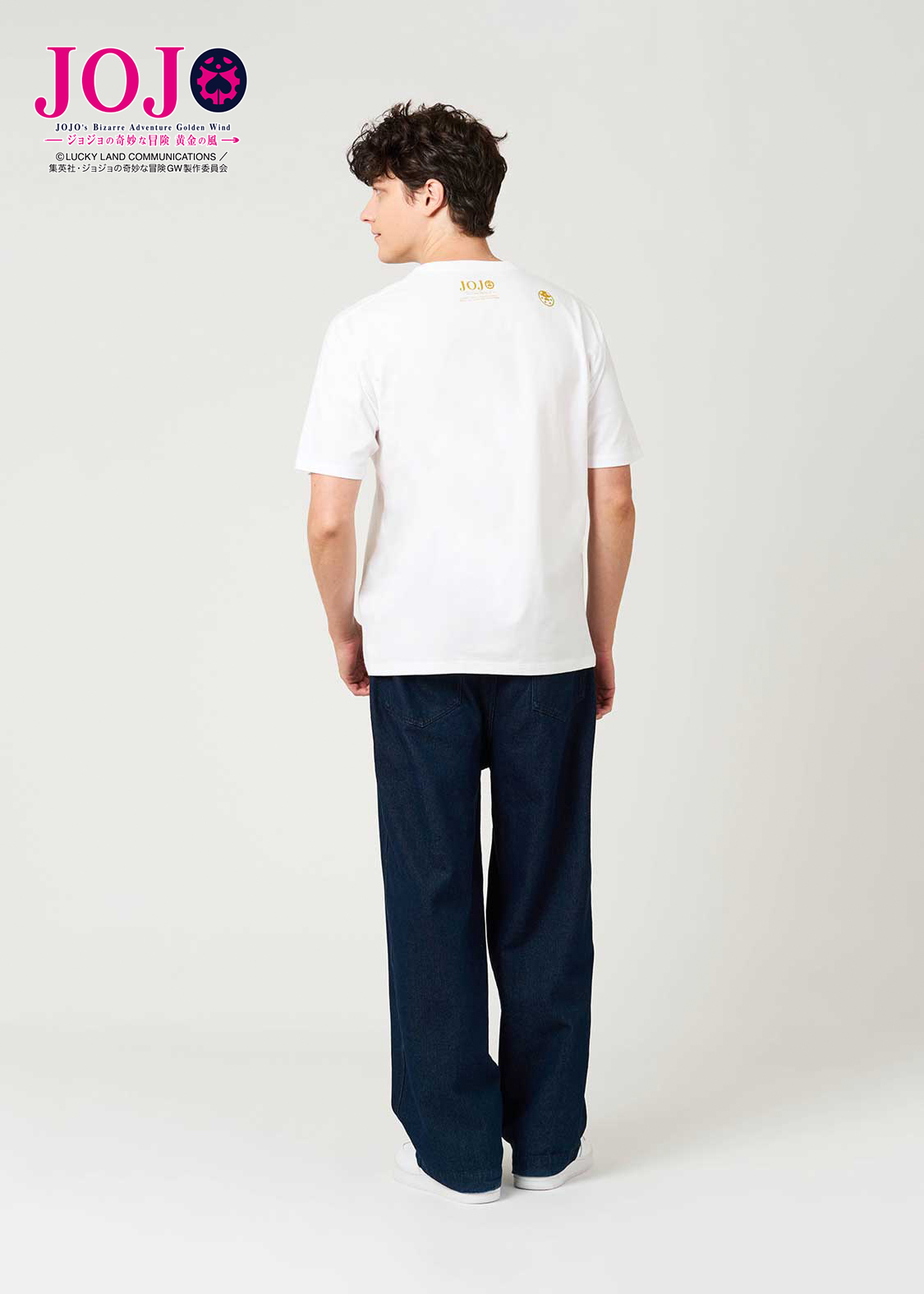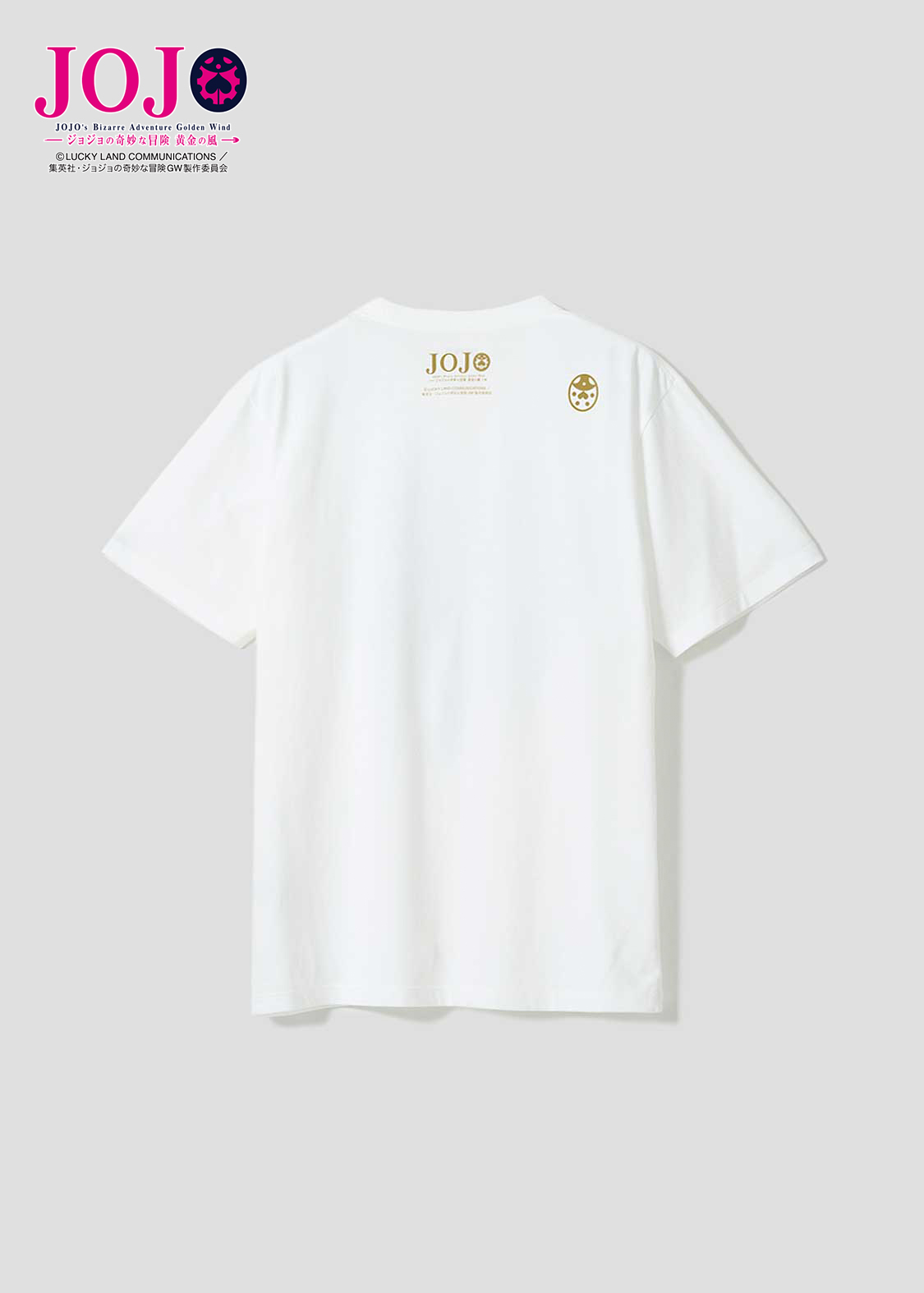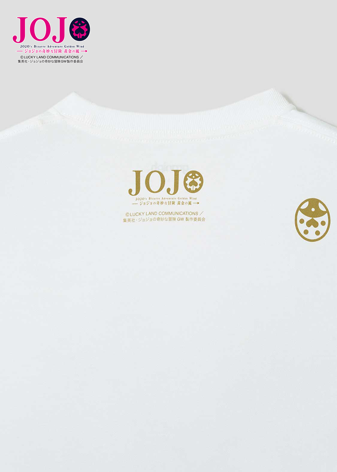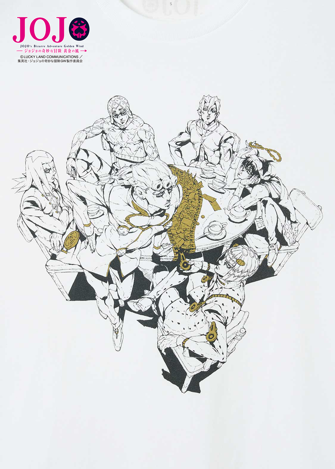 アニメ『ジョジョの奇妙な冒険 黄金の風』より。ギャング組織「パッショーネ」の「ブチャラティチーム」がティータイムを楽しむ姿のデザイン。バックには、ジョルノのテントウムシのブローチをイメージしたロゴがあしらわれています。