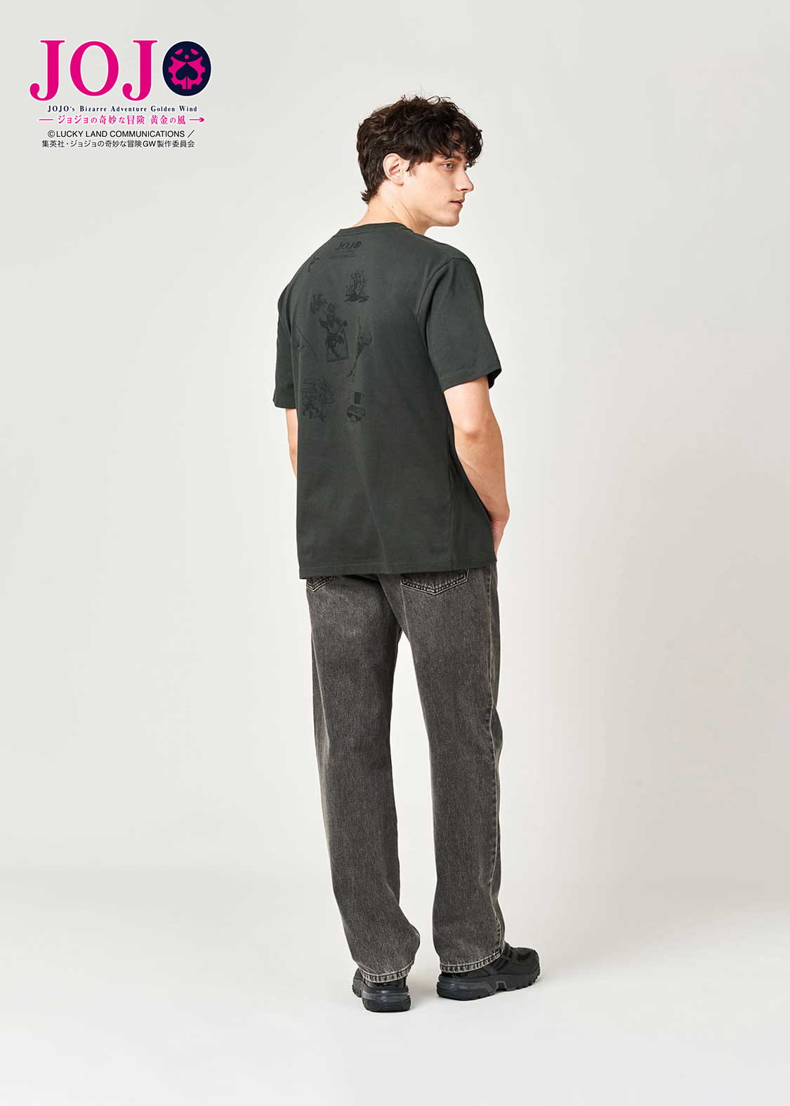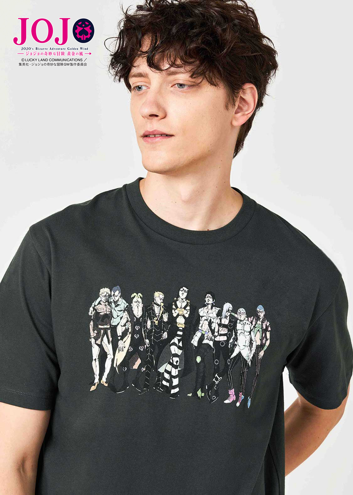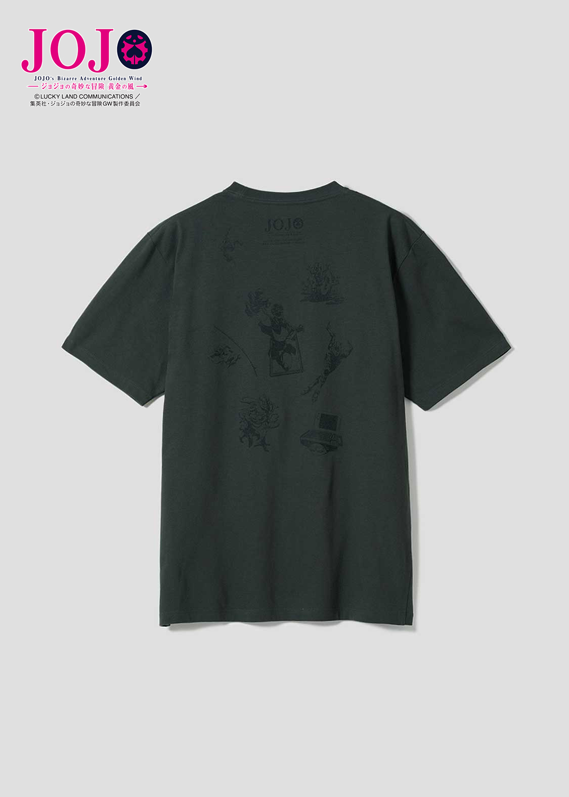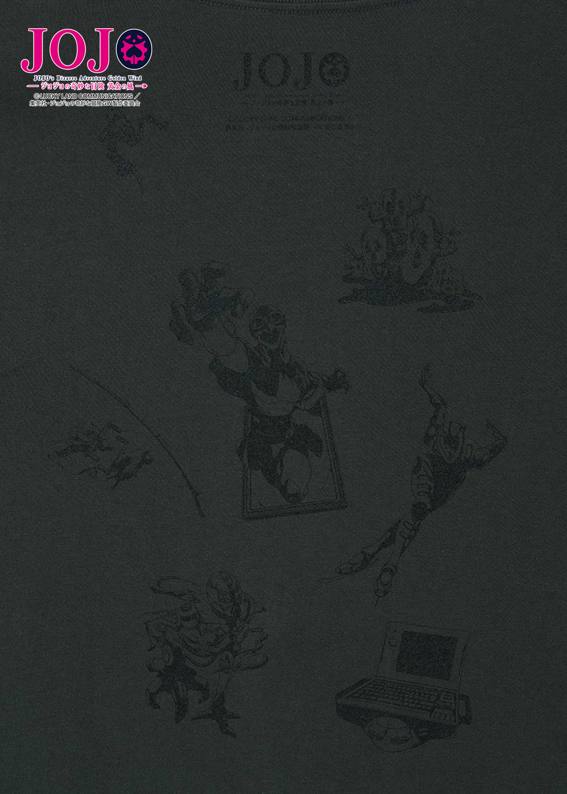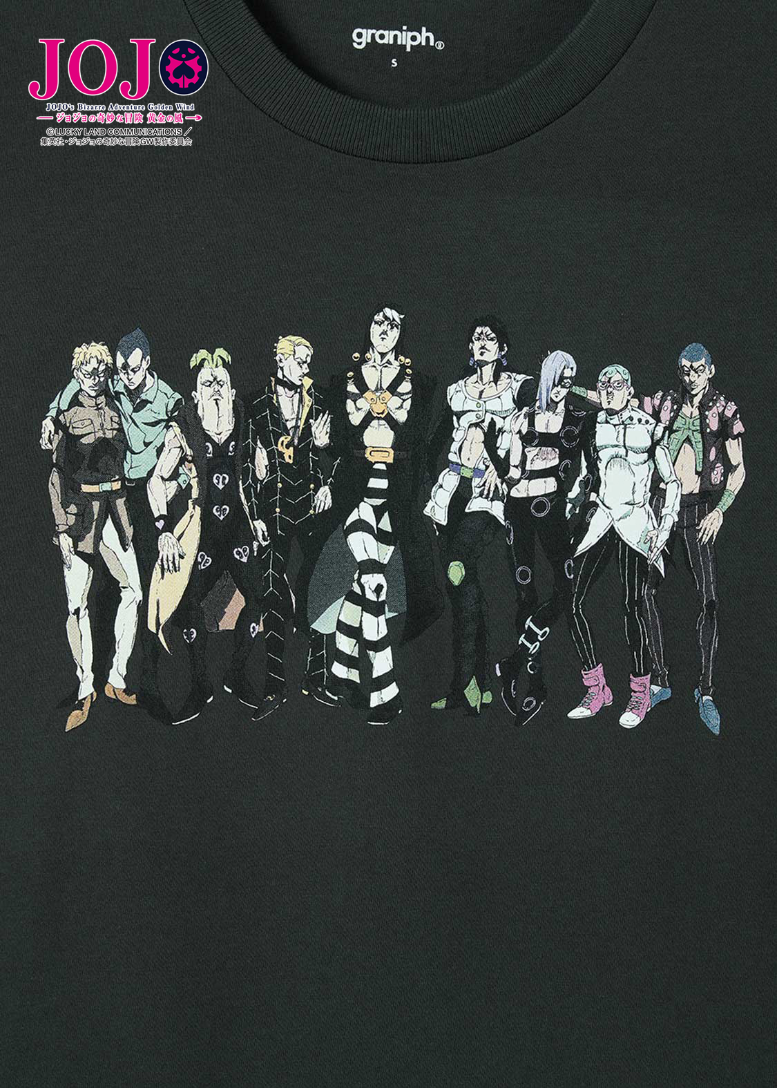 アニメ『ジョジョの奇妙な冒険 黄金の風』より。ギャング組織「パッショーネ」の「暗殺者チーム」が、リーダーのリゾットを中心に威圧感たっぷりに並ぶデザイン。バックには、彼らのスタンドが潜むようにプリントされています。
