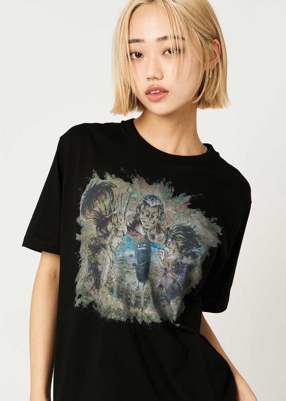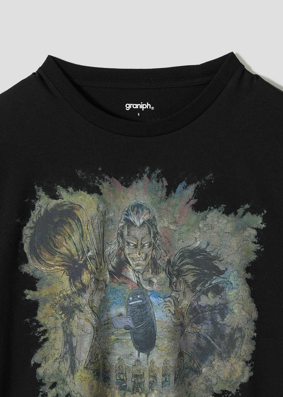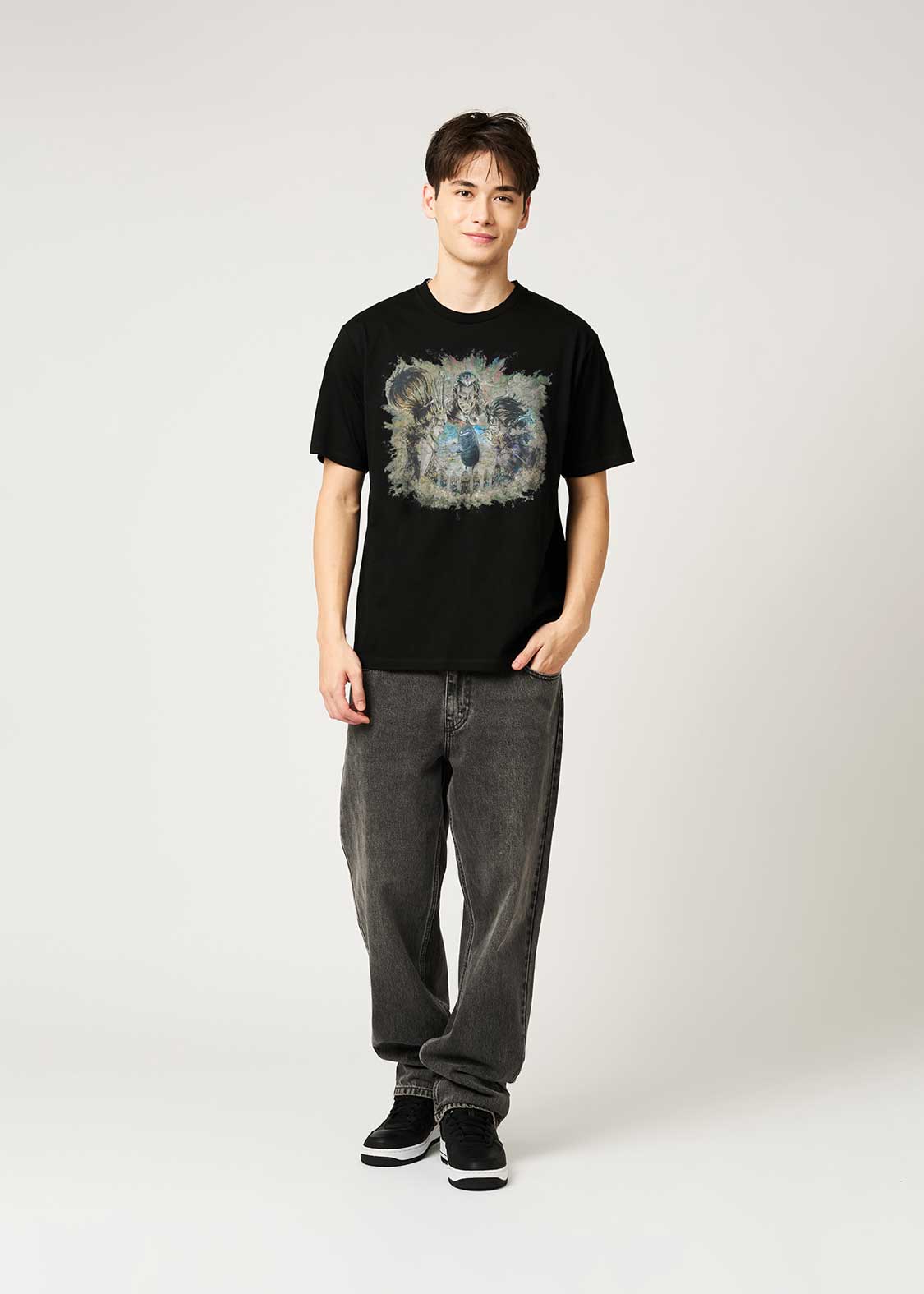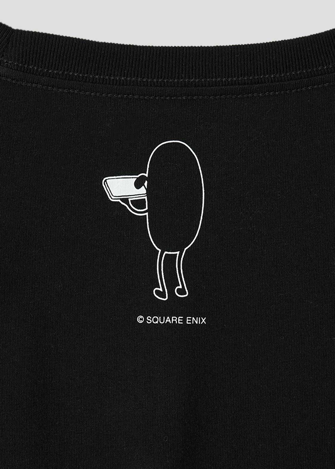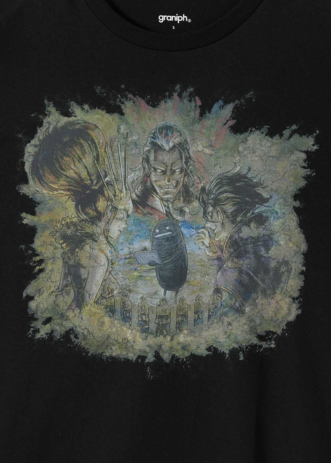 『オクトパストラベラー 大陸の覇者』より。グラニフのキャラクタービューティフルシャドーとコラボレーションした特別なデザイン。富・権力・名声を極めし3人に囲まれたビューティフルシャドーが手にしているのは・・?バックにはゲームを楽しむビューティフルシャドーの後ろ姿がプリントされています。