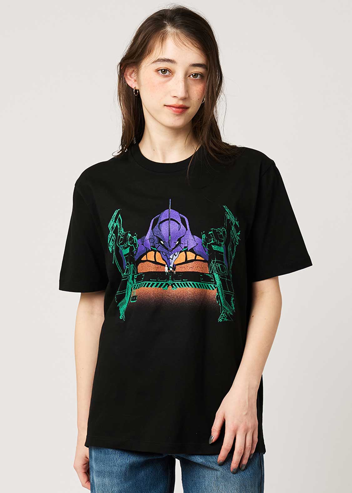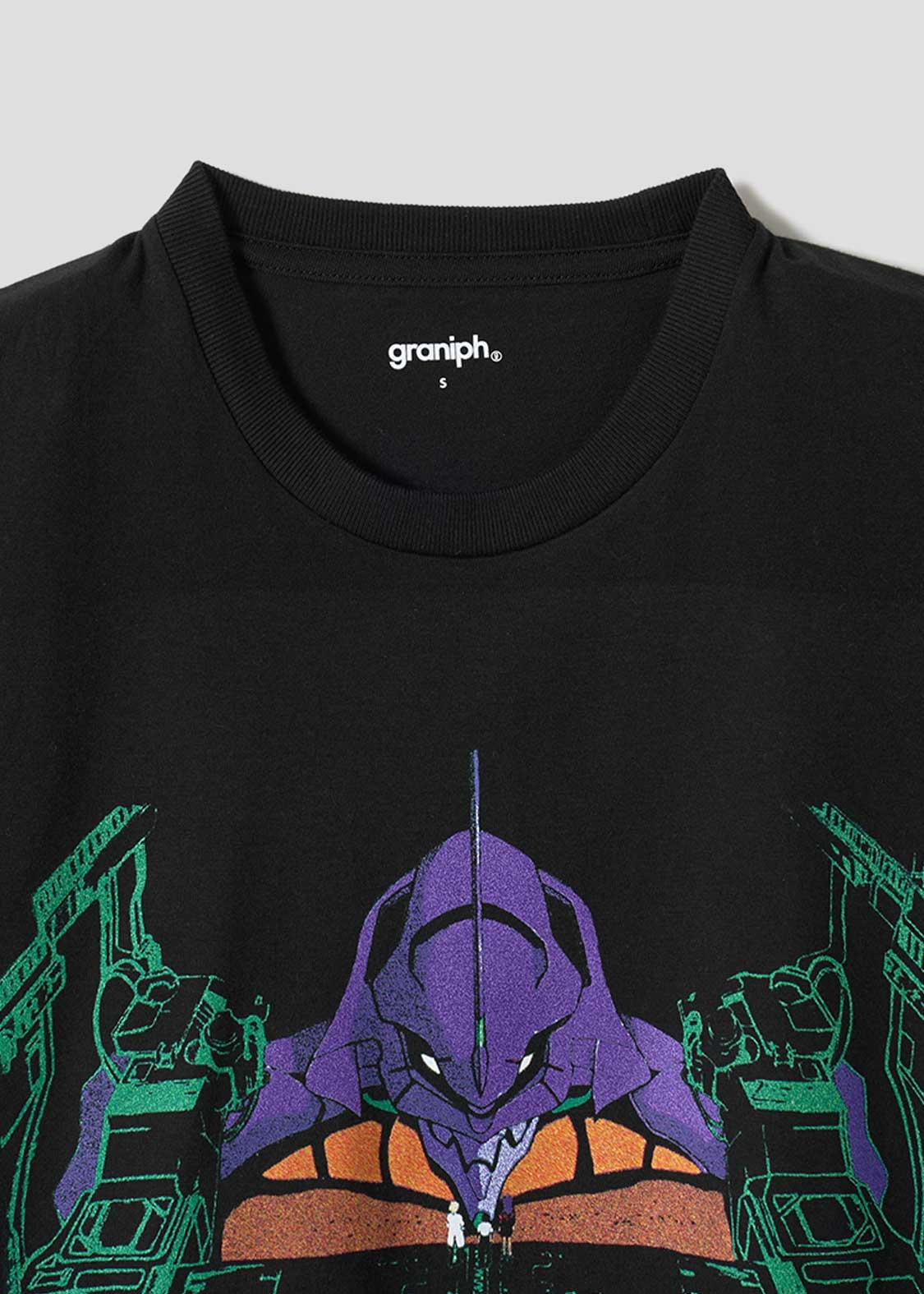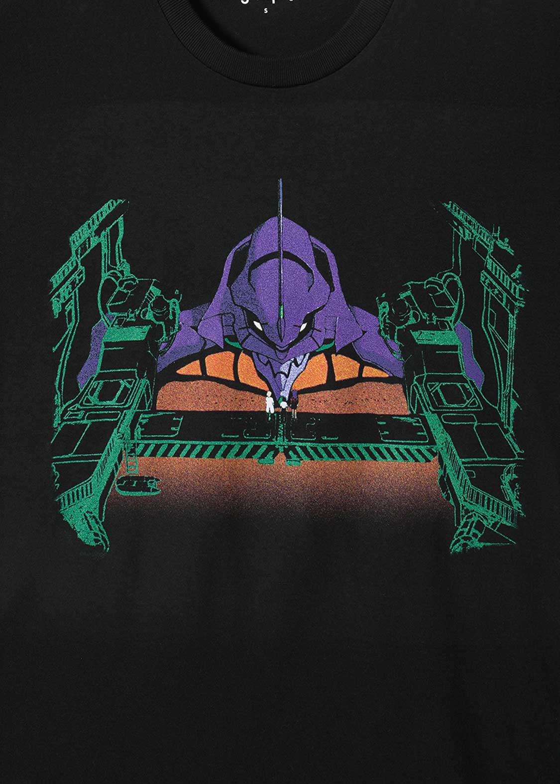 第壱話「使徒、襲来」より。ミサトとリツコに連れられ、シンジが初めて初号機に出会ったワンシーンをイメージしたデザイン。バックには上からシンジを見下ろす父、碇ゲンドウのシルエットがプリントされています。これを着れば逃げない勇気が出るかもしれません。