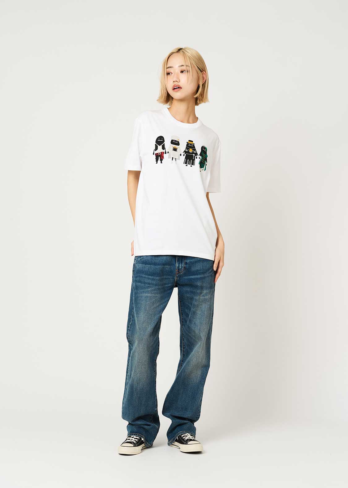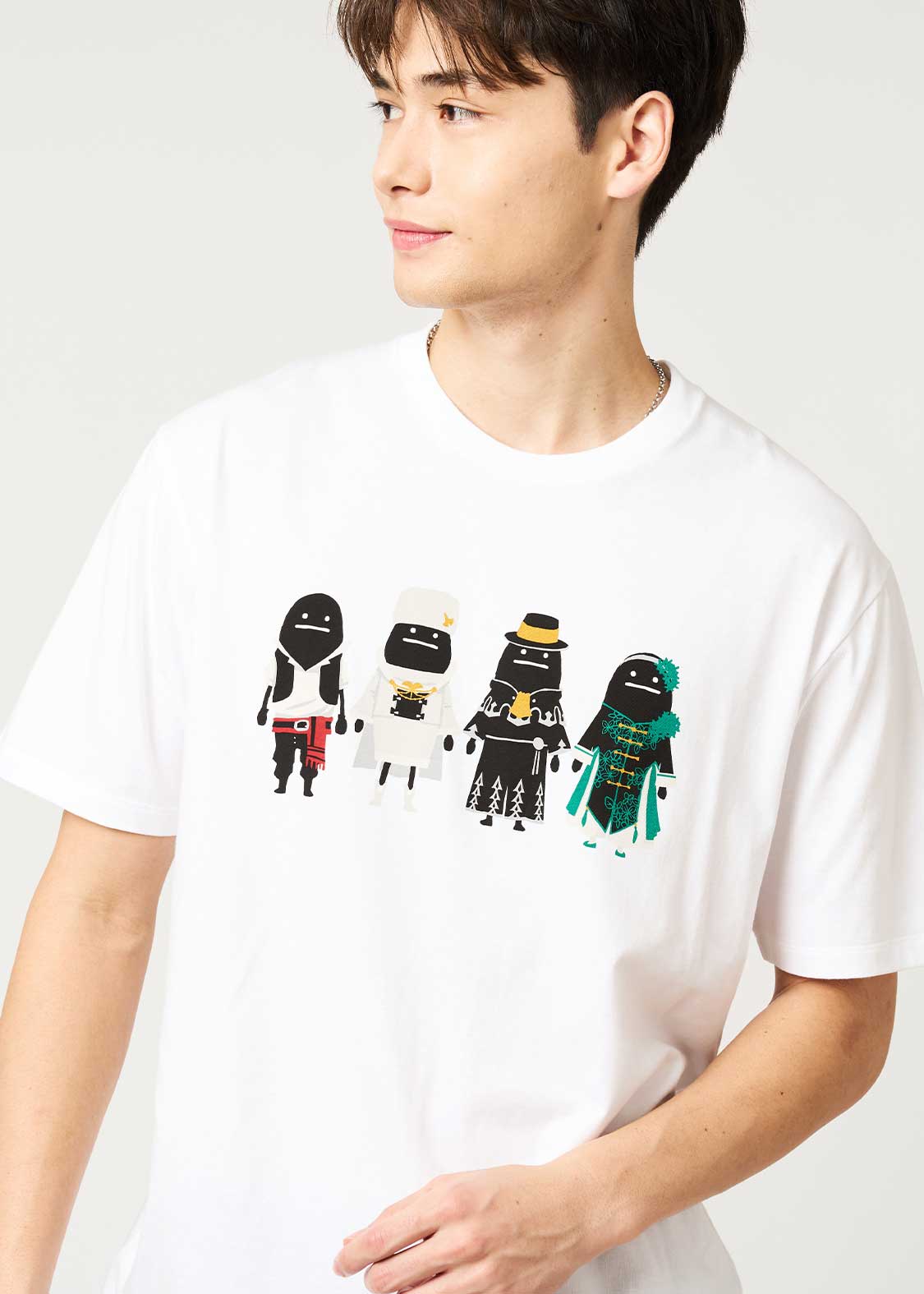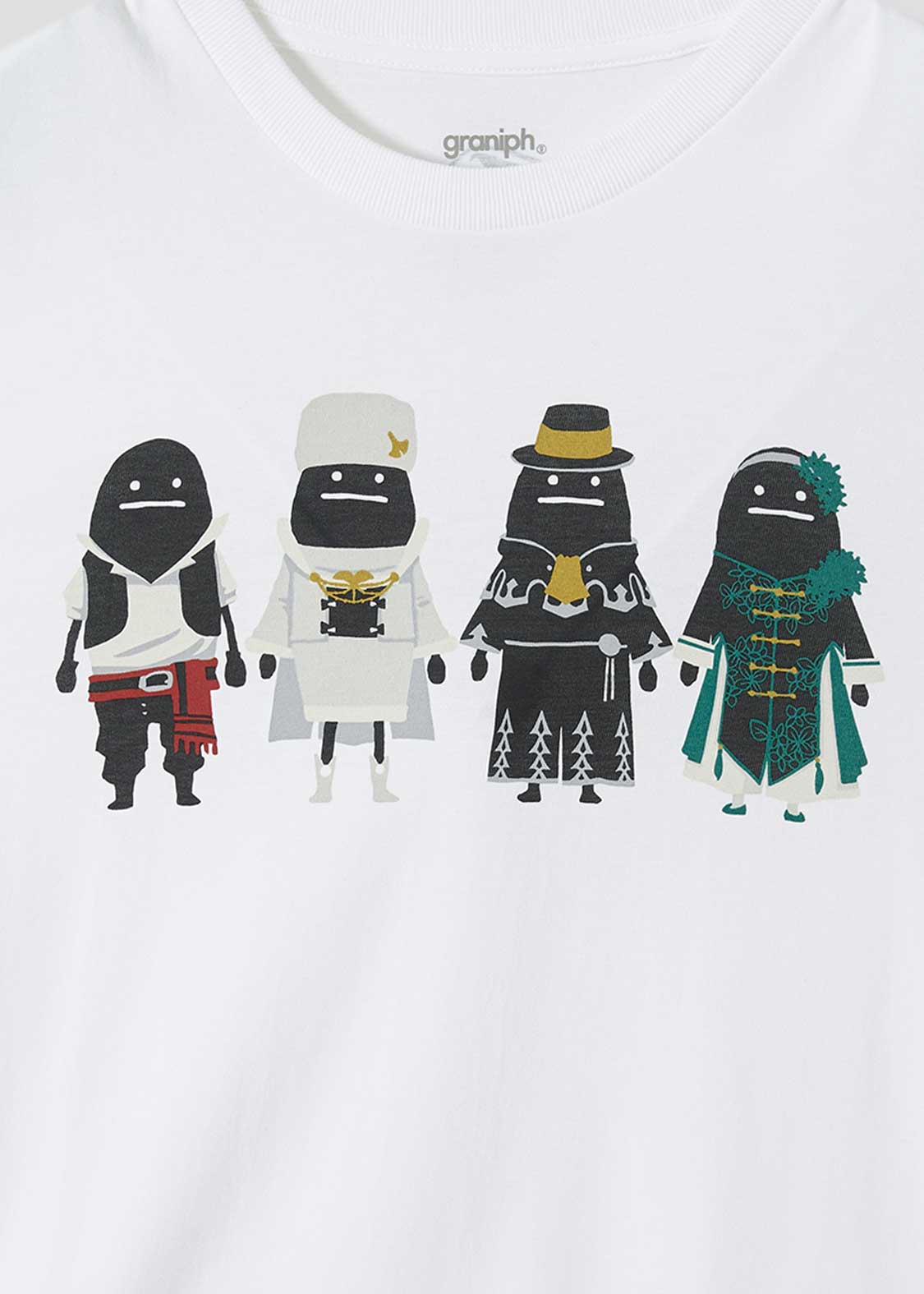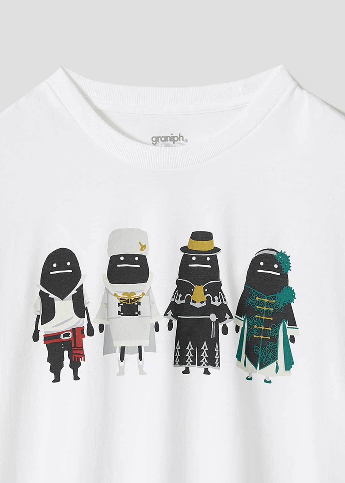 『ブレイブリーデフォルトII』より。本作のパーティーメンバー4人とグラニフの人気キャラクタービューティフルシャドーがコラボレーションした特別なデザイン。左から、すっぴんのセス、白魔道士のグローリア、黒魔道士のエルヴィス、モンクのアデルの衣装です。バックにはジョブの力を宿すアスタリスクがプリントされています。
