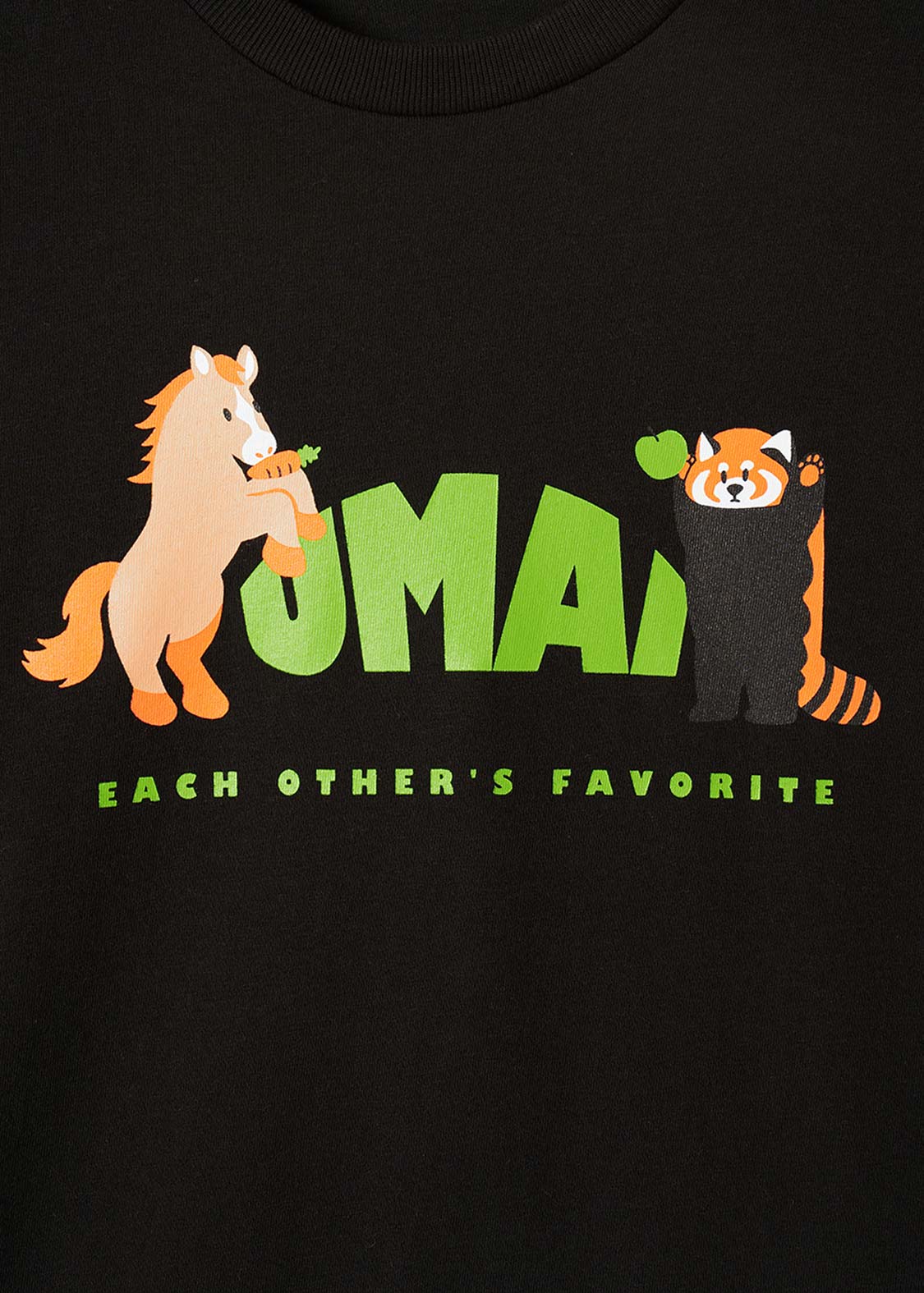 馬と遊ぶレッサーパンダ。カウボーイ気分で乗ってみたり、おやつを交換してみたり。自由でのんびりしたシーンを描いたグラフィックです。