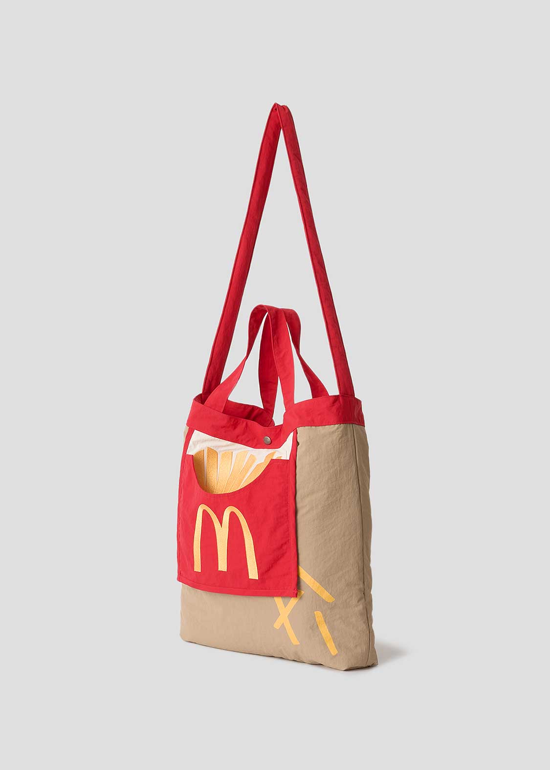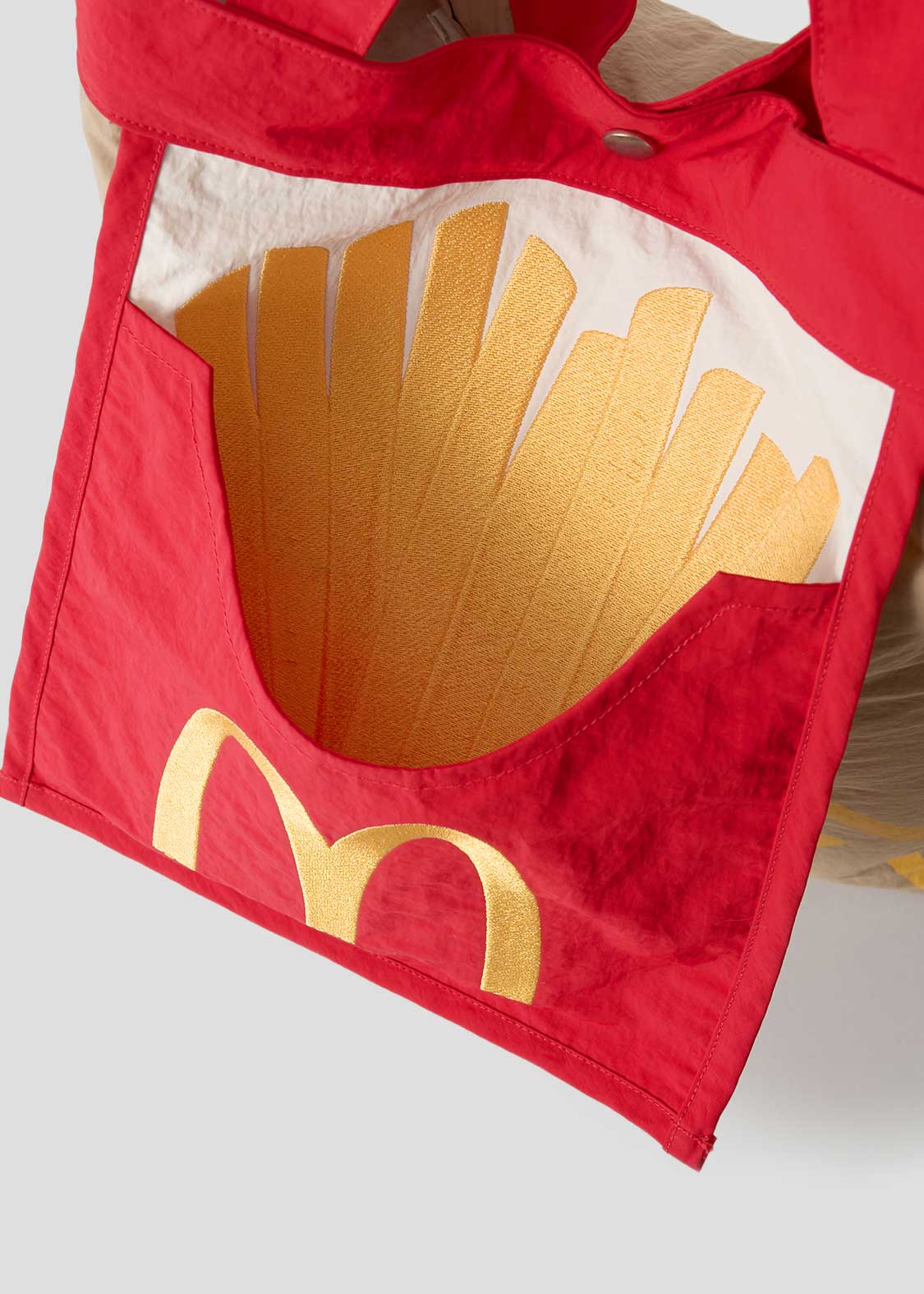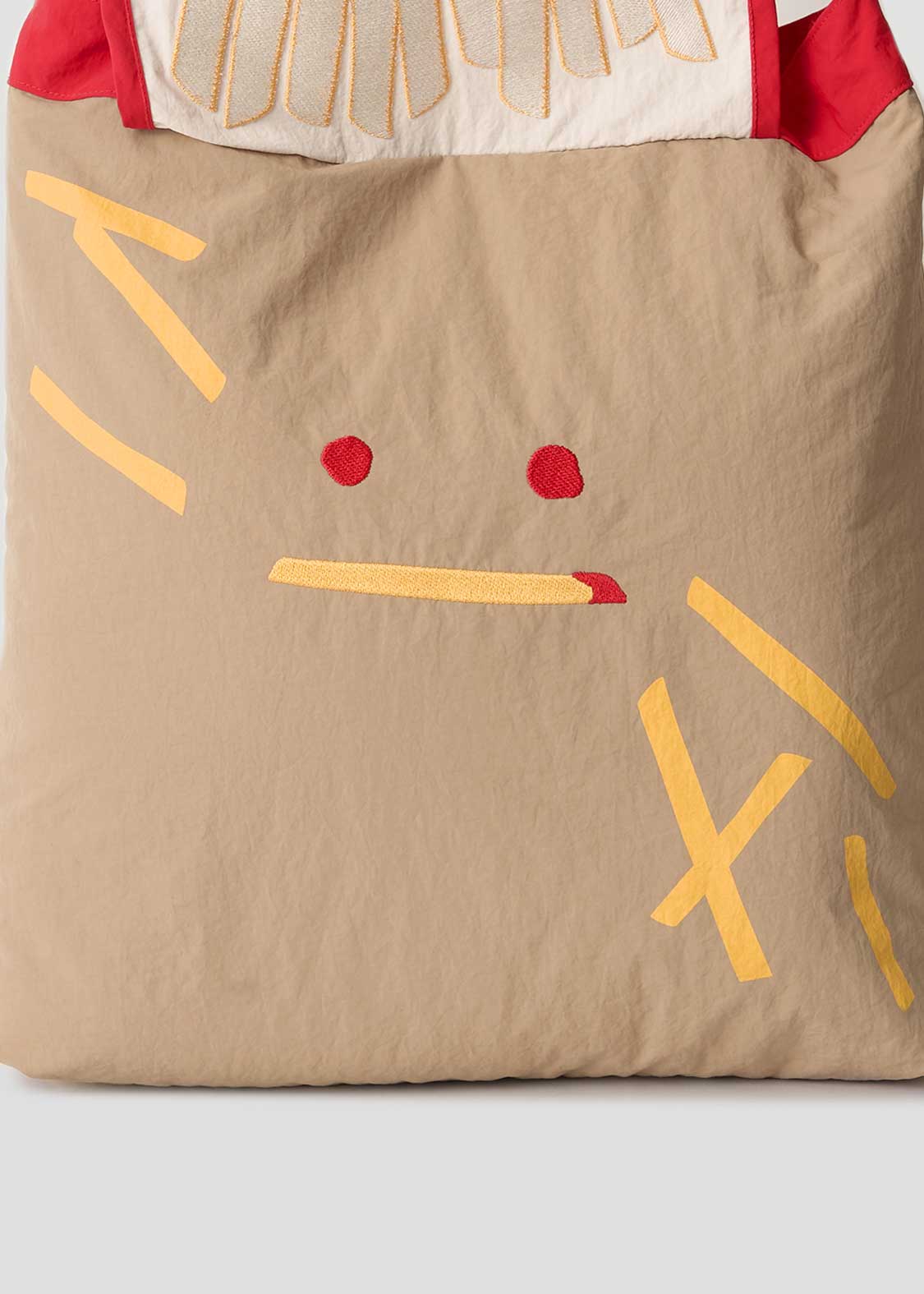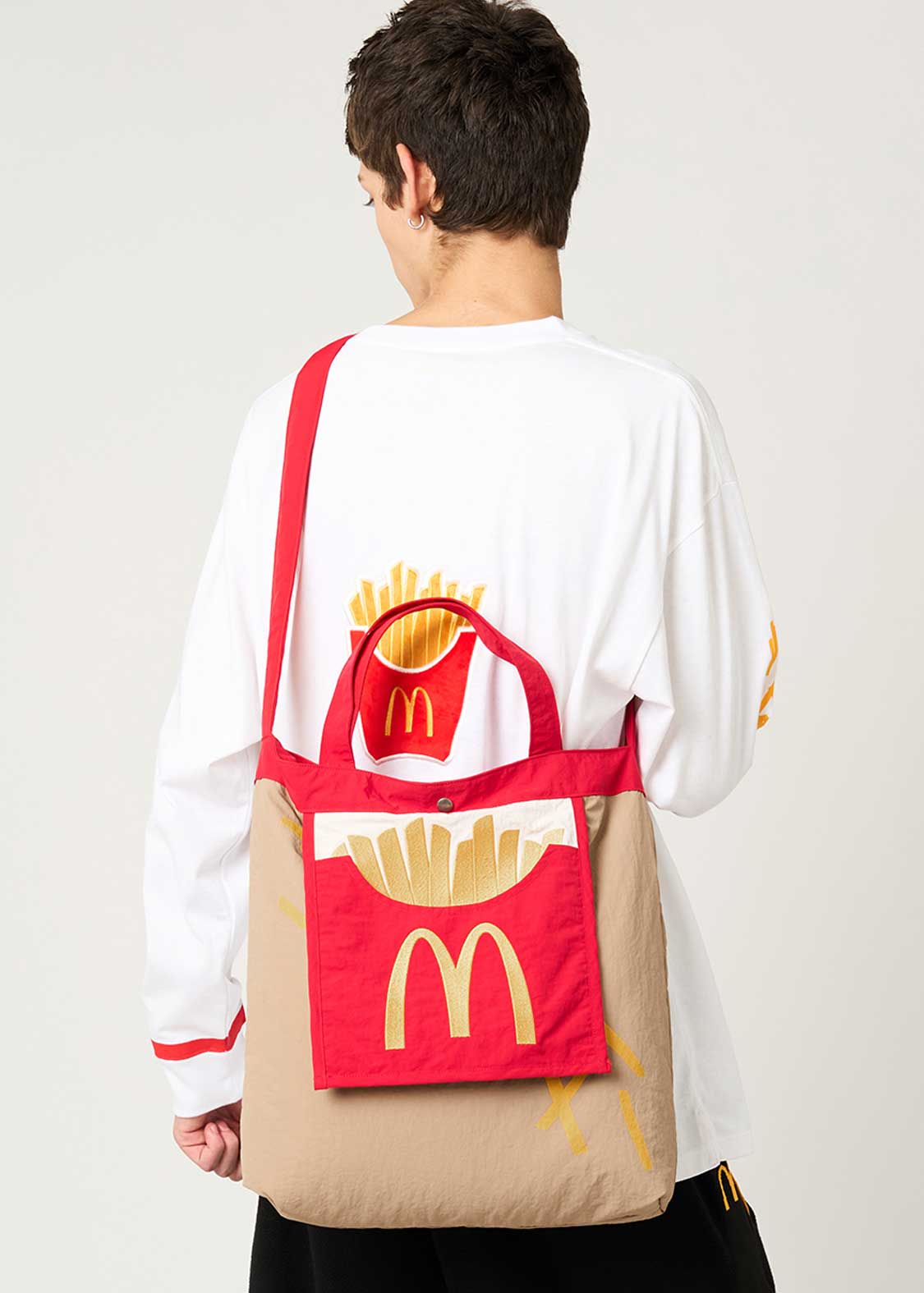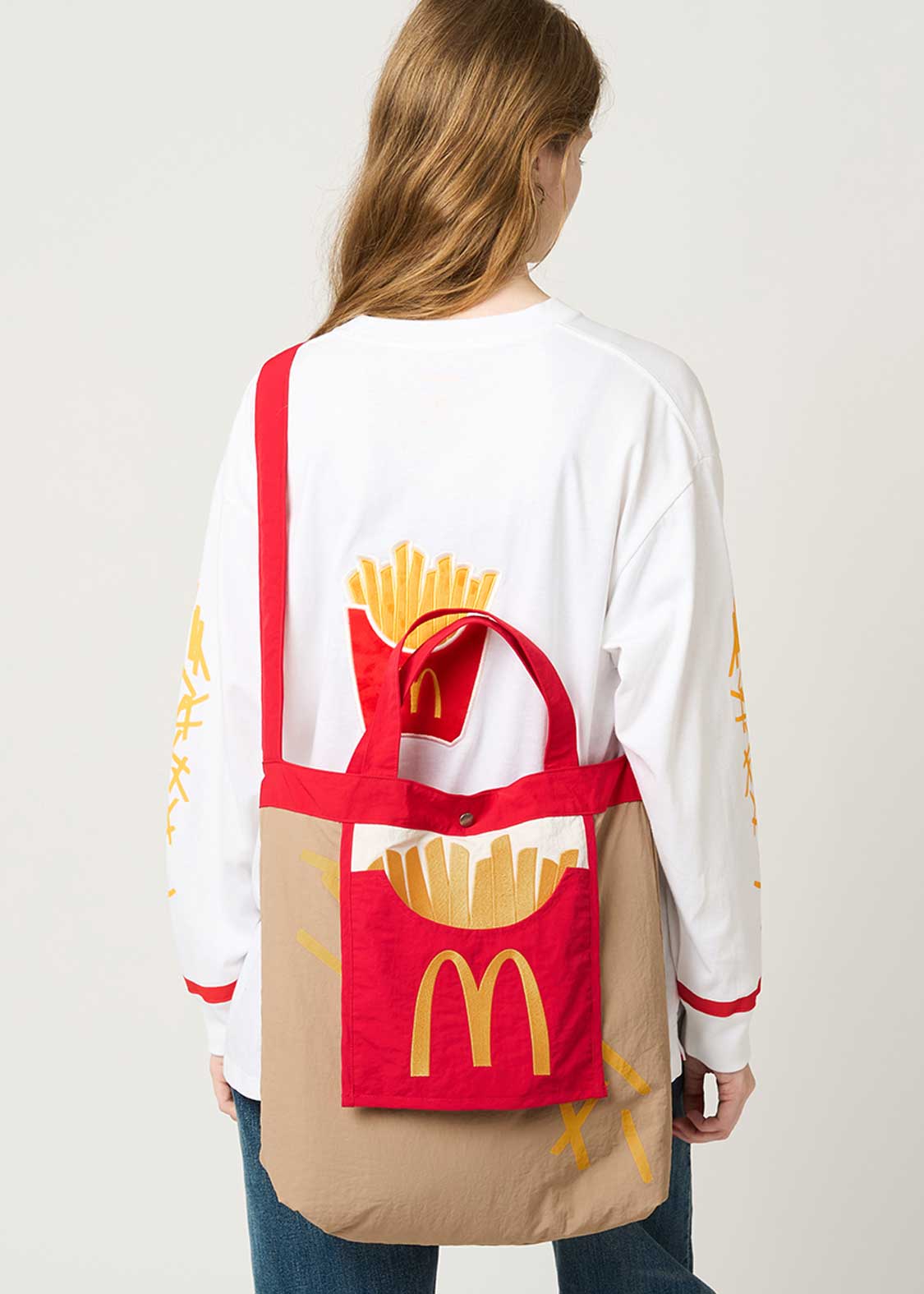 ケースに入ったマックフライポテトのポケットをめくると、マックフライポテトとケチャップで出来上がったグラニフの人気キャラクター「ビューティフルシャドー」の顔が刺繍されている遊び心あるデザインです。