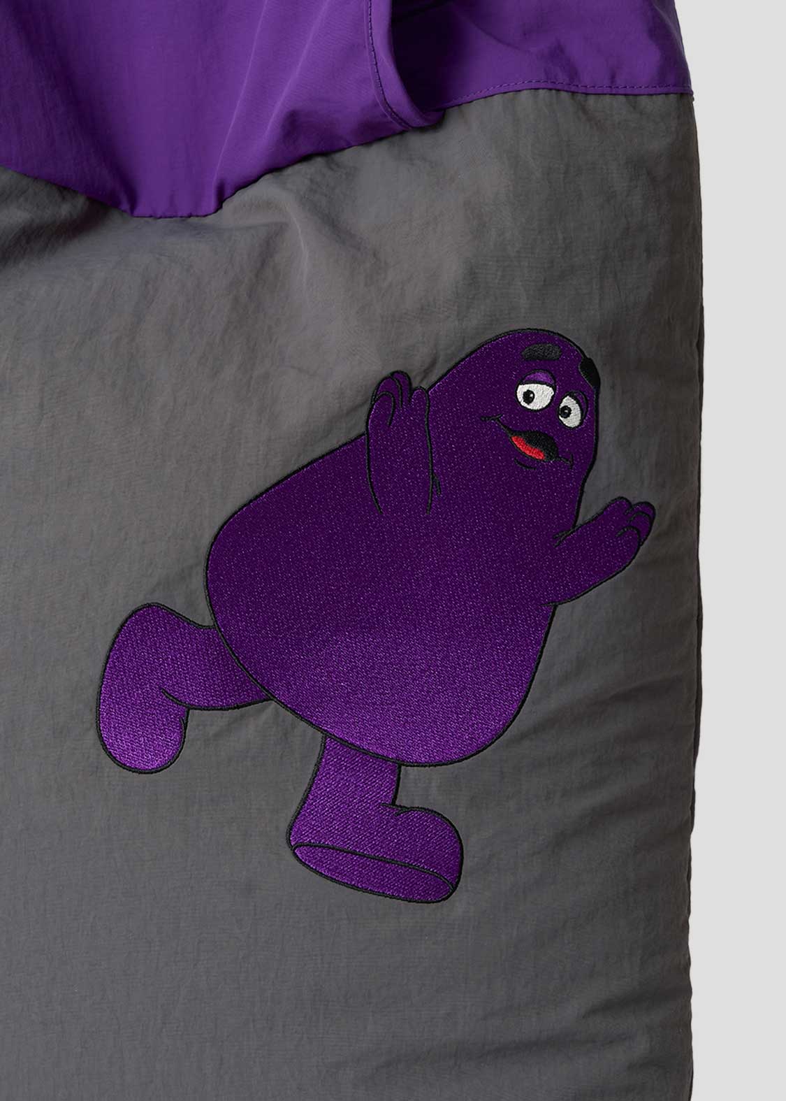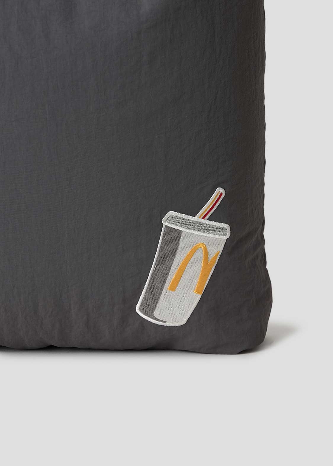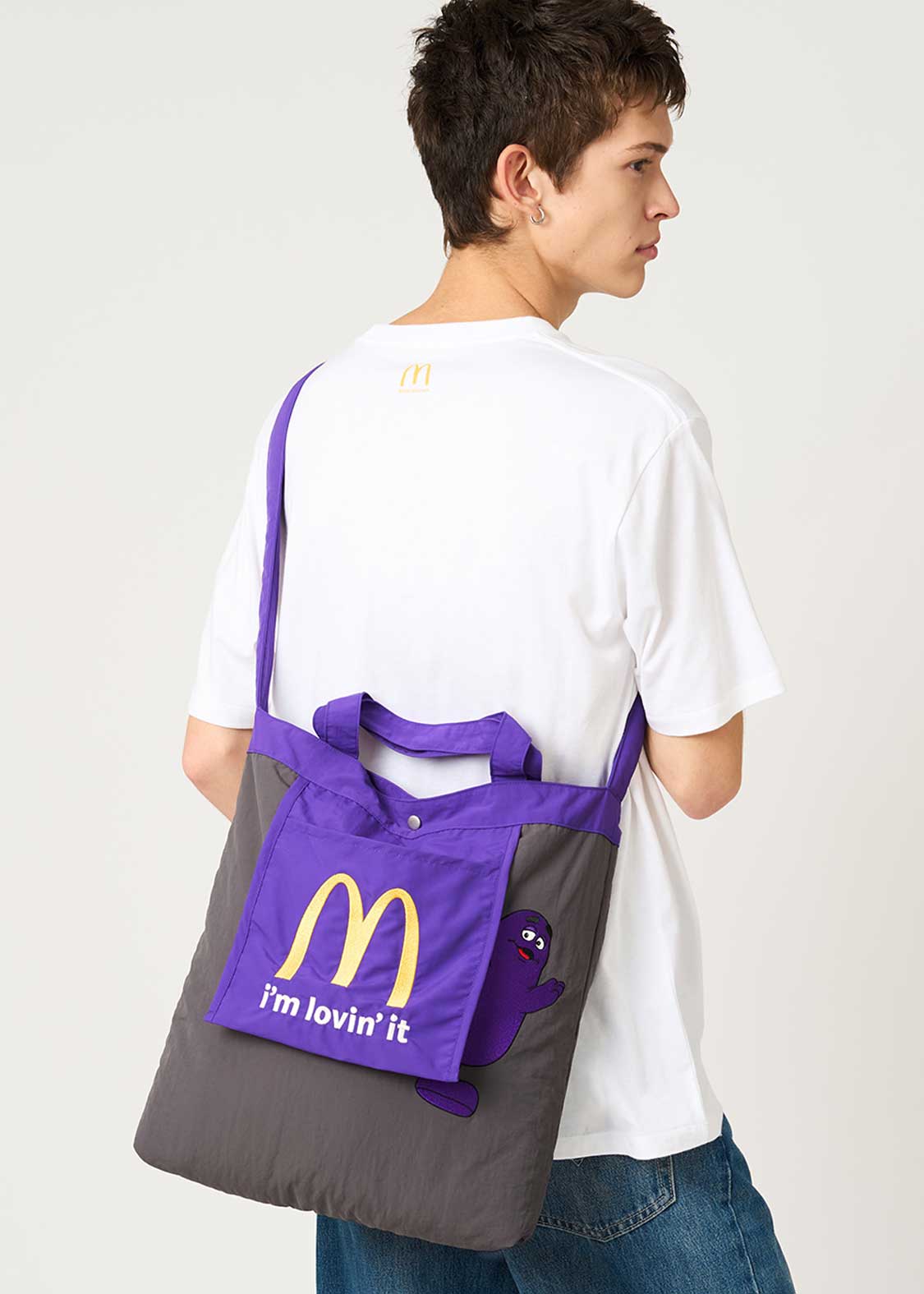 マックシェイクが大好きなキャラクター、グリマスにフィーチャーしたデザイン。ゴールデンアーチ、両手を上げて微笑むグリマス、ドリンクは刺繍で表現しました。グリマスがぐるぐると回っている様子をプリントした内ポケットにも注目です。