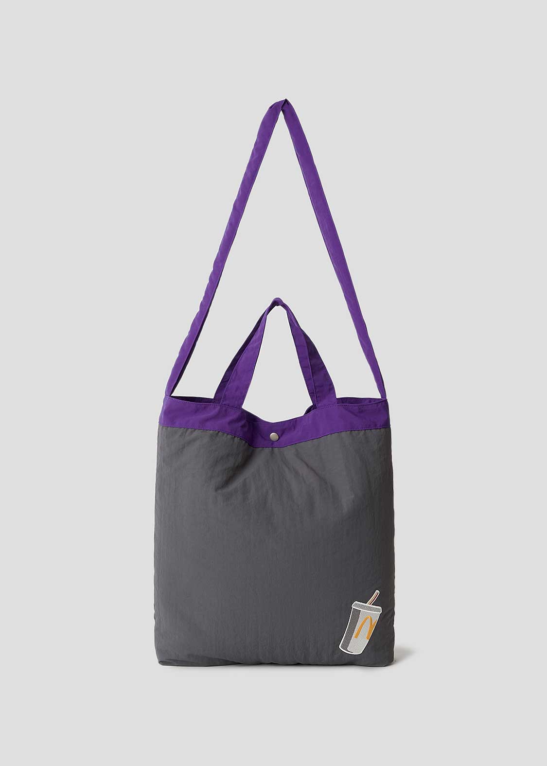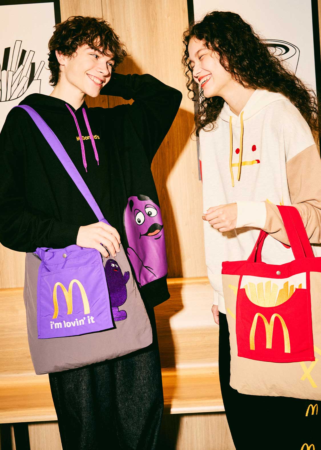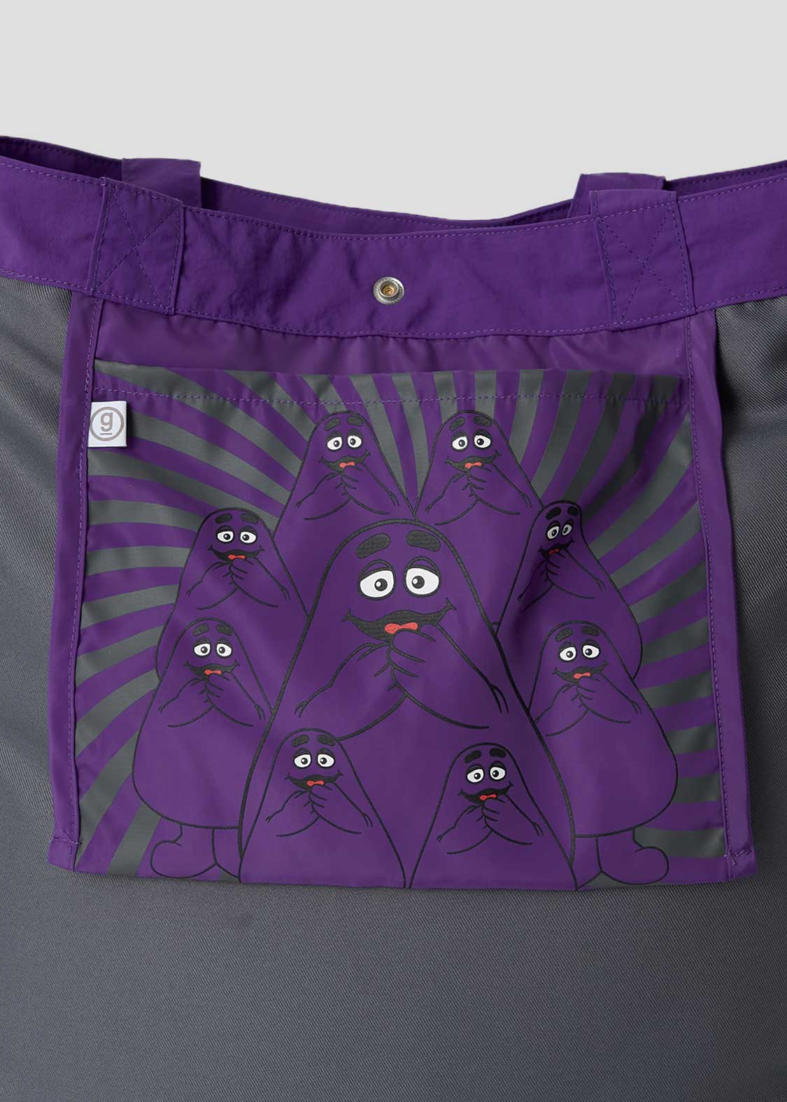 マックシェイクが大好きなキャラクター、グリマスにフィーチャーしたデザイン。ゴールデンアーチ、両手を上げて微笑むグリマス、ドリンクは刺繍で表現しました。グリマスがぐるぐると回っている様子をプリントした内ポケットにも注目です。