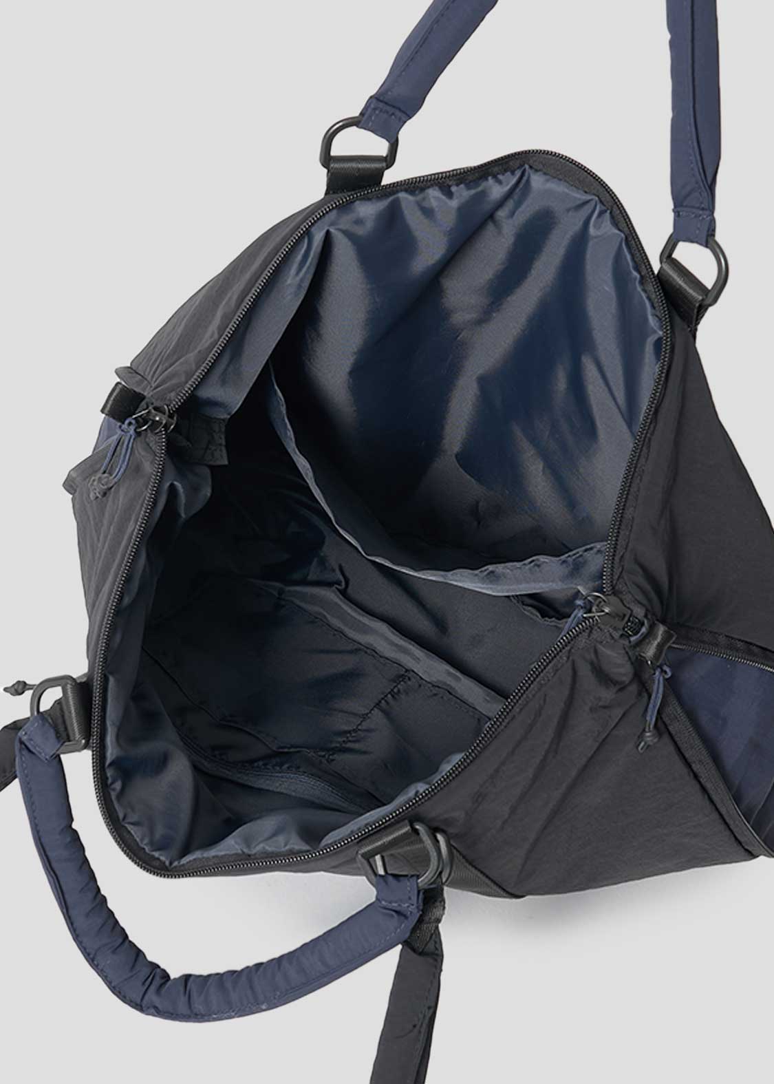 ・内側には荷物を仕分けし易いファスナーポケットとオープンポケット、A4サイズの書類やタブレットを収納可能なオープンポケット。