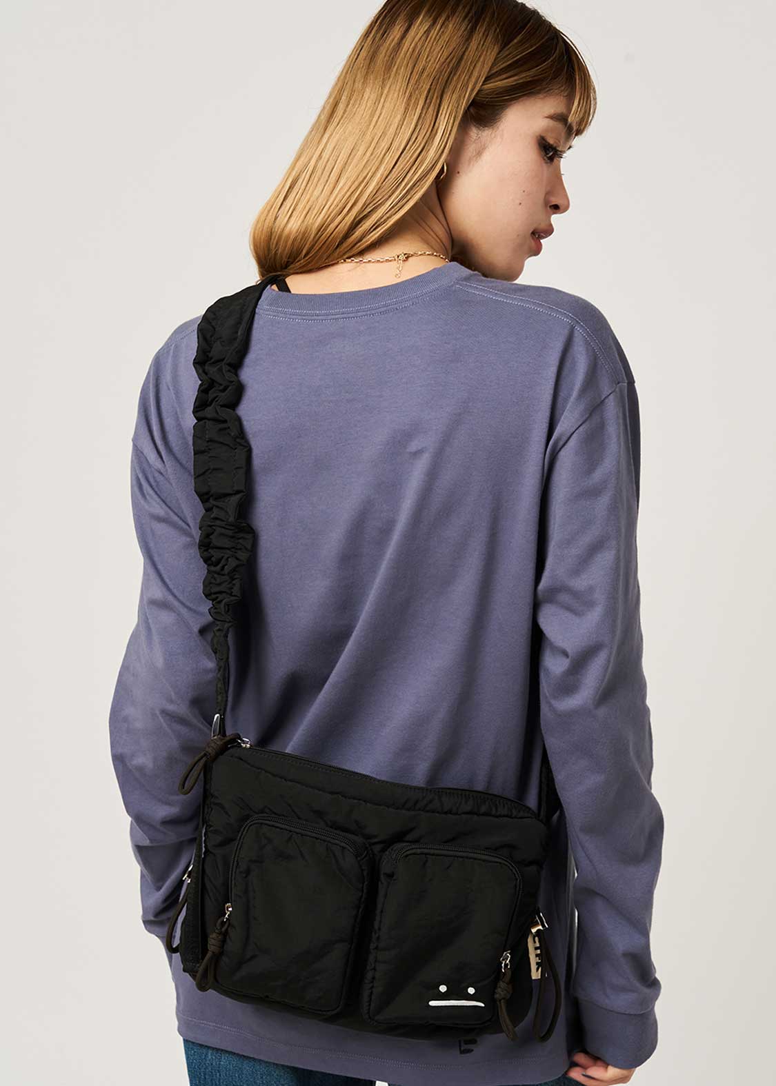 ・ショルダーベルトはスタイルに合わせて長さ調節ができ、ショルダーパッドのギャザーアレンジを楽しめます。