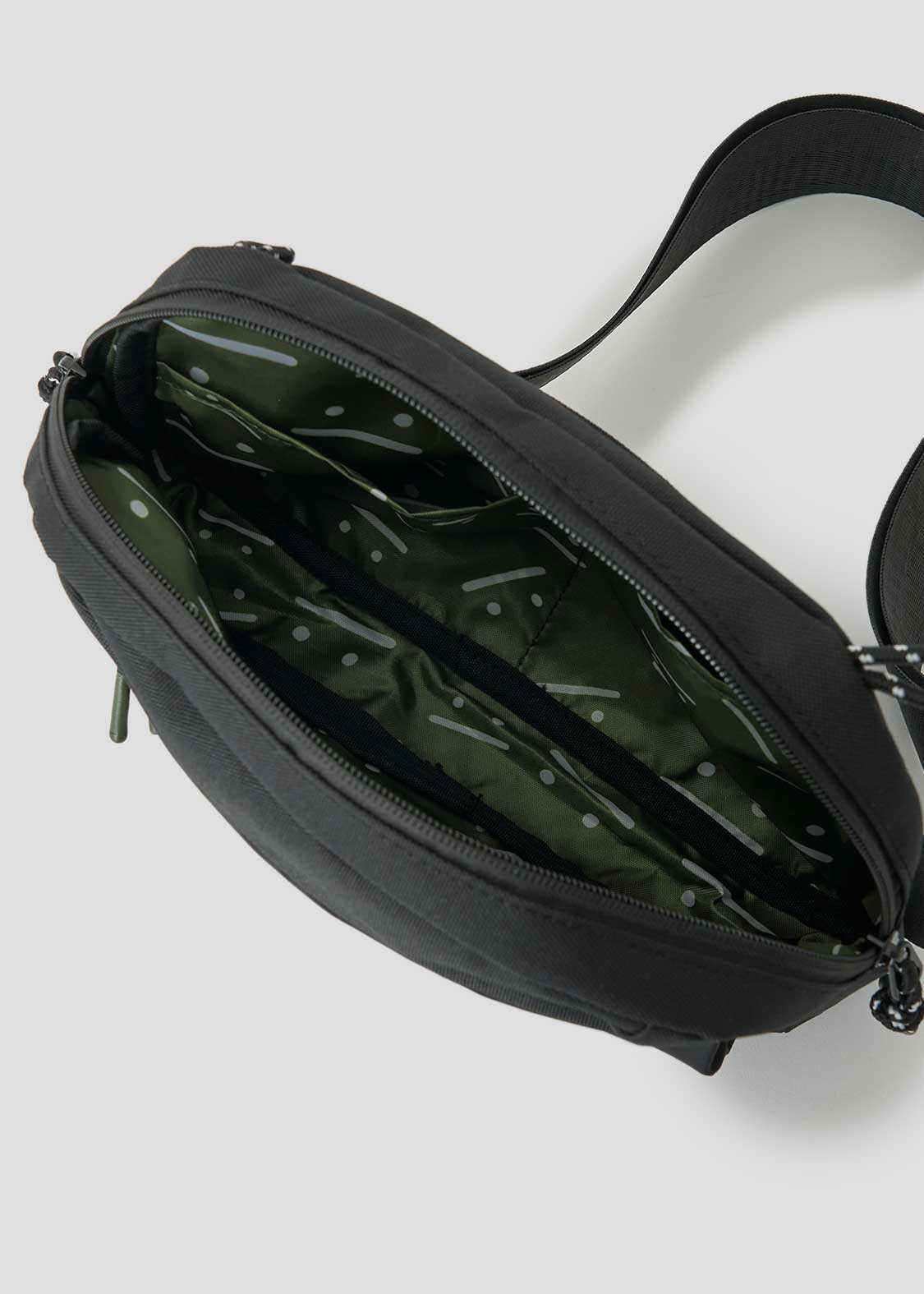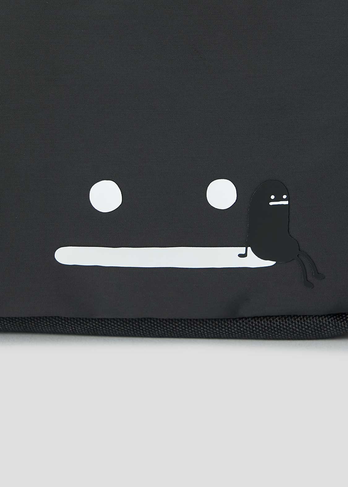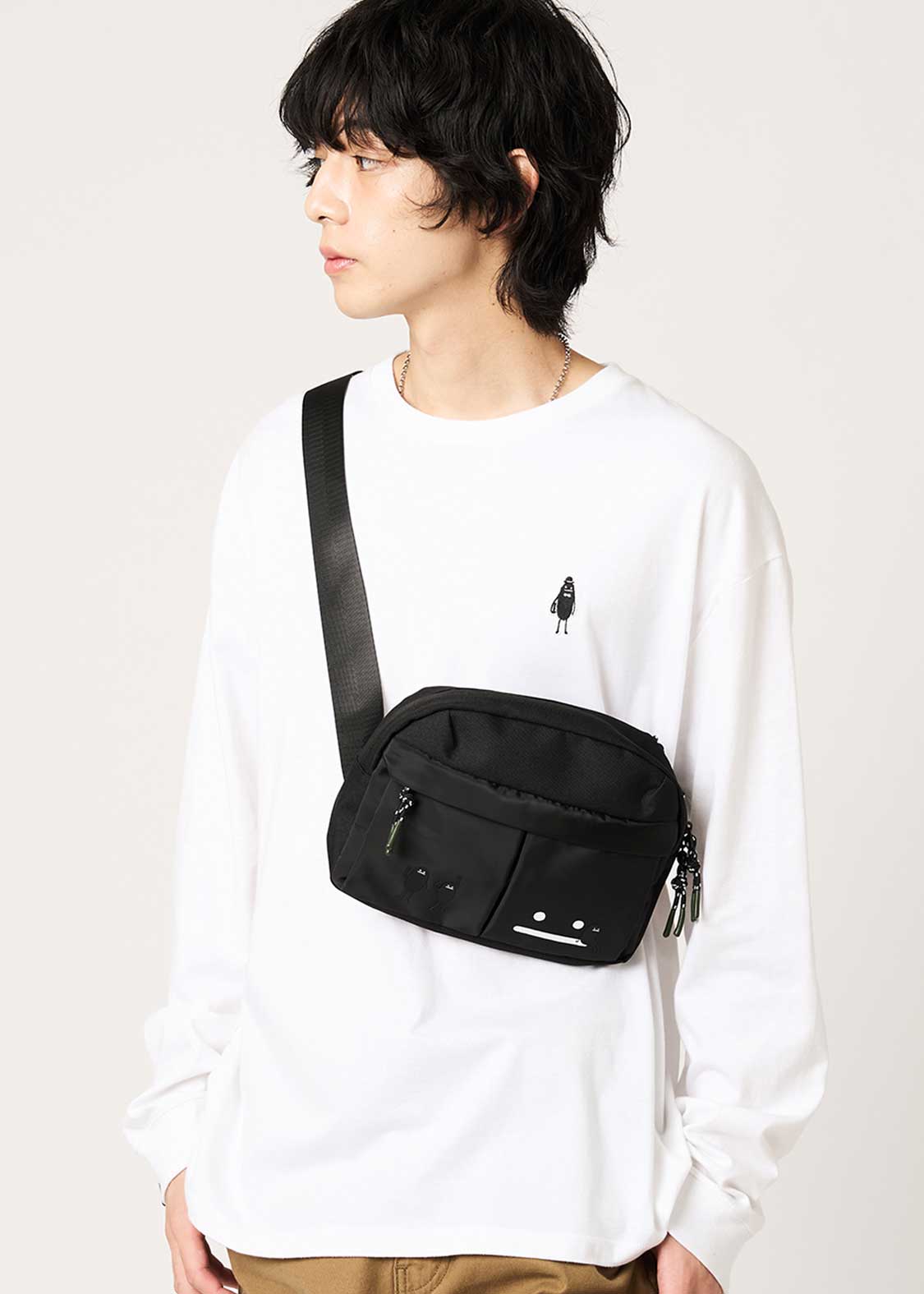 見た目はシンプルな黒ですが、中を開けるとカーキ色の生地にシャドーくんの顔がたくさんあって、とってもかわいく中を開けて一目惚れでした。 コンパクトですが収納力もあって、薄めの財布と携帯を入れてもグラニフのA6のダイアリーが縦に入ります。ダイアリーを持ち運びたかったのでとても嬉しいです。お気に入りのバッグです。