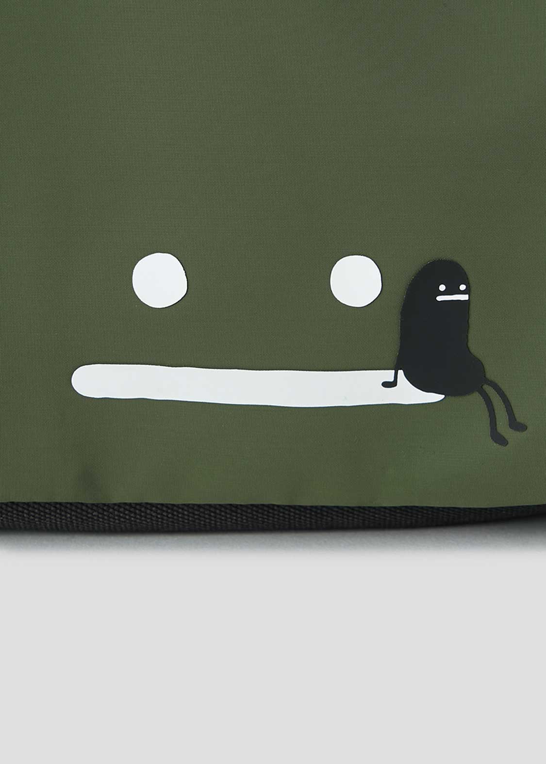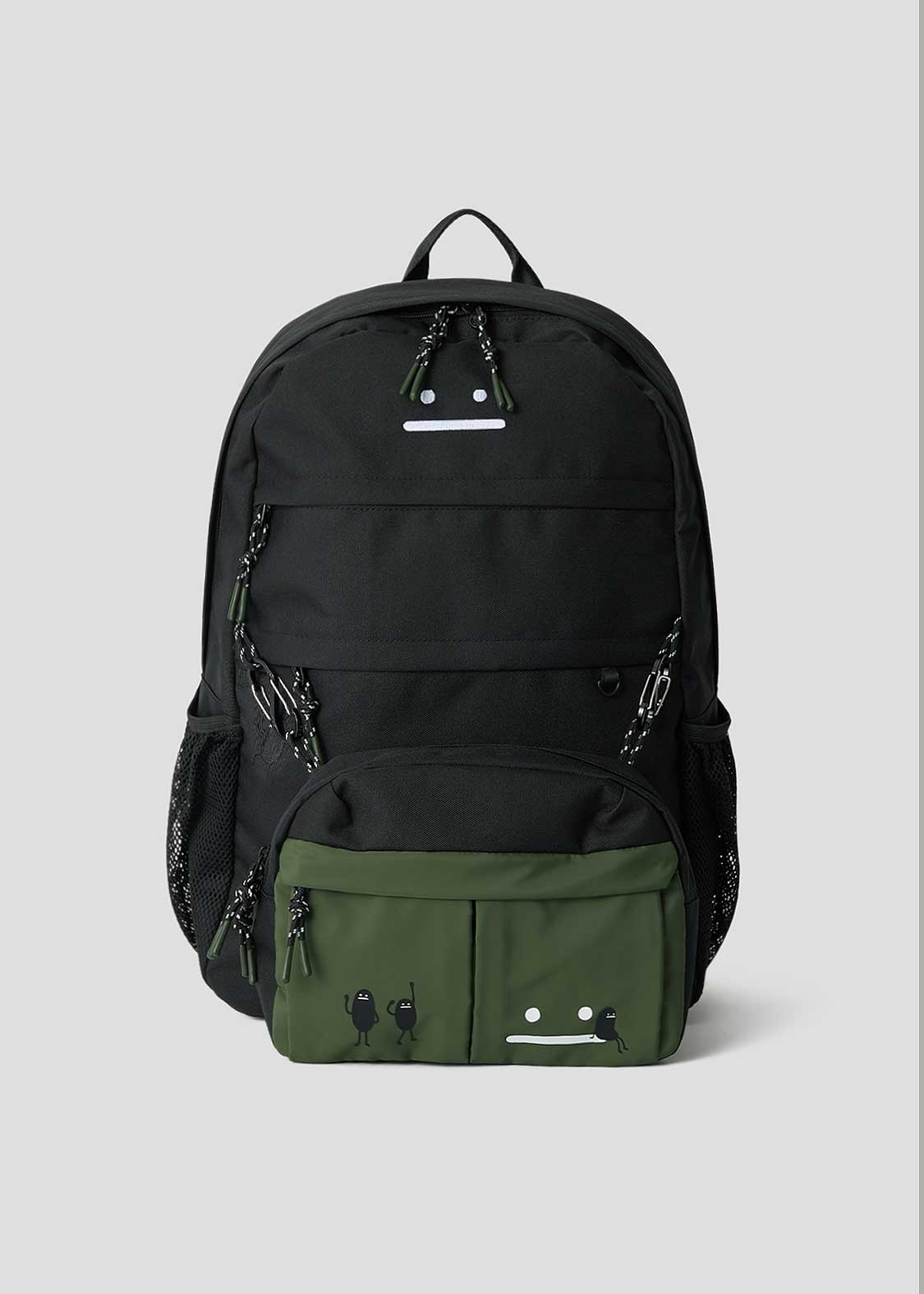 ・背面にはベルトを収納できるポケットがあり、別売りのバックパックのカラビナをループに掛けて取り付け可能です。