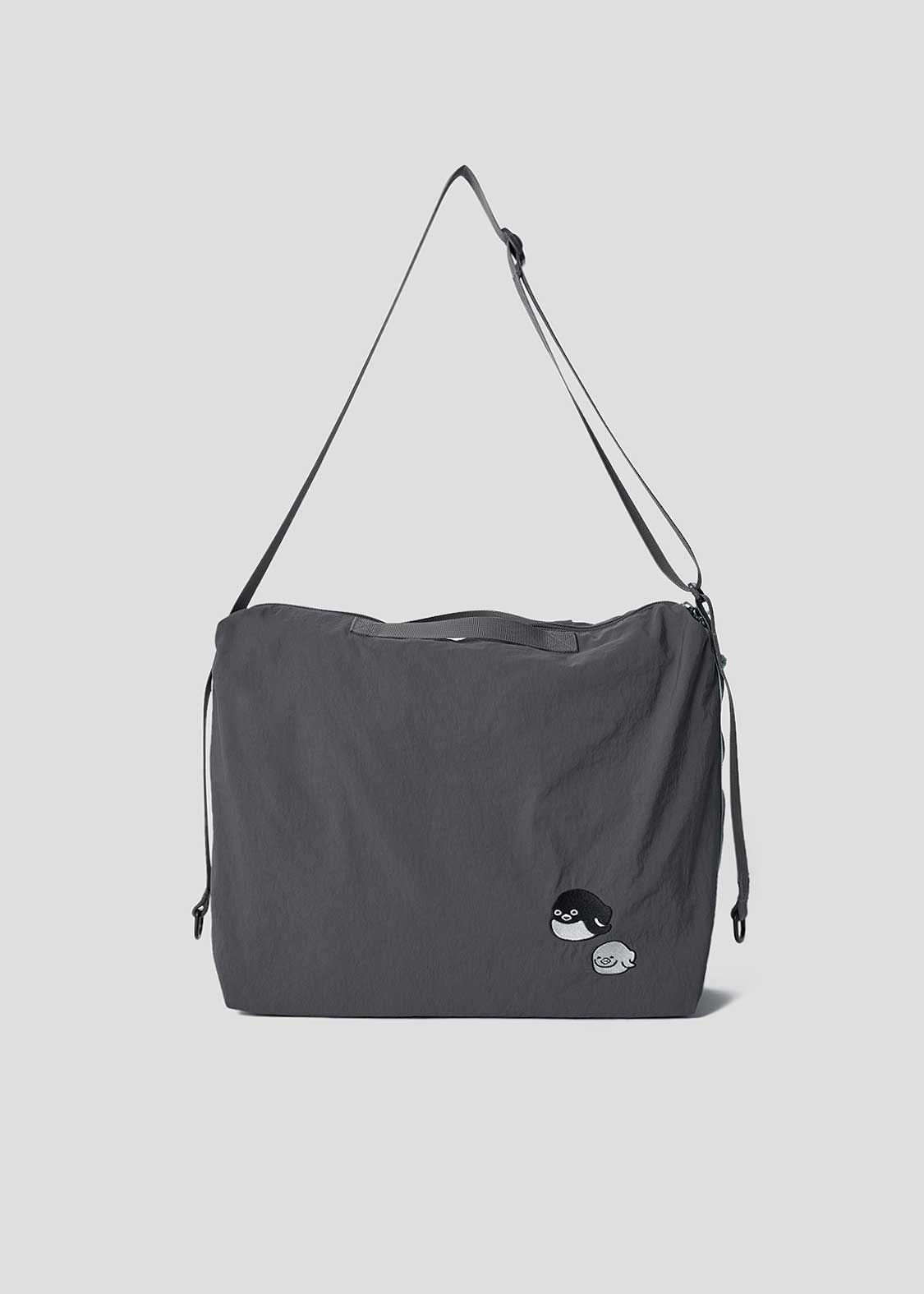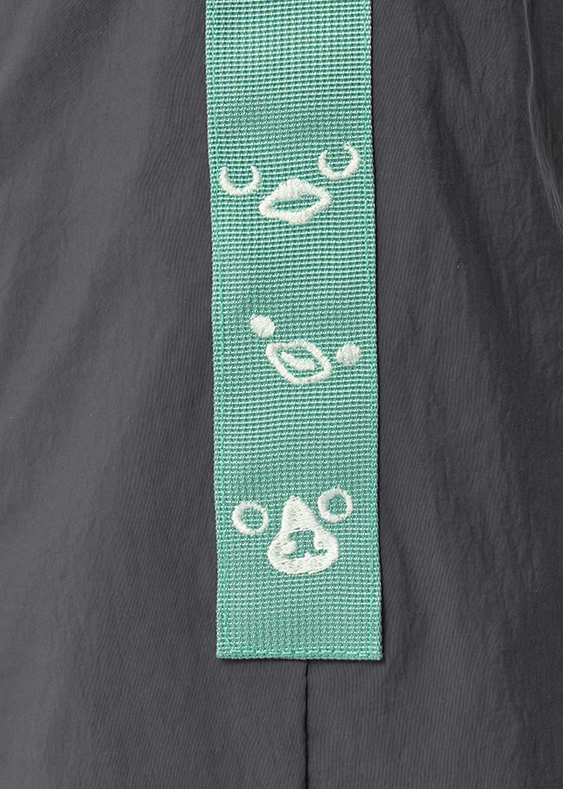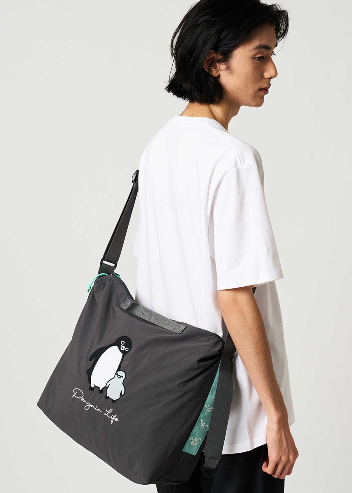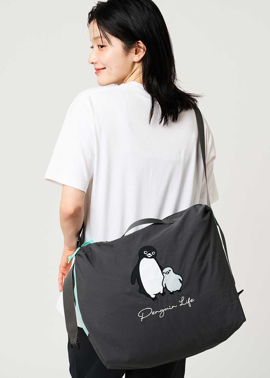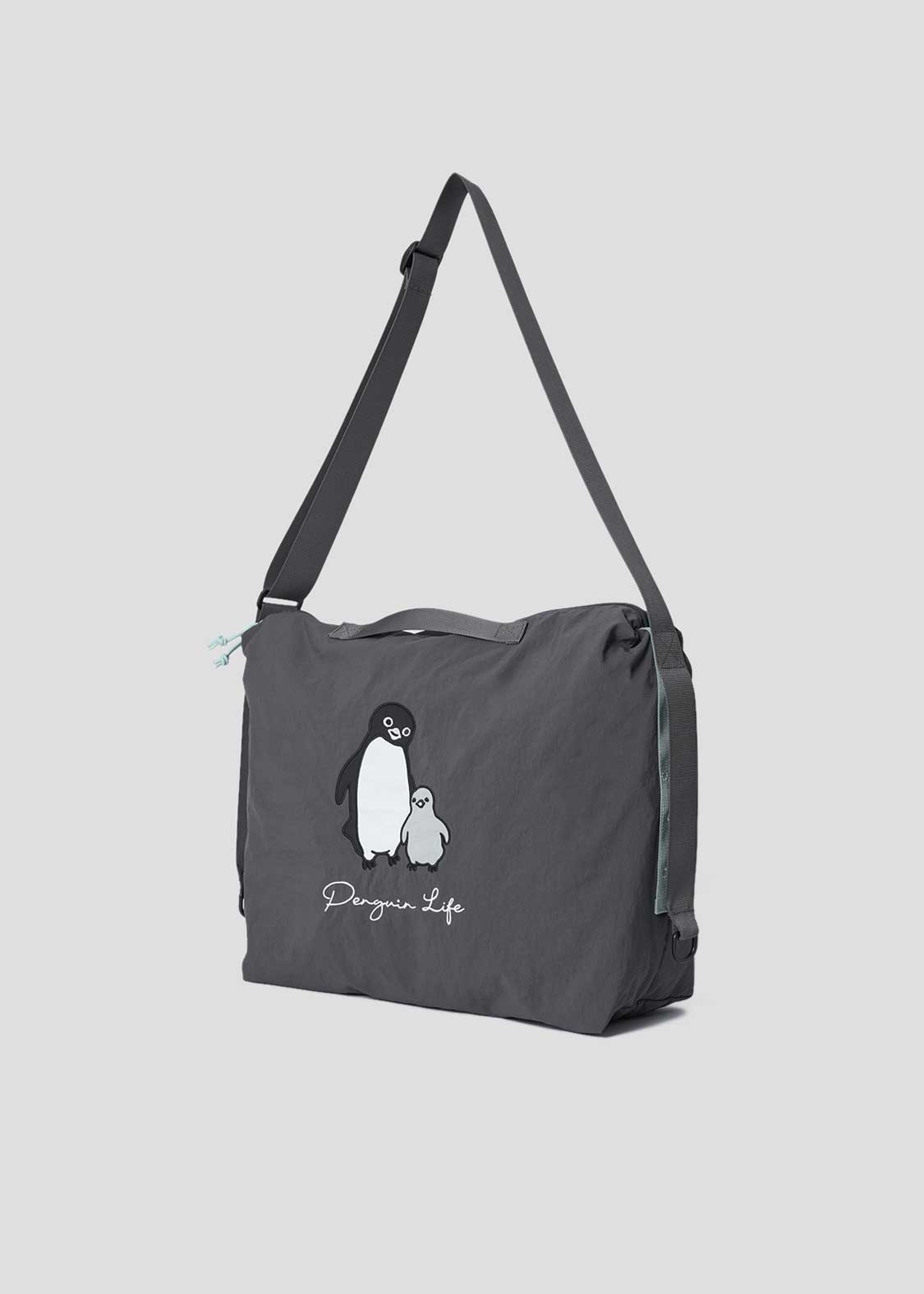 ペンギンとヒナペンギンが寄り添う姿を刺繍とアップリケで表現しました。バックには、うつ伏せでもっちりとした姿になったペンギンとヒナペンギンが刺繍されています。サイドに刺繍されたペンギン、ヒナペンギン、猫の顔にも注目です。
