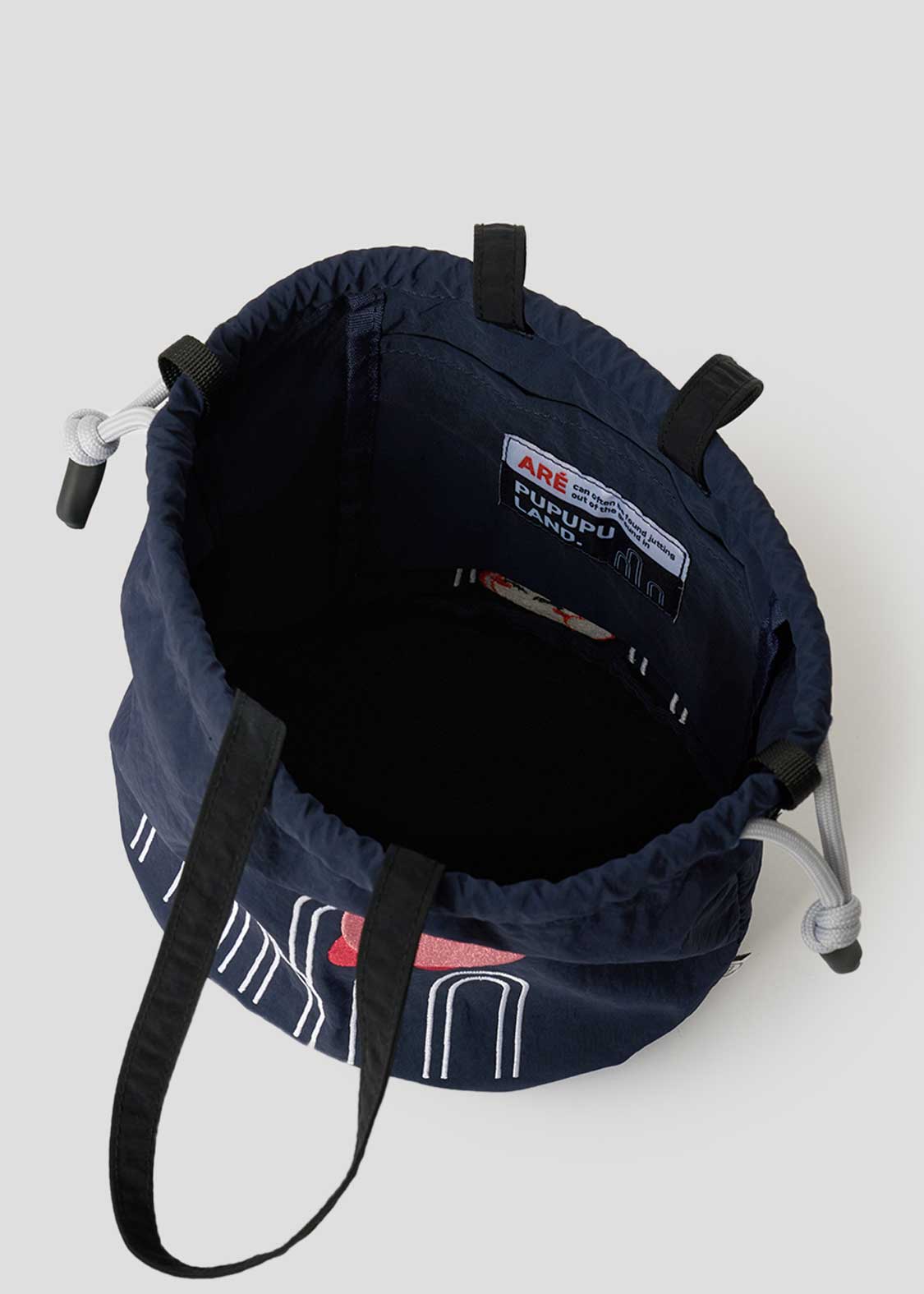 プププランドの地面によく刺さっている「アレ」を背景に、ぷくぷくと飛ぶカービィと転んでしまっているワドルディを刺繍で表現しました。「アレ」の説明が英語で書かれた織りネームをあしらった内ポケットにも注目です。