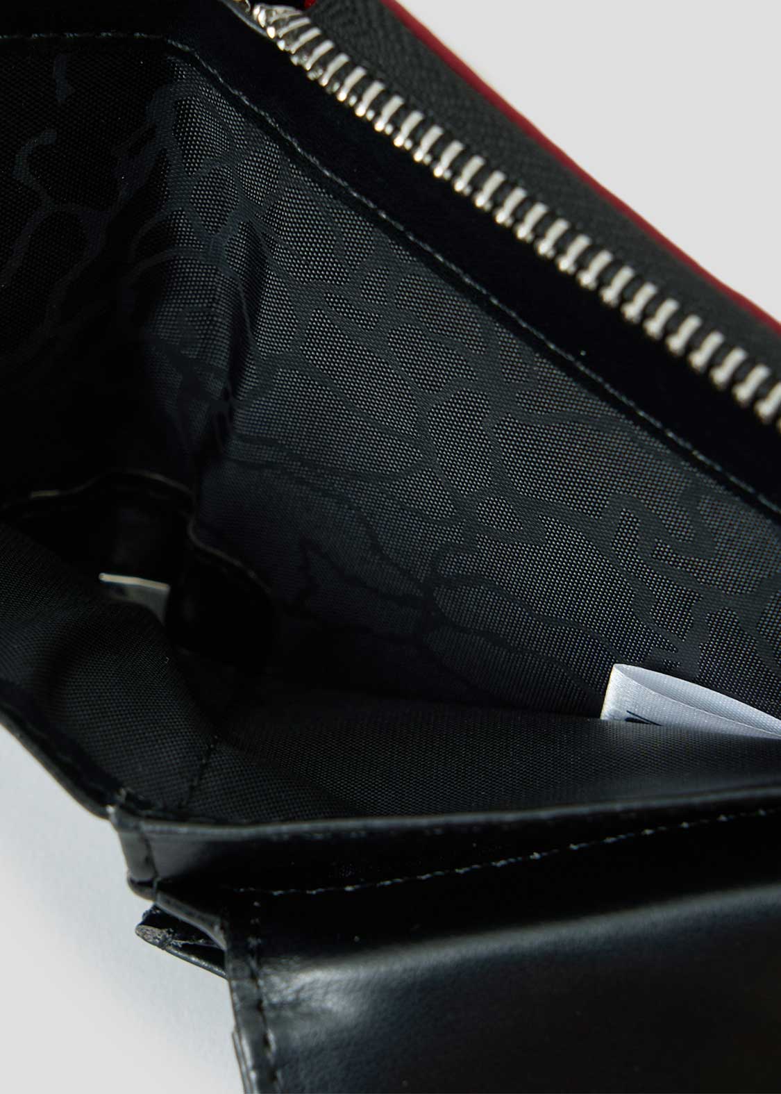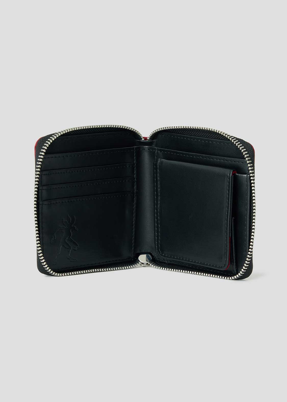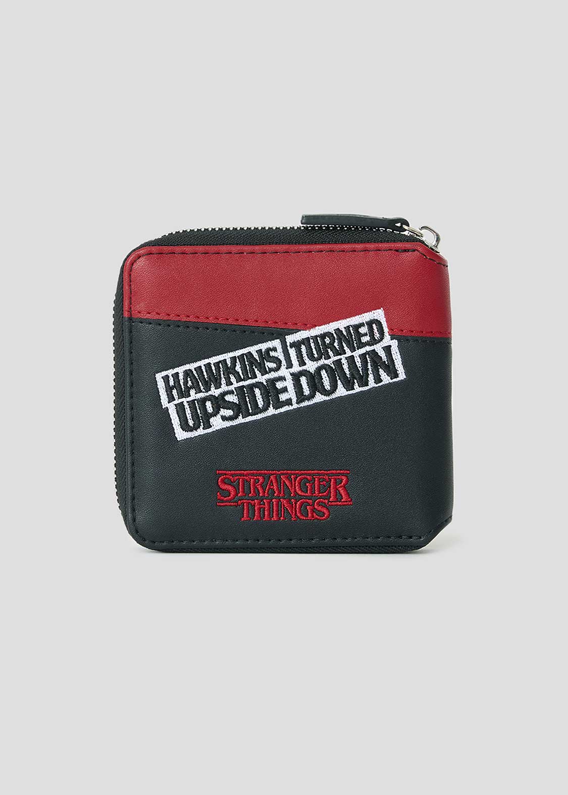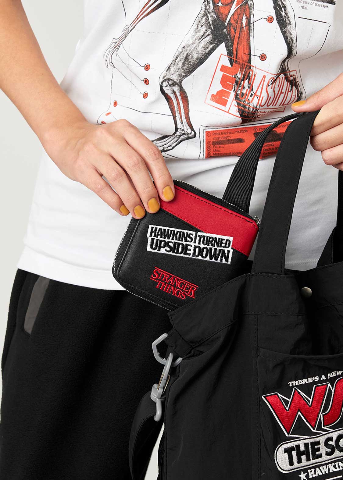裏の世界から顔を覗かせるデモゴルゴンをアップリケ刺繍したデザイン。コインケースの内側にはマインドフレイヤー、お札入れの内側にはホーキンスの街に張り巡らされたマップトンネルがプリントされています。