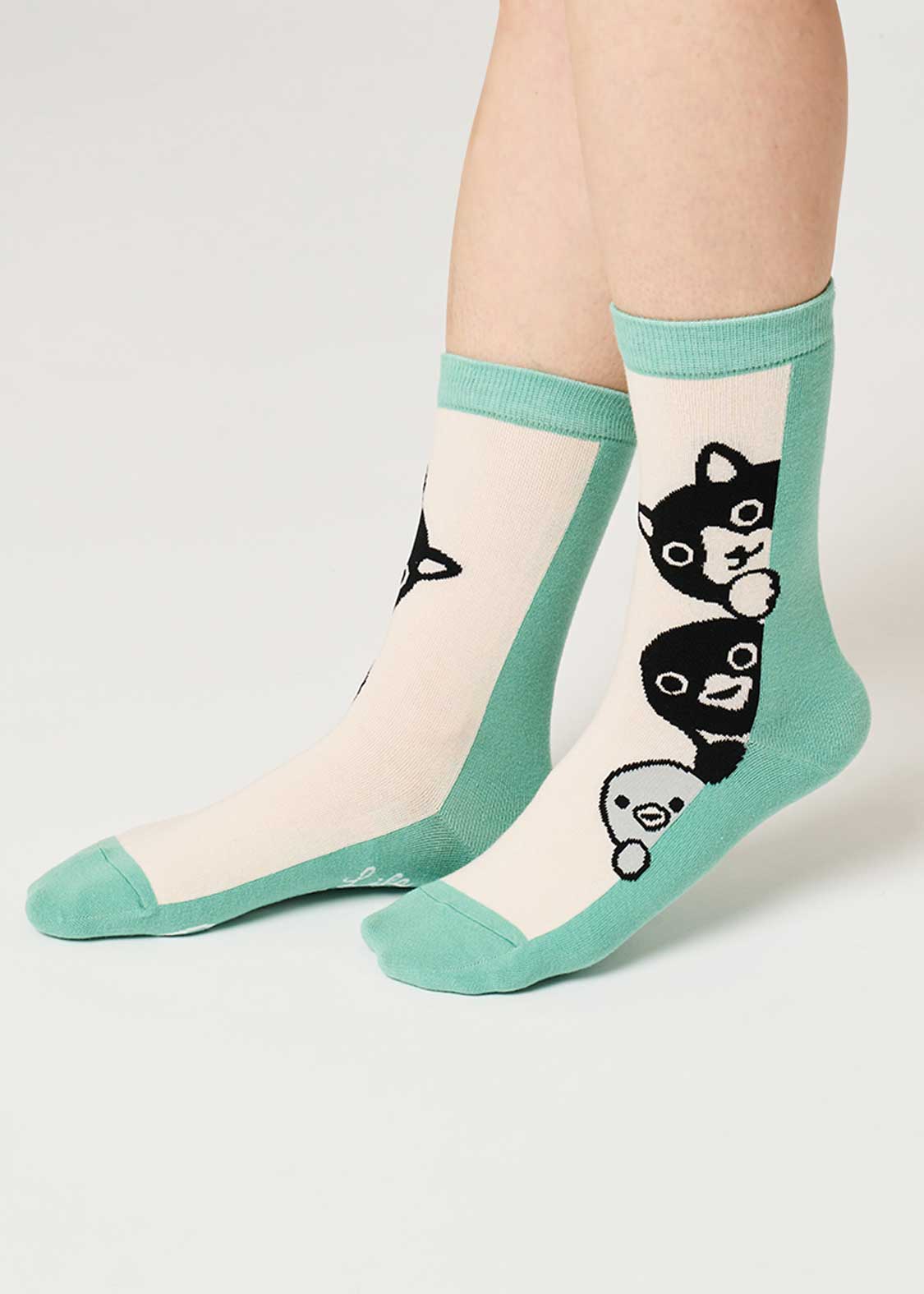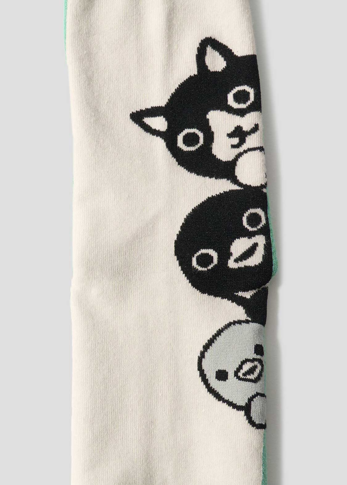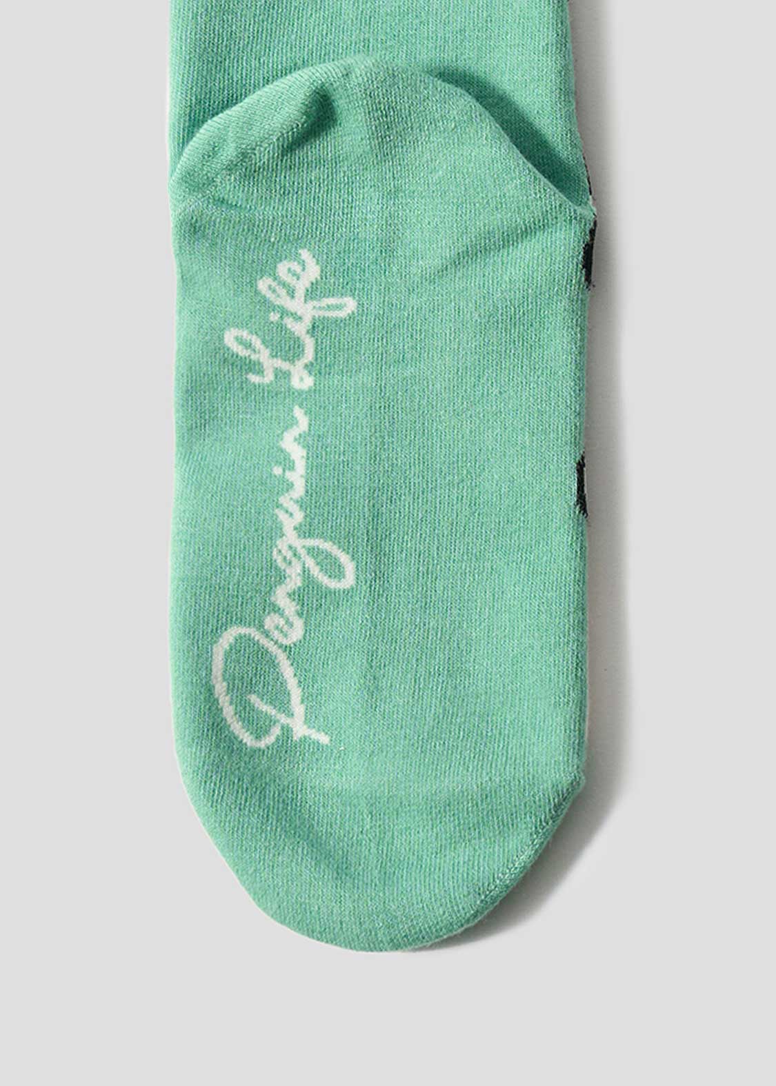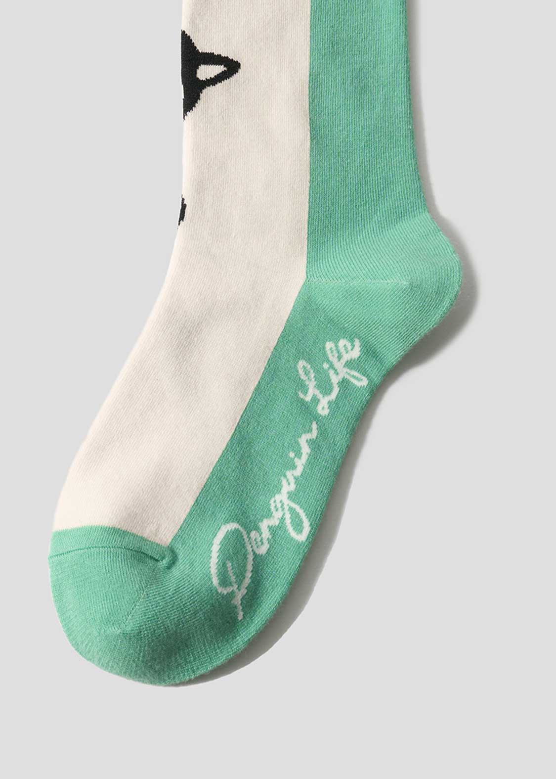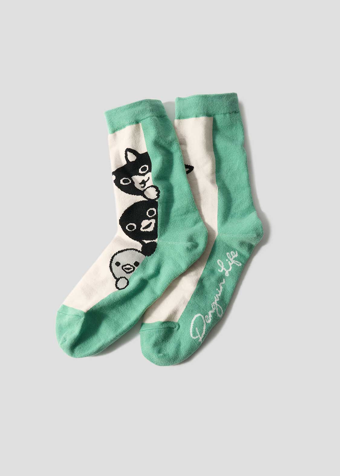 トーテムポールのように顔をのぞかせる猫、ペンギン、ヒナペンギンをジャカード編みで表現しました。足の裏のPenguin Lifeの文字にも注目です。
