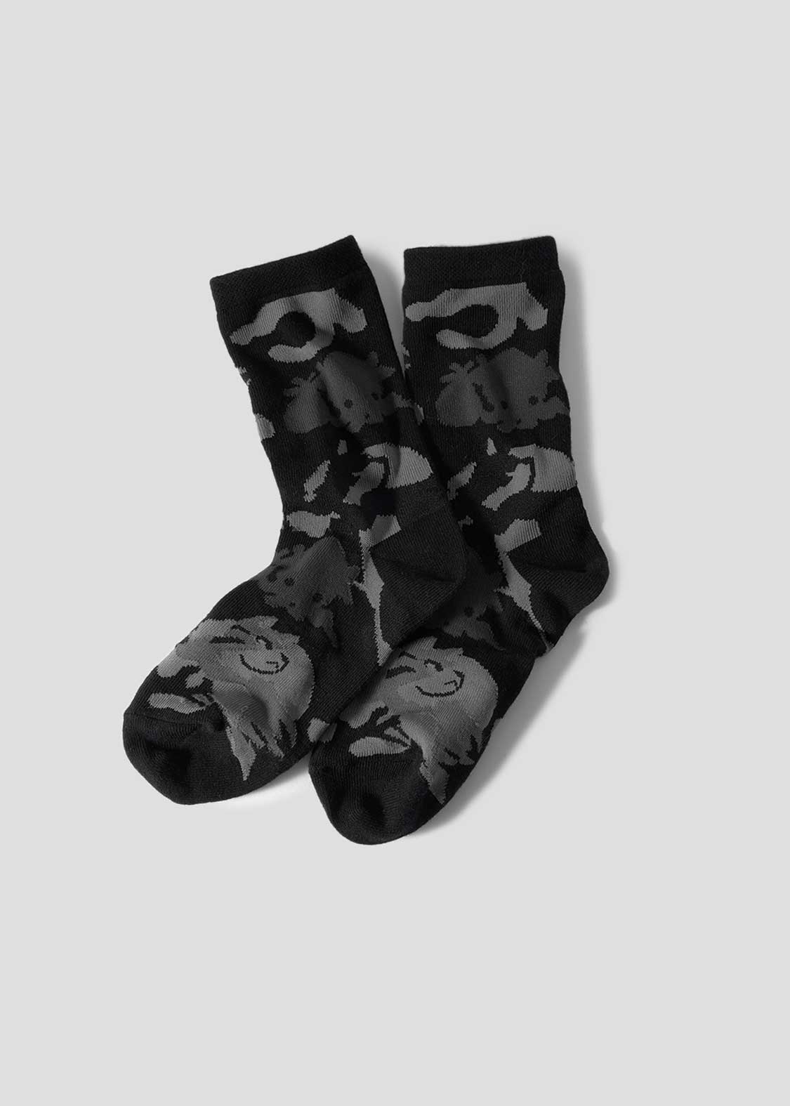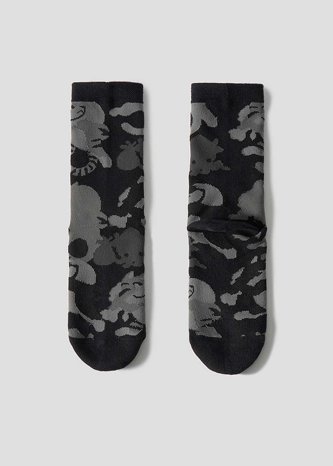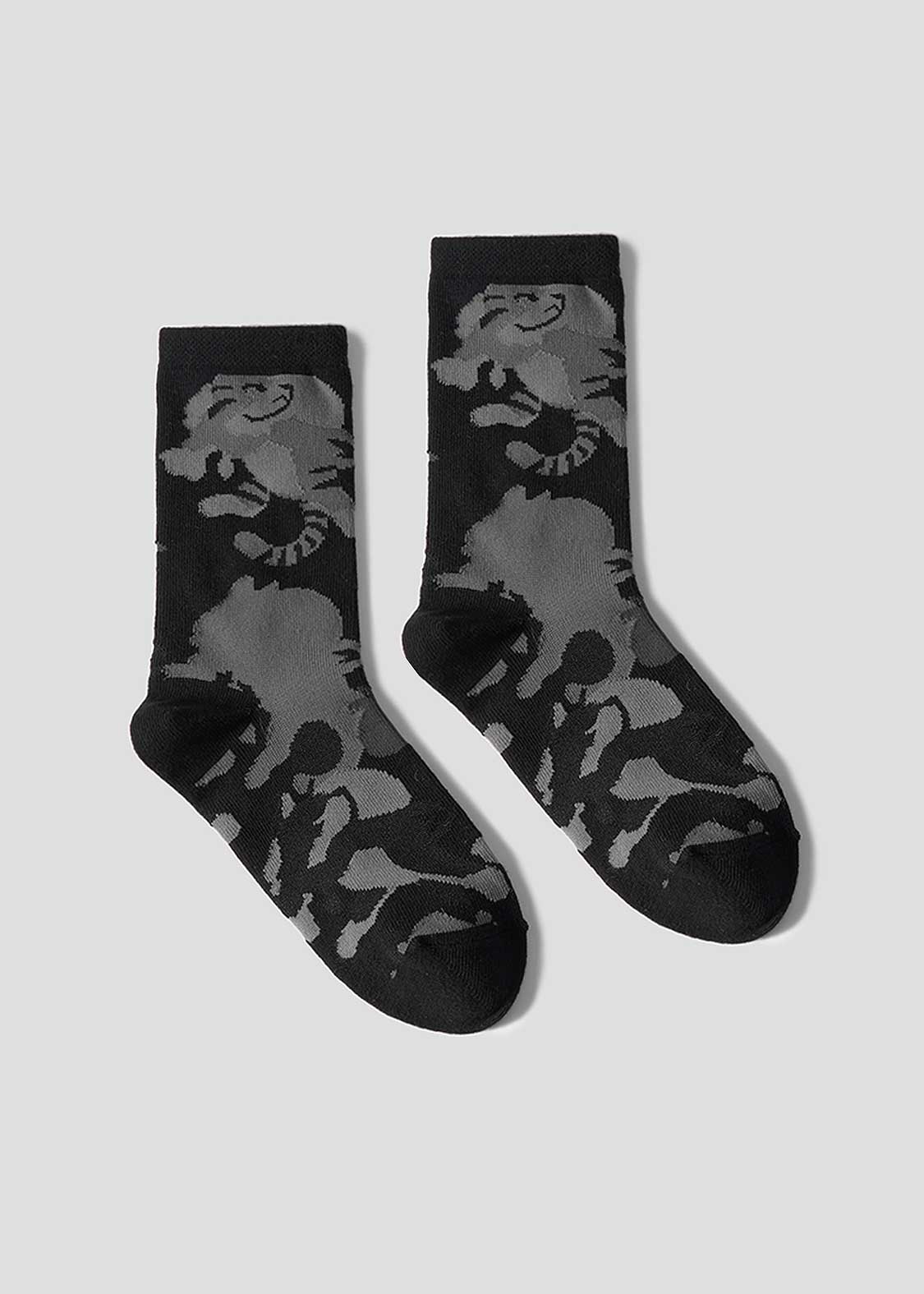 「オクトパストラベラー」各シリーズより。出現率が低いレアモンスターのキャットリンとオクトリンのシルエットをパターンにしたデザイン。これを履けば勉強や仕事の経験値アップや臨時収入が入るかも?