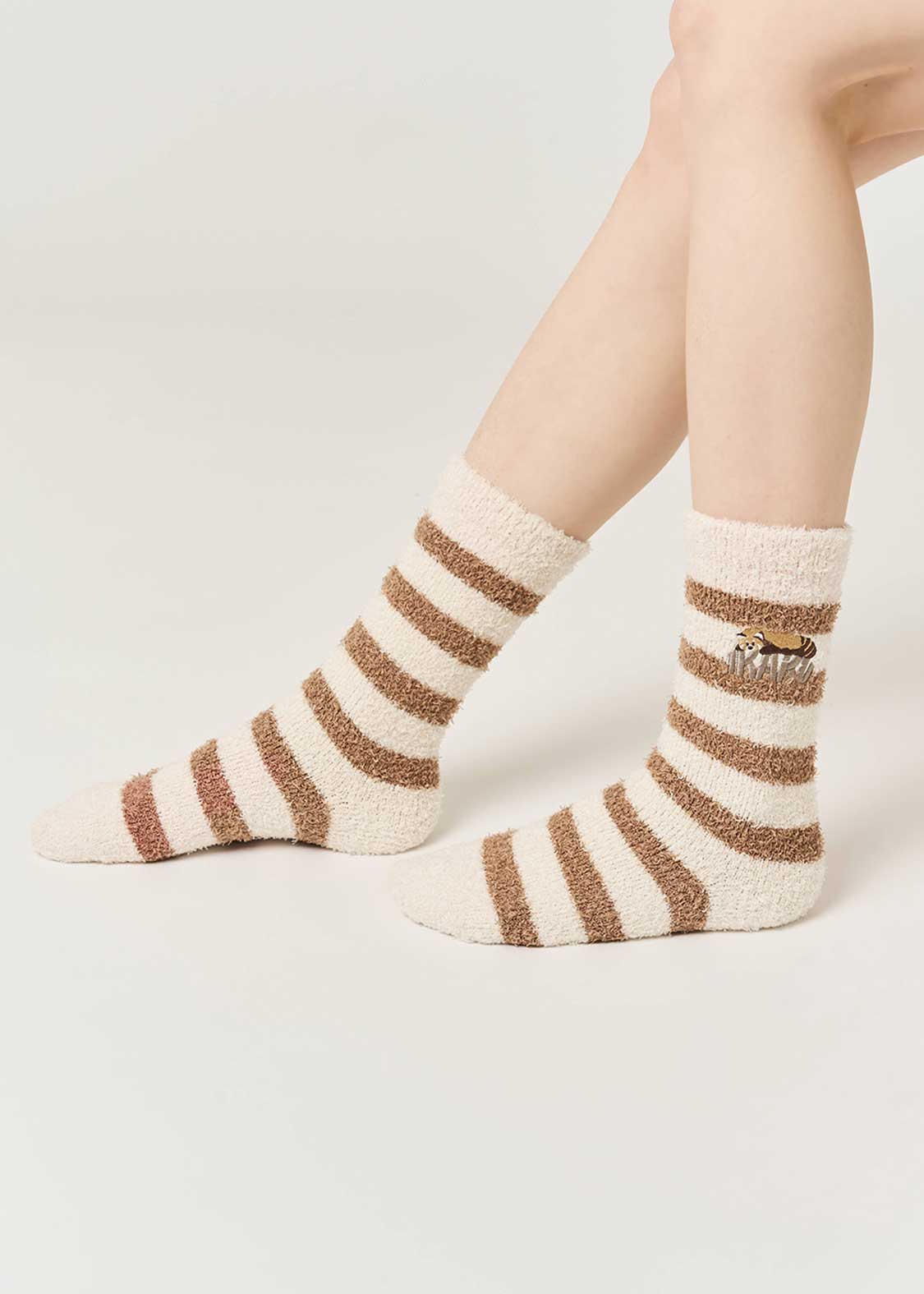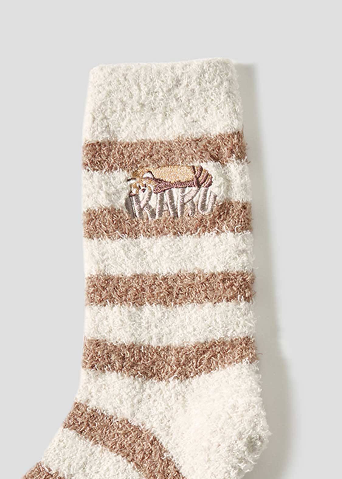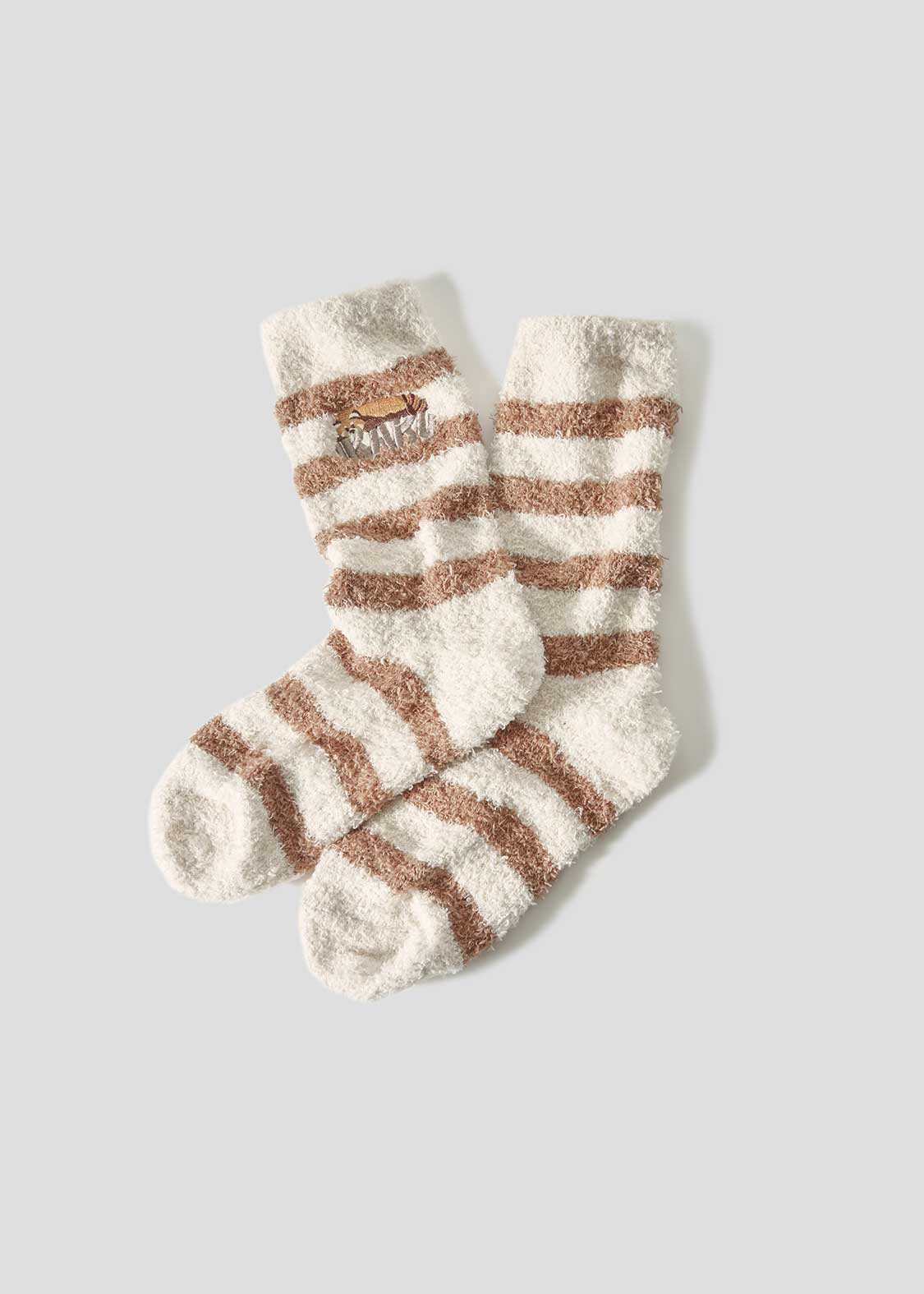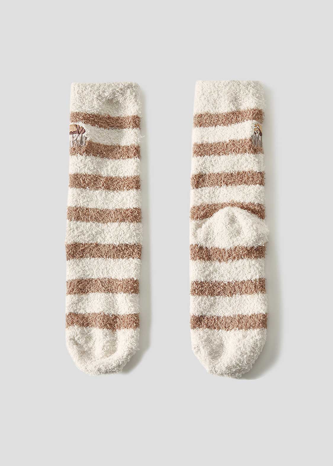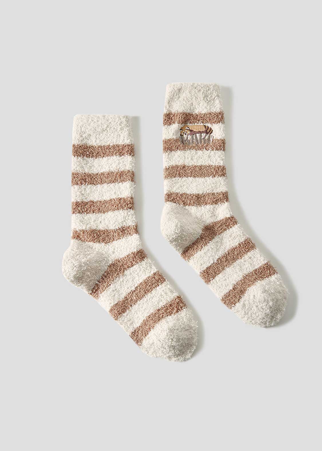 ・細かなグラフィックをジャカードで表現した、ロング丈のルームソックス。