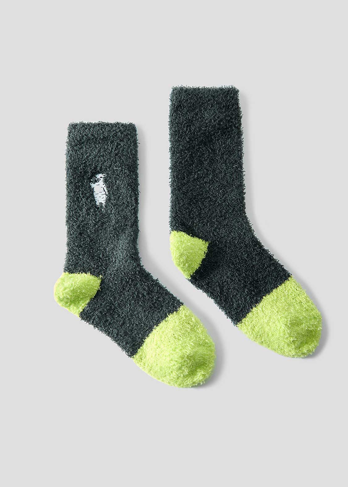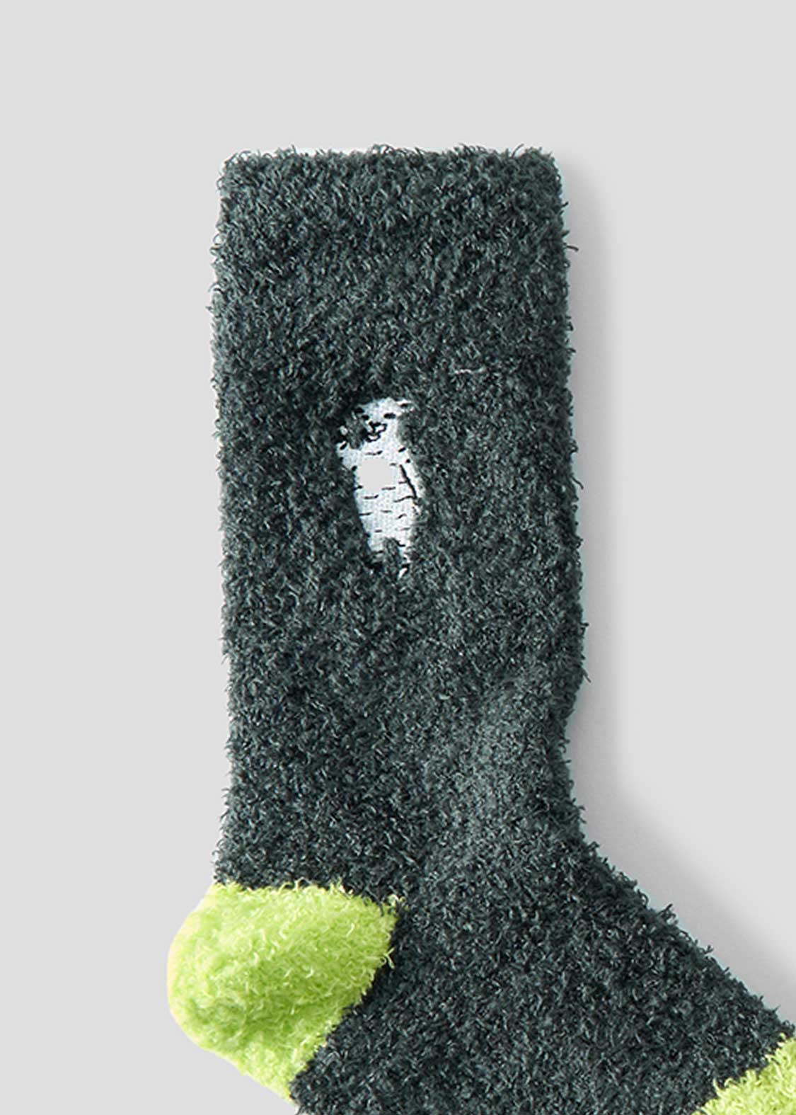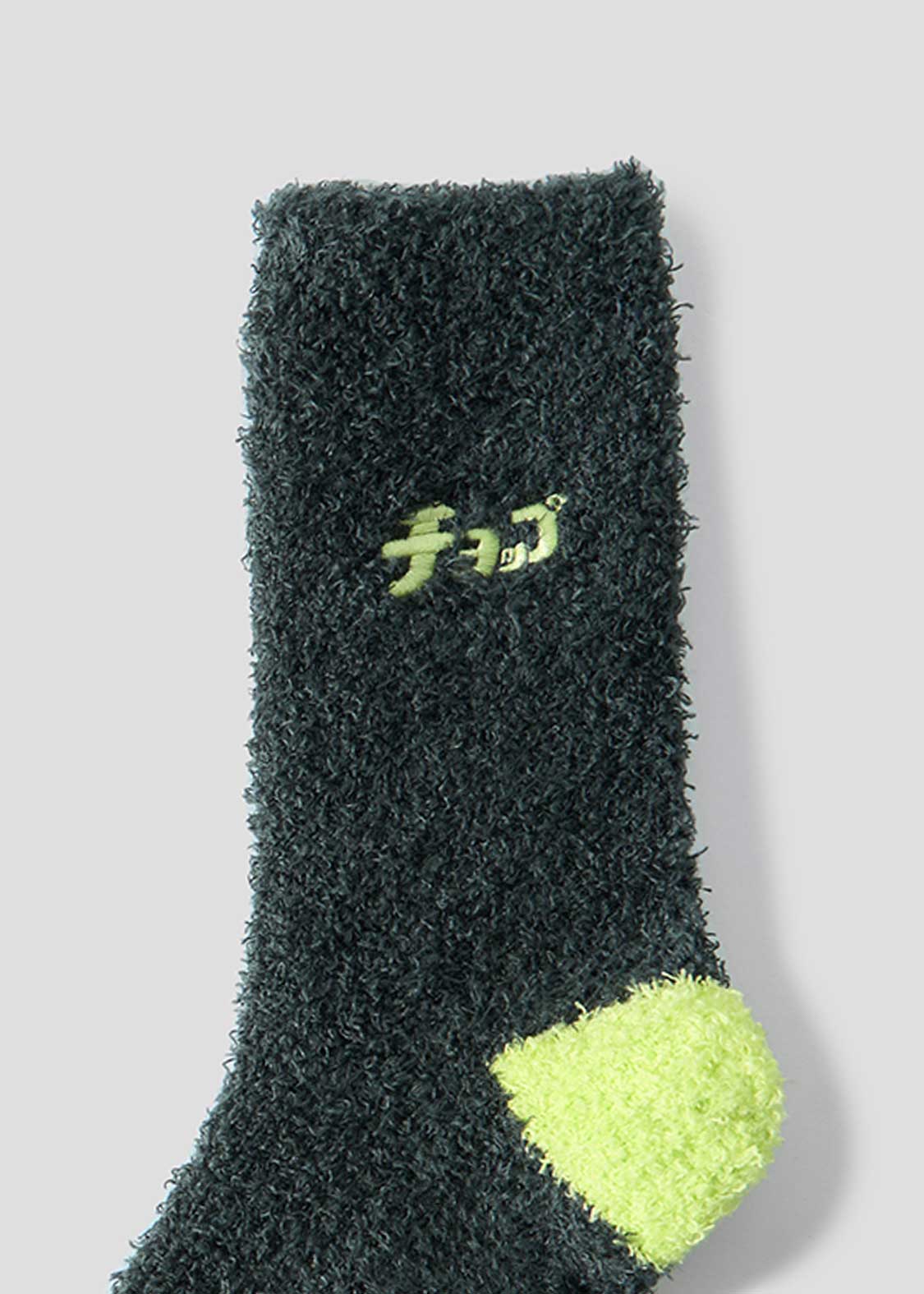 ・細かなグラフィックをジャカードで表現した、ロング丈のルームソックス。