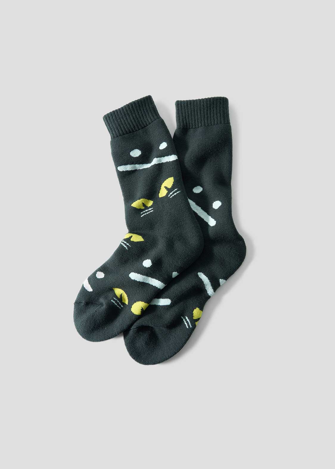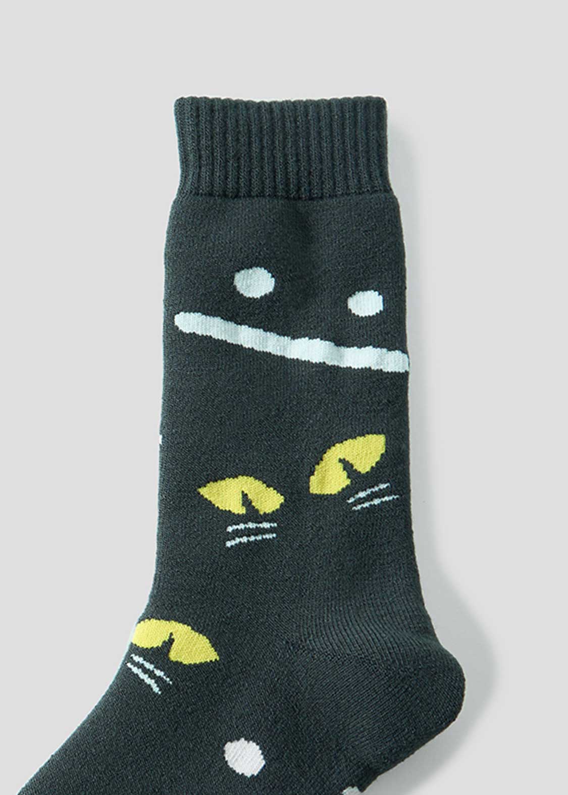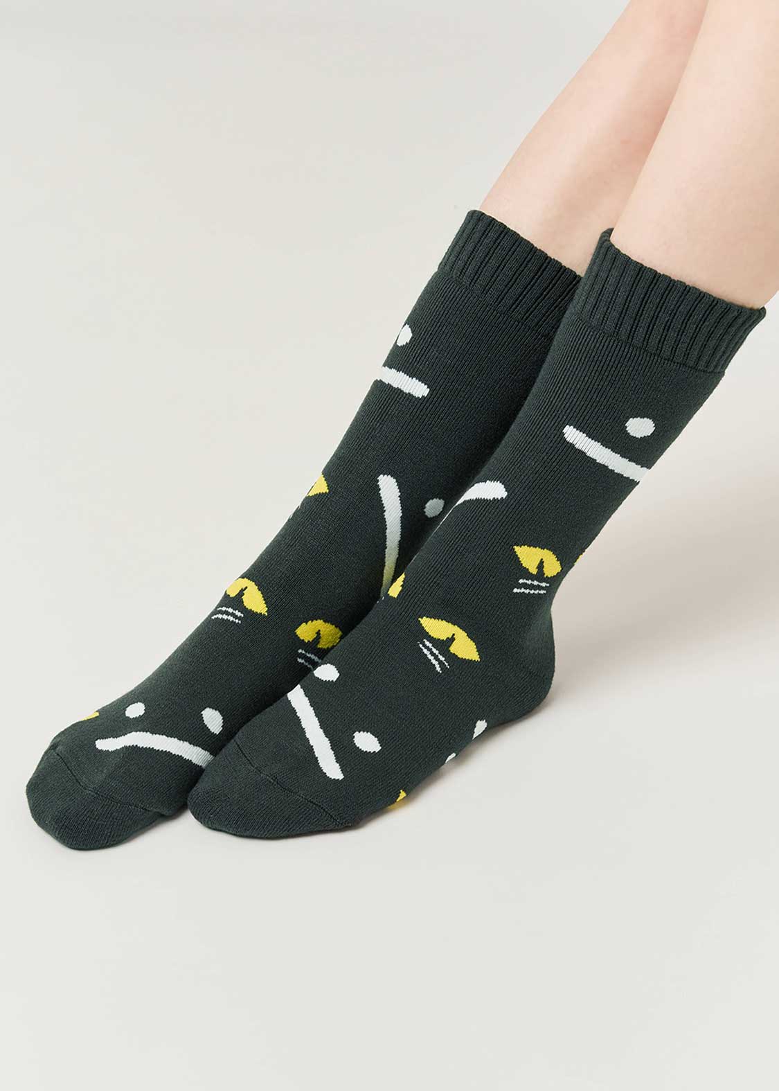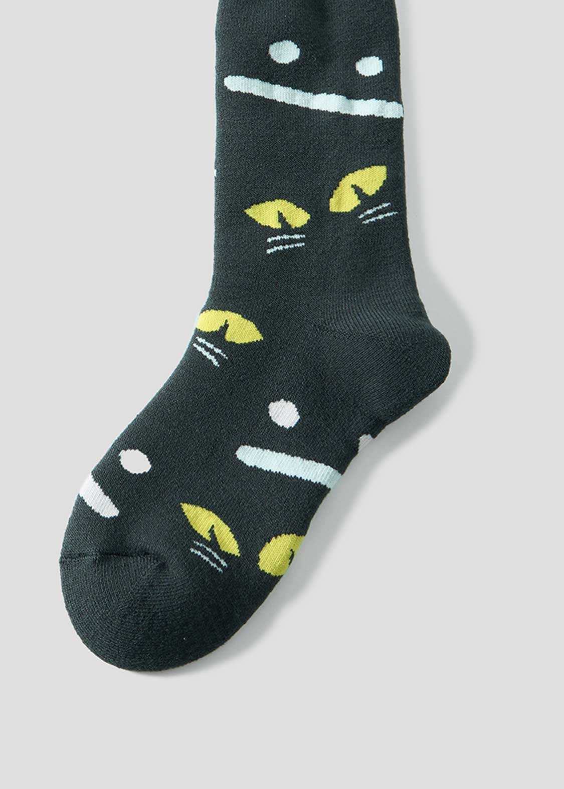 ・細かなグラフィックをジャカードで表現した、ロング丈のルームソックス。