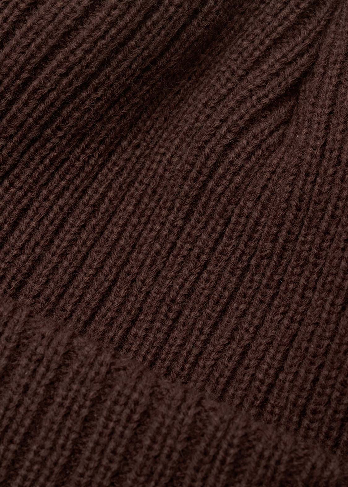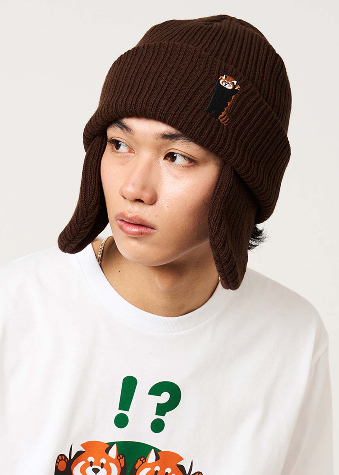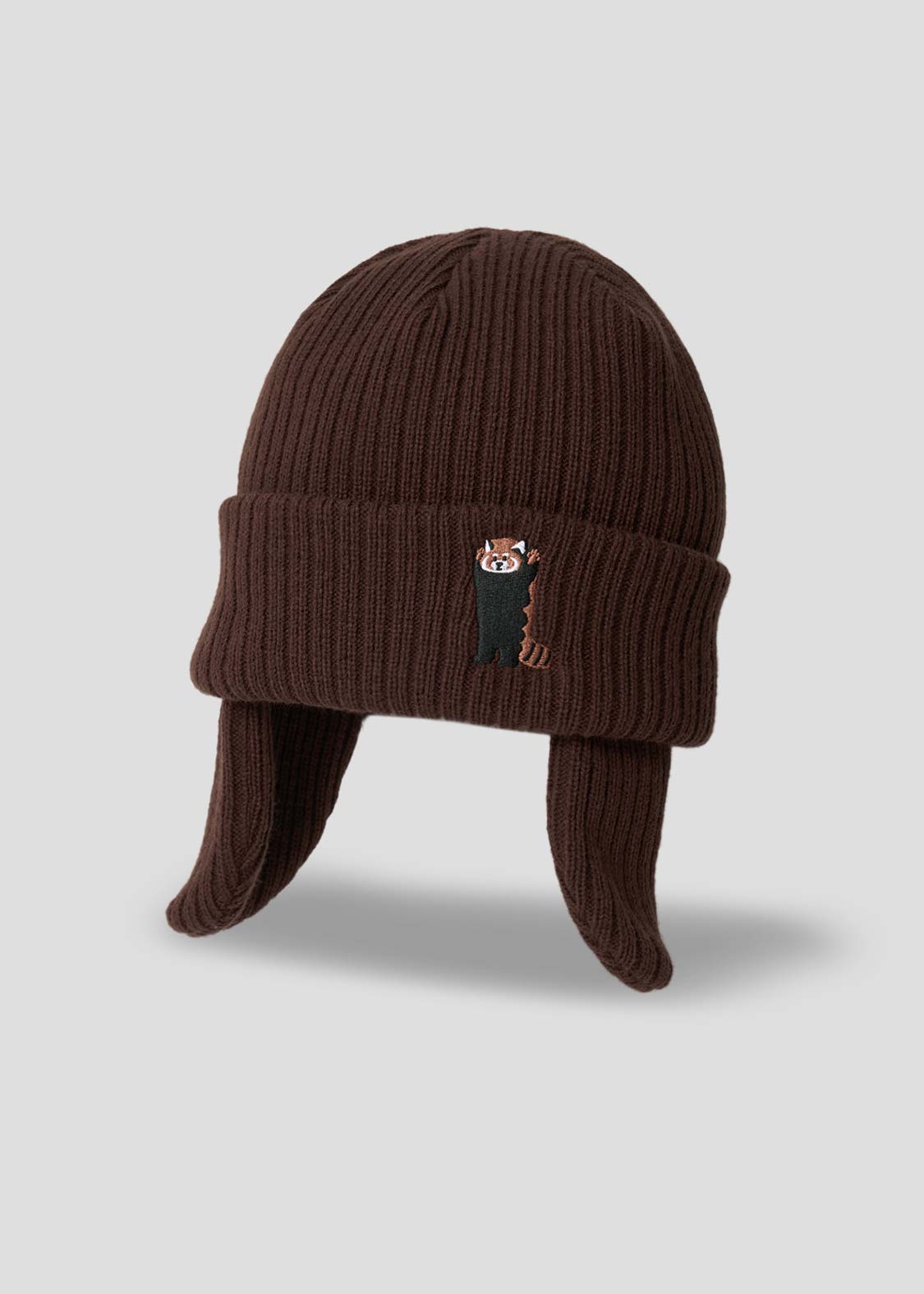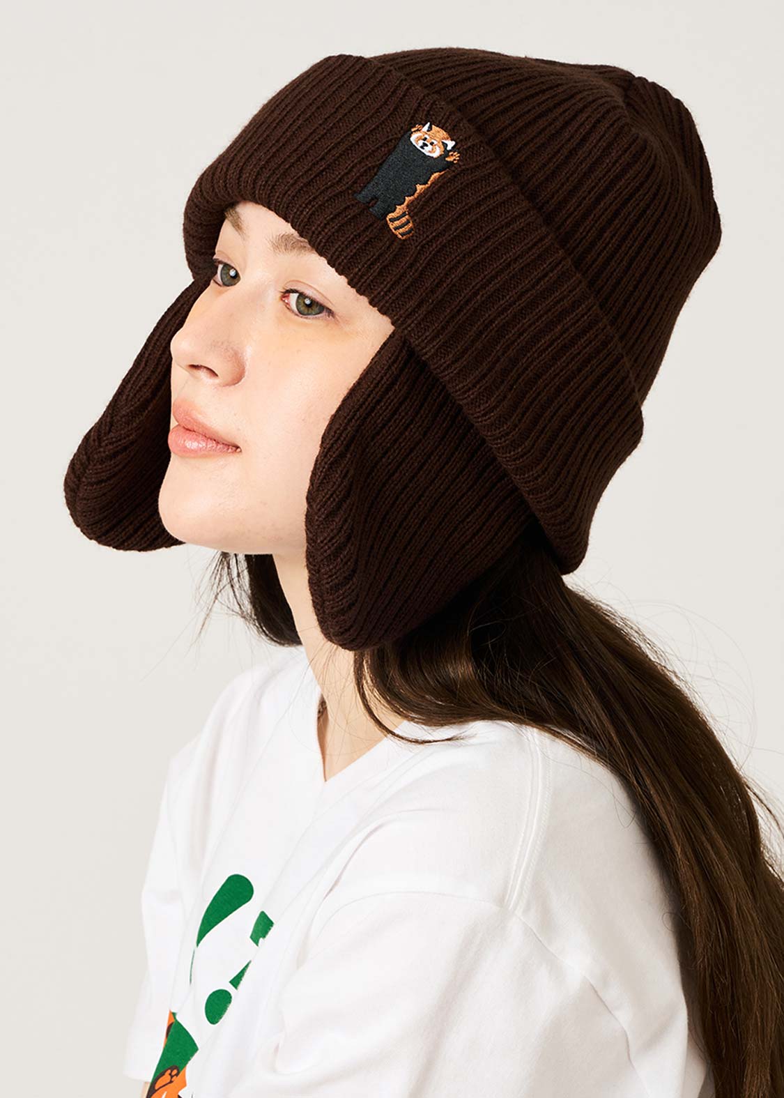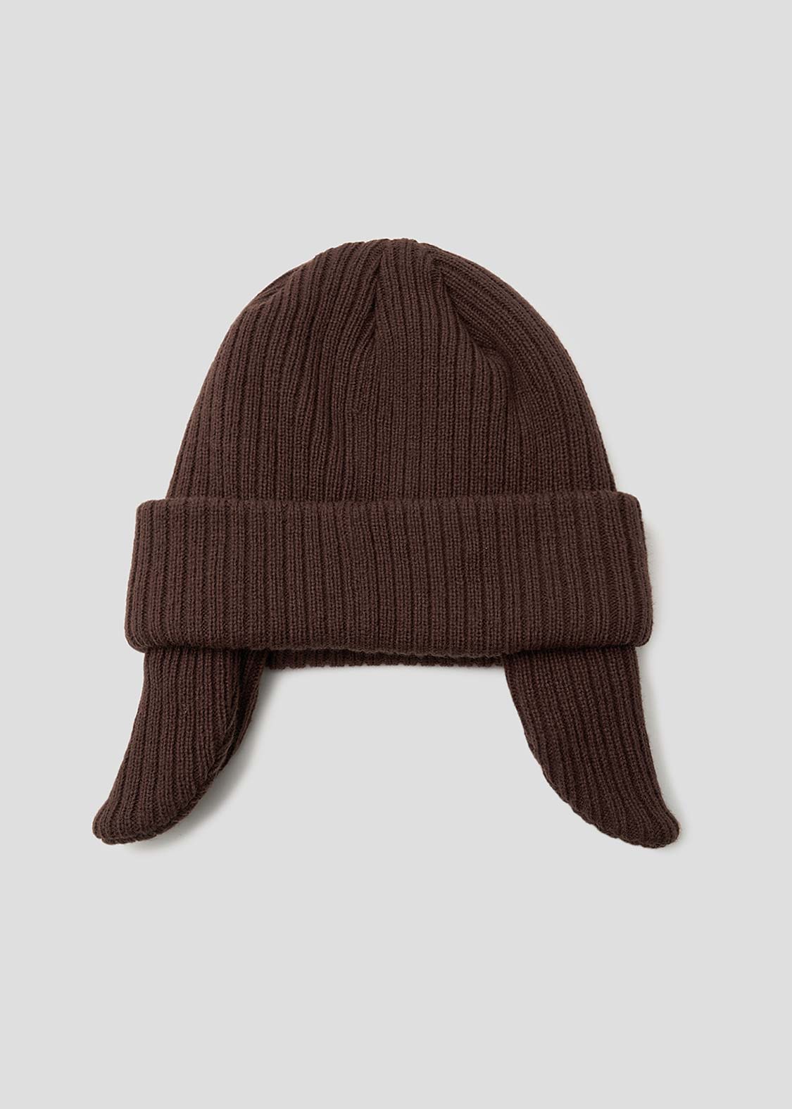 ・アクリルの糸を使用した、耳当て付きのニットキャップ。