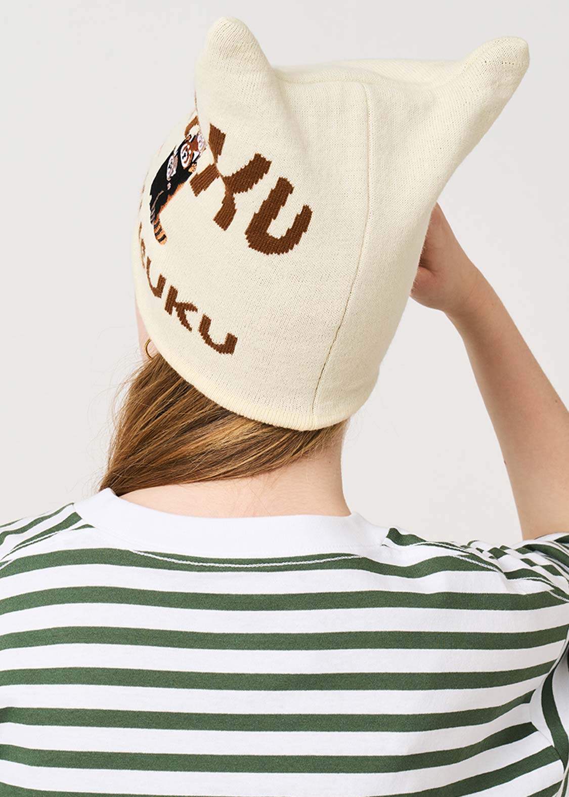 ・耳の形を表現したニットキャップ。
