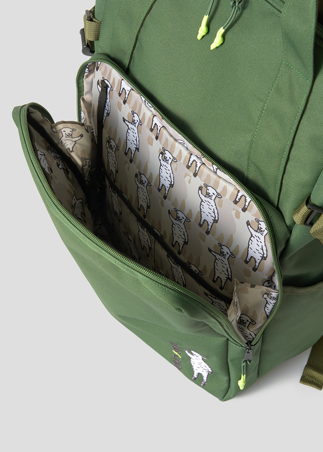 ・前面の大容量ファスナーポケットはジャバラ付きで、2つのオープンポケットとキーフック付き。