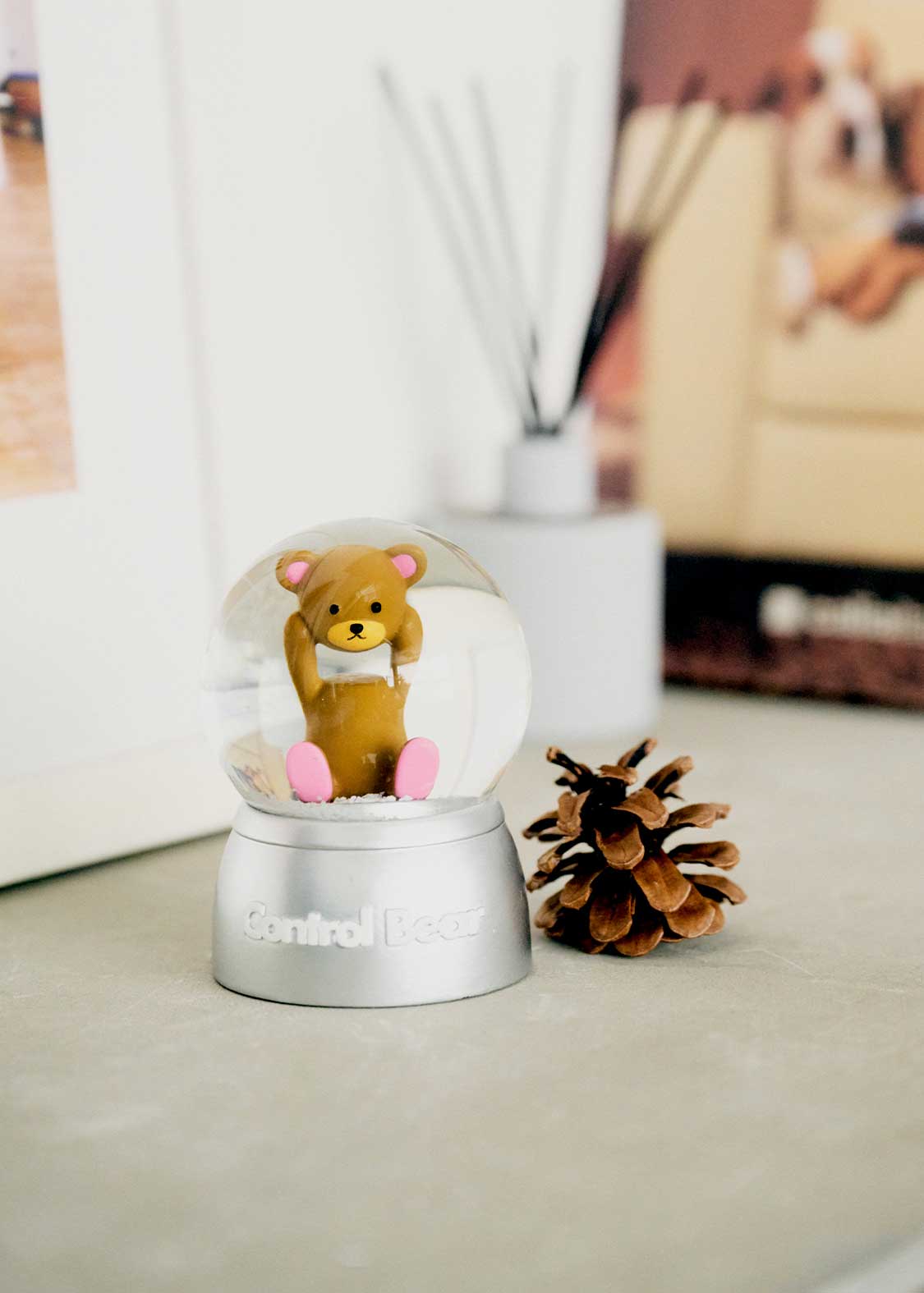 ポン!とばかりに頭をとるファニーなクマくん。ブラックなユーモアとキュートさが混じりあったインパクトのあるキャラクターです。