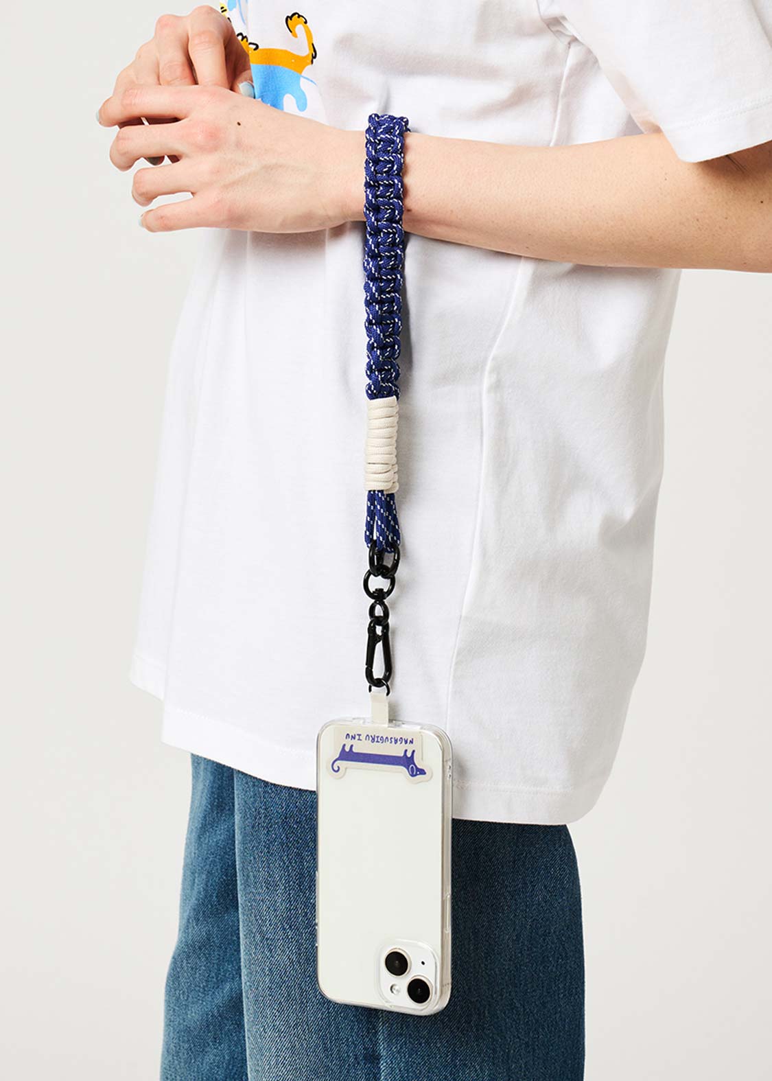 ・手首で短くスマートフォンを支えるハンドストラップ。