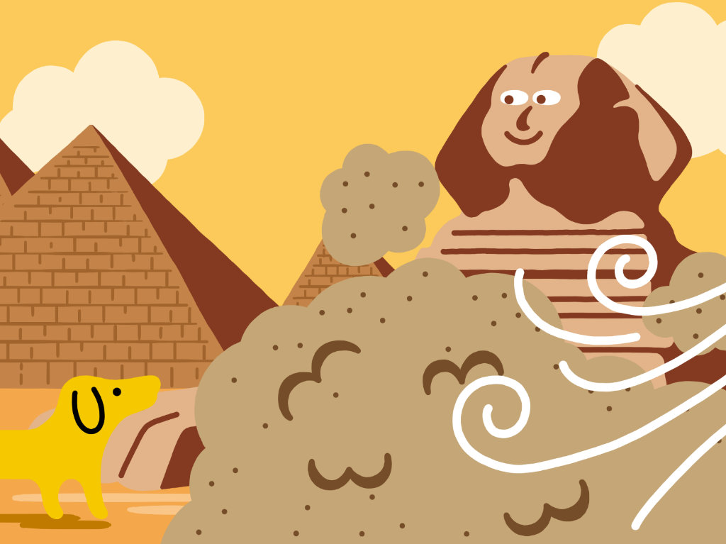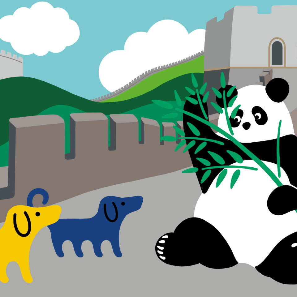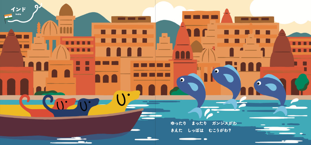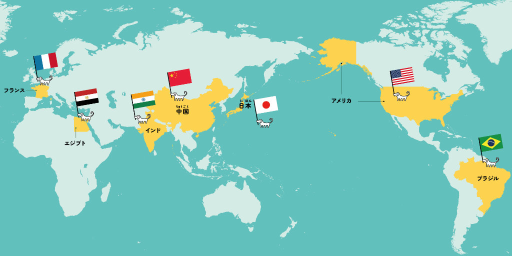 イヌたちは、しっぽを探してさまざまな国を訪れます。中国ではパンダ、エジプトではスフィンクス、パリではナガスギルネコなど、さまざまな生き物(?)たちも登場! 風景の中には、万里の長城や凱旋門など、各国を象徴する建物が描かれていて、絵本を通して、まるで世界旅行をしているような気分を味わうことができます。また、日本とは違った文化をもつ国々があることを感じることができます。